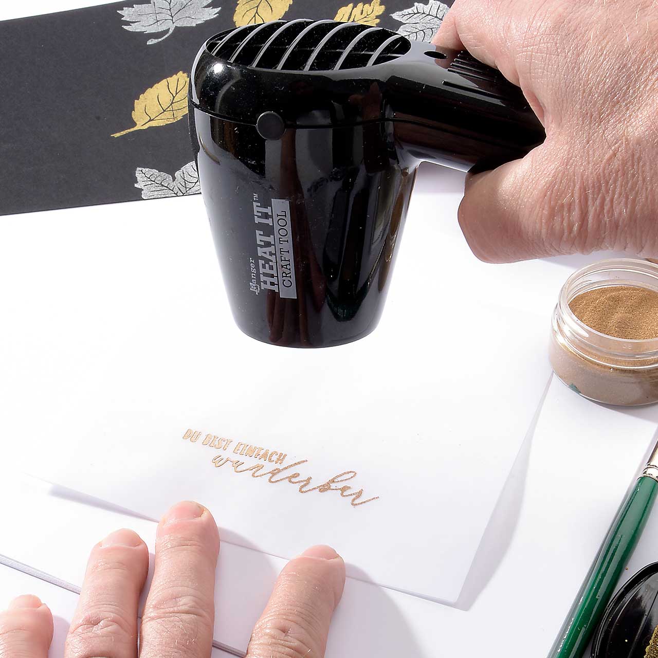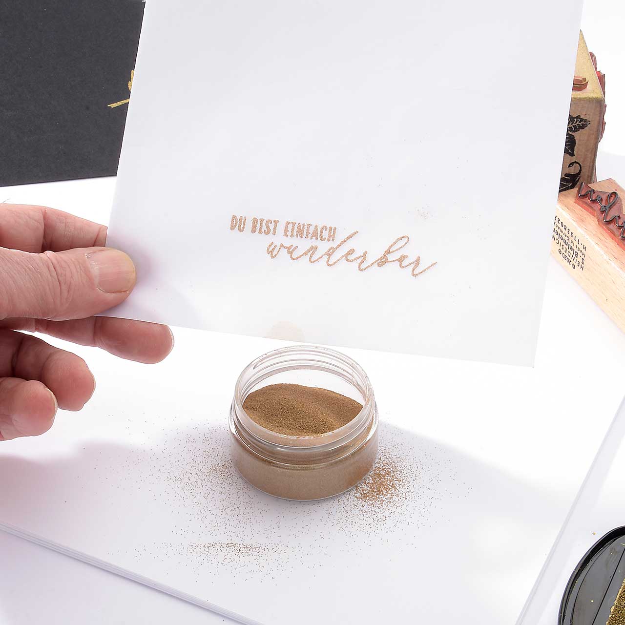 Stempeln und embossen Sie das „Du bist einfach wunderbar“ Textmotiv mit dem goldenen Sternenstaub auf das Amadeo Transparentpapier.