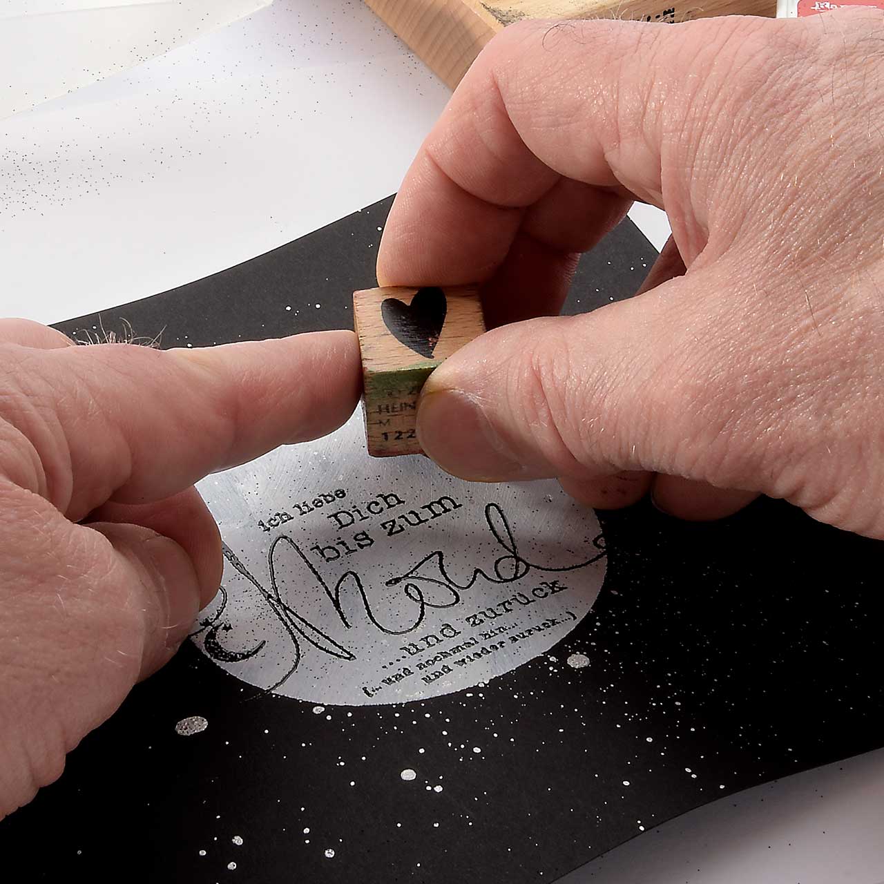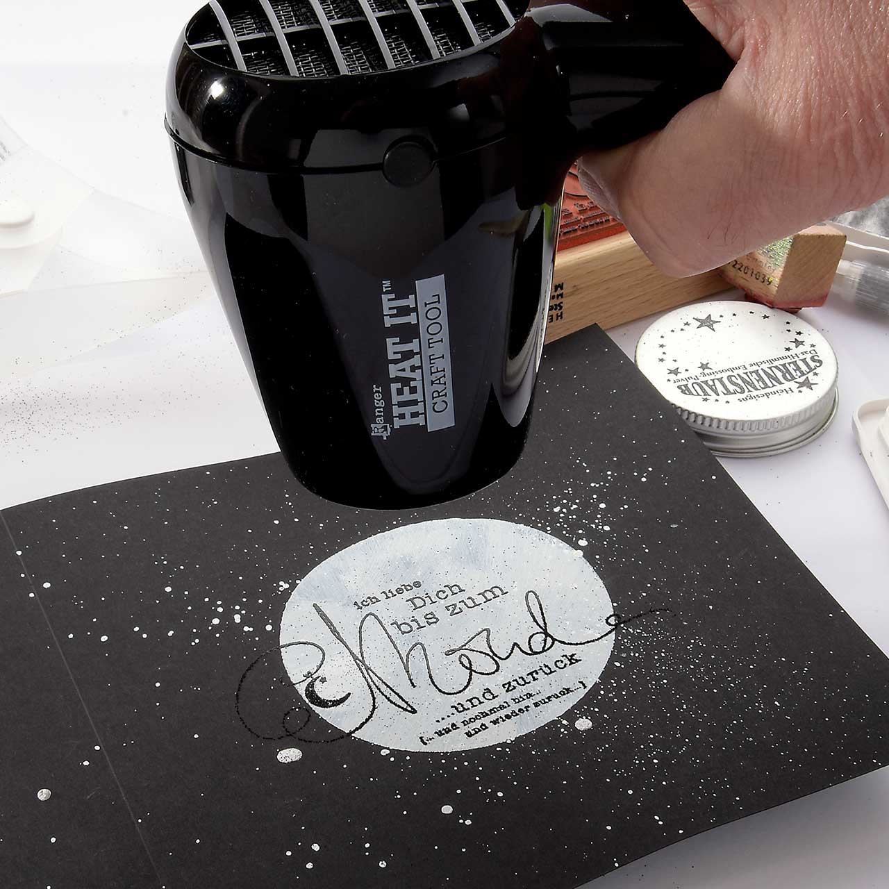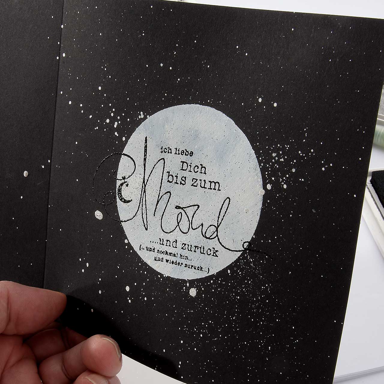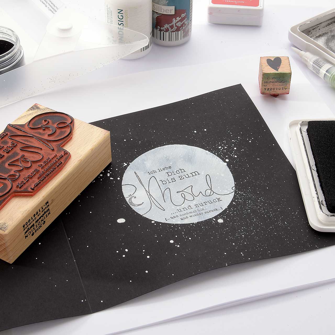 Stempeln und Embossen Sie das „Ich liebe Dich bis zum Mond ...“-Textmotiv mit dem schwarzen Sternenstaub auf die weiß-silberne Kreisfläche Ihrer Karte.