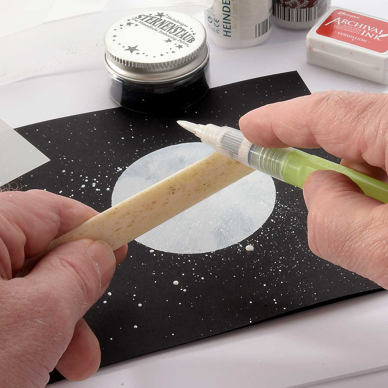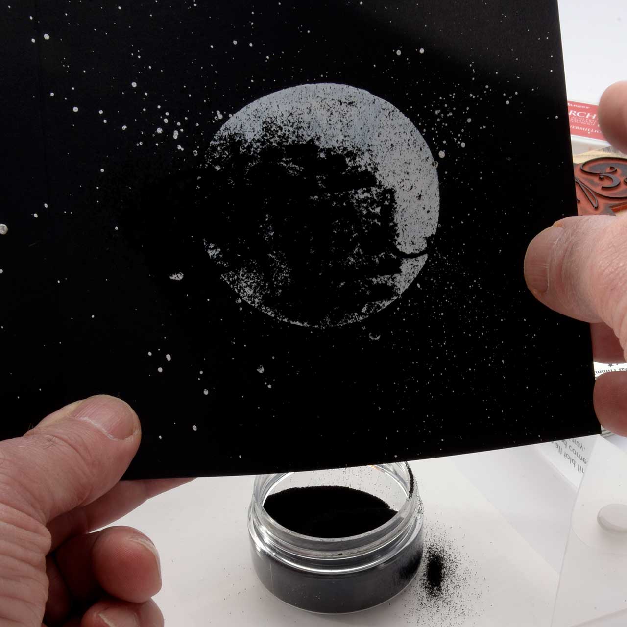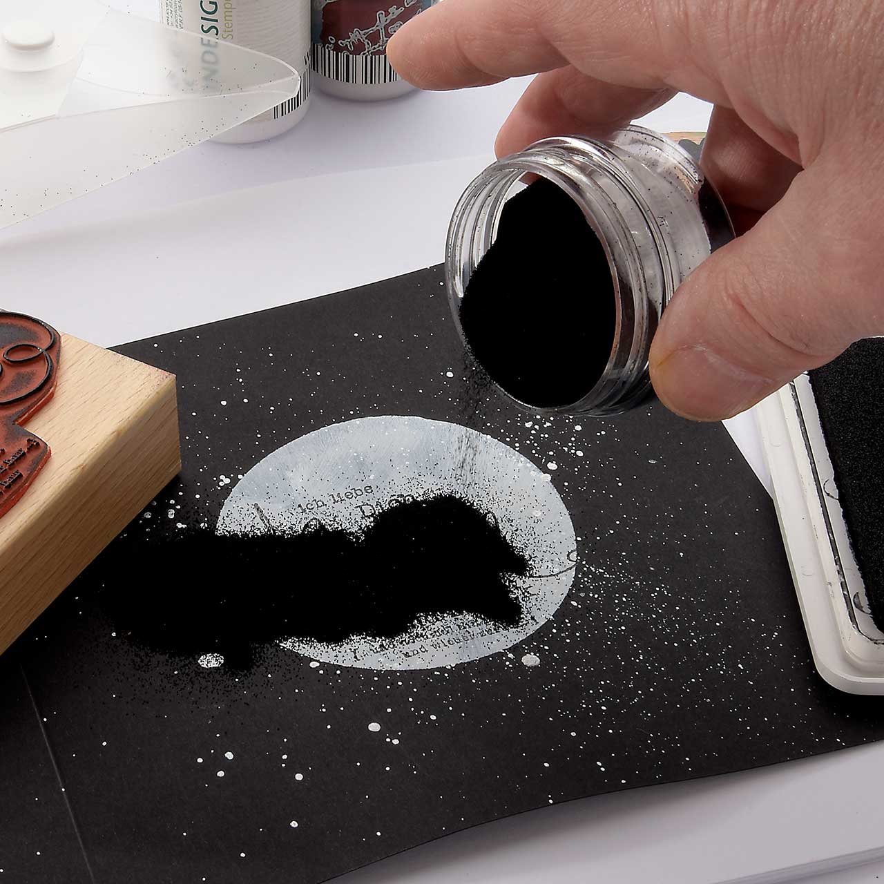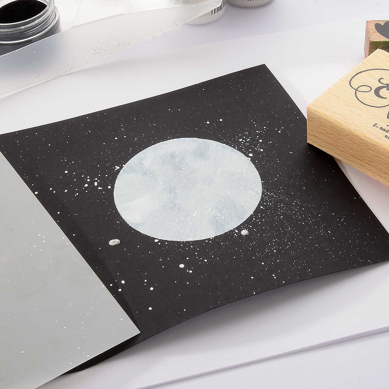 Stempeln und Embossen Sie das „Ich liebe Dich bis zum Mond ...“-Textmotiv mit dem schwarzen Sternenstaub auf die weiß-silberne Kreisfläche Ihrer Karte.