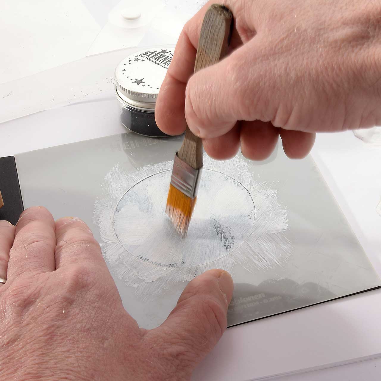 Malen Sie zu der weißen Fläche (mit dem gleichen Pinsel) noch silberne Acrylfarbe hinzu.