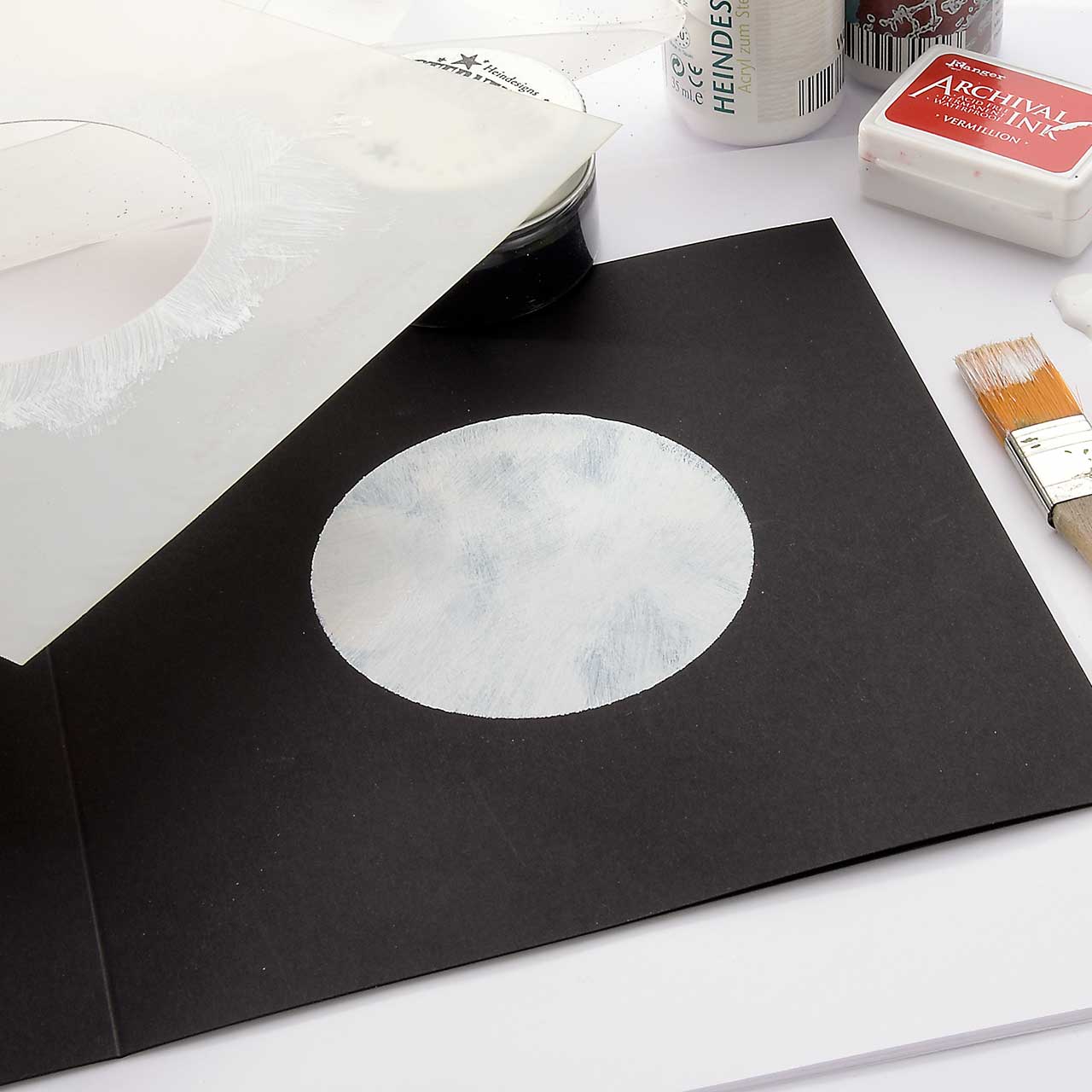 Positionieren Sie Ihre Kreis-Schablone auf der rechten Seite Ihrer schwarzen Amadeo Doppelkarte. Malen Sie mit dem Flachpinsel und der weißen Acrylfarbe die Kreisfläche in der Schablone aus. Ziehen Sie dabei die Farbe vom Rand der Schablone zur Mitte.