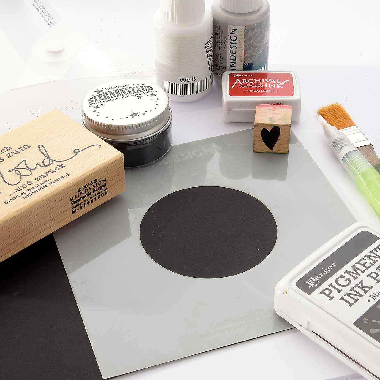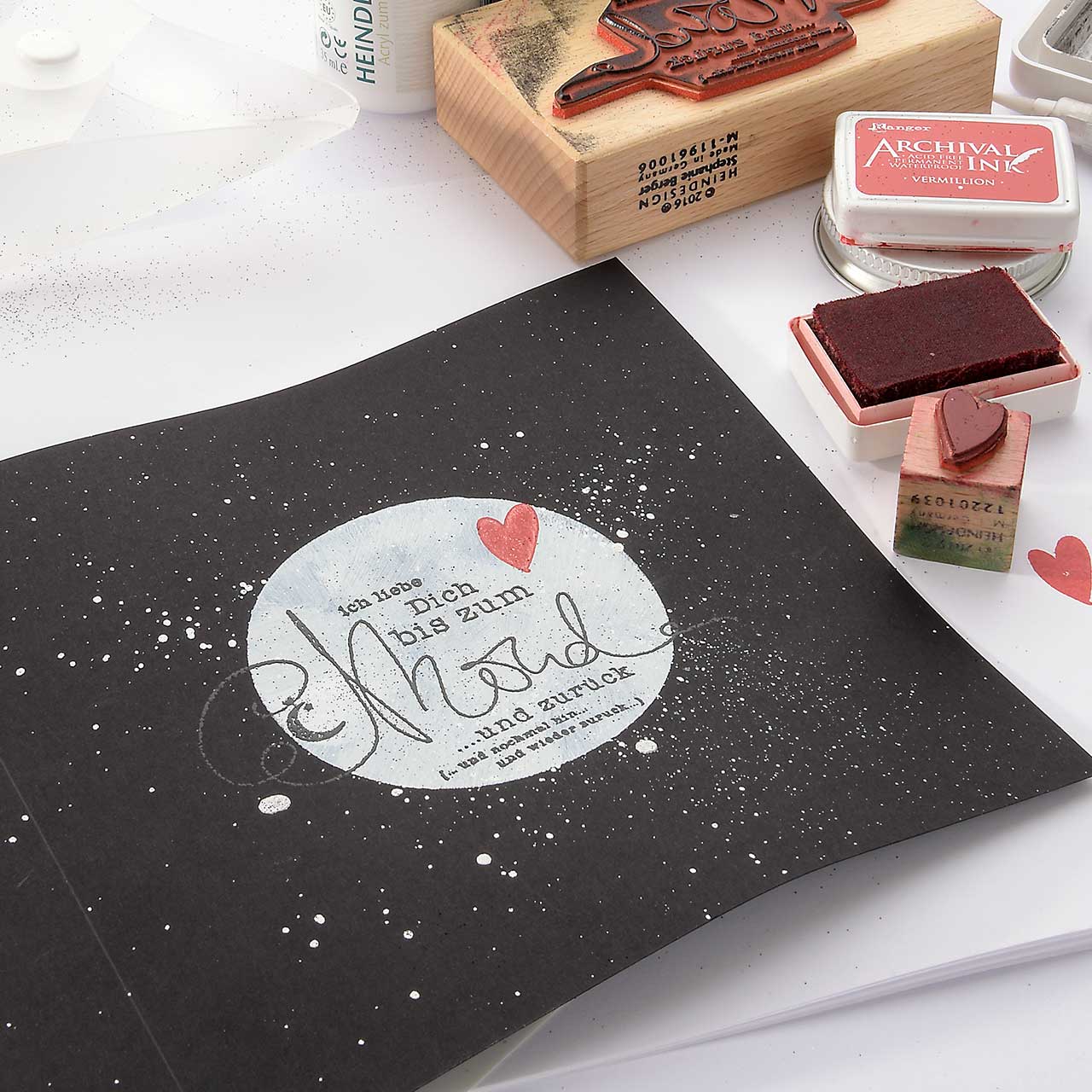 Stempeln Sie das kleine Herz Motiv mit dem roten Archival Ink Stempelkissen rechts oberhalb des Textmotives.