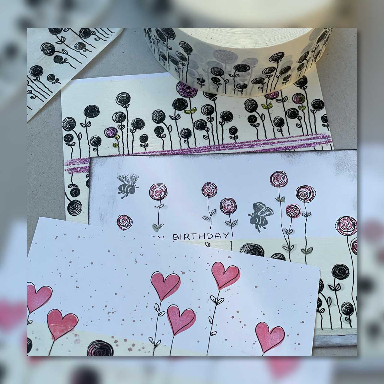Die dekorativen Bänder lassen sich bestempeln, mit Farb- und Filzstiften, Aquarellfarben, Effektlinern bemalen – einfach alles, was auf Papier ebenfalls funktioniert.