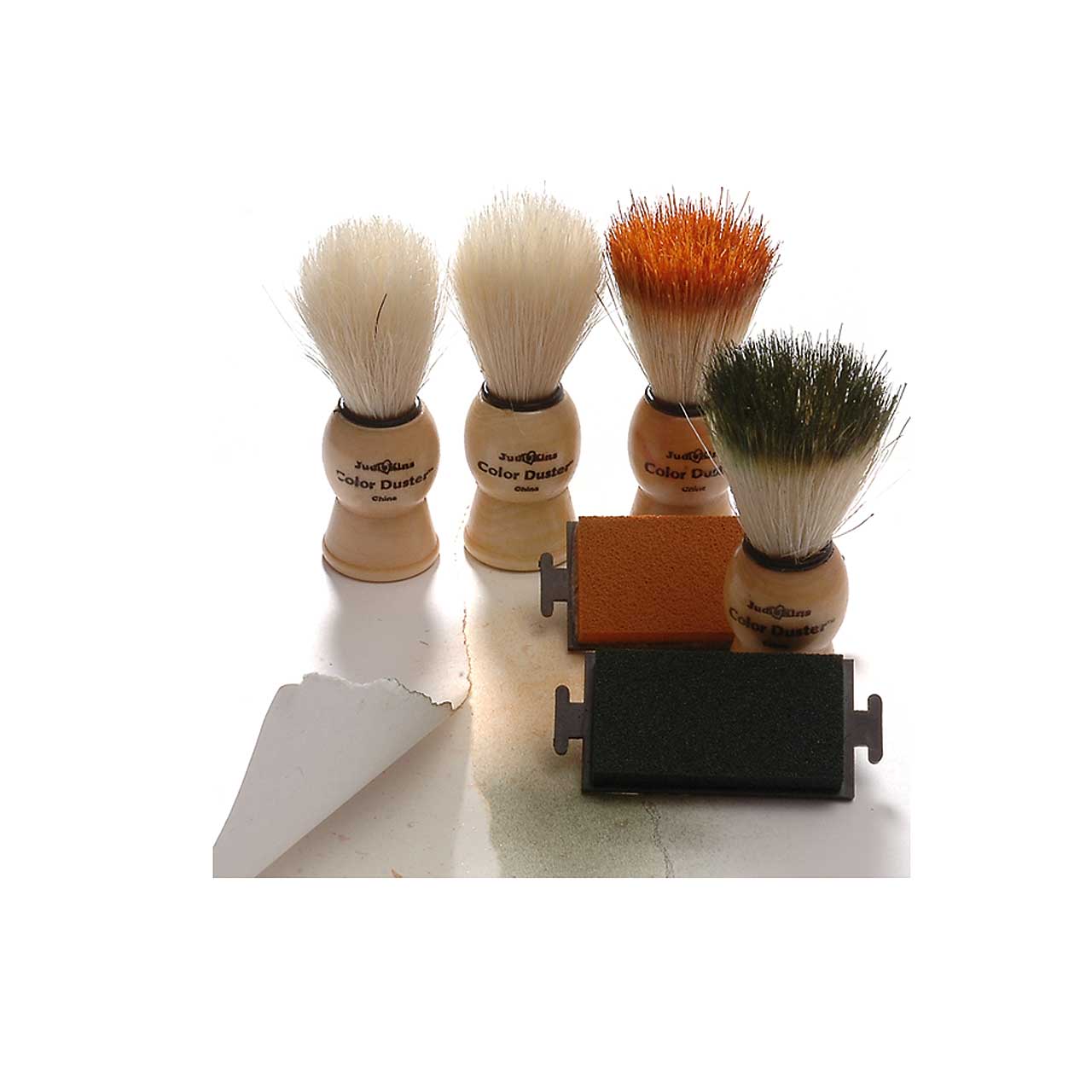 Color Duster sind kleine dicke Pinsel vier Stück an der Zahl. Da haben Sie für mehrere Farben Pinsel zur Hand ohne sie gleich bei jedem Farbwechsel sauber machen zu müssen. Mit Color Dustern nehmen Sie Farbe aus einem Stempelkissen auf und bestäuben so Ihre Karte mit einem leichten Farbnebel.