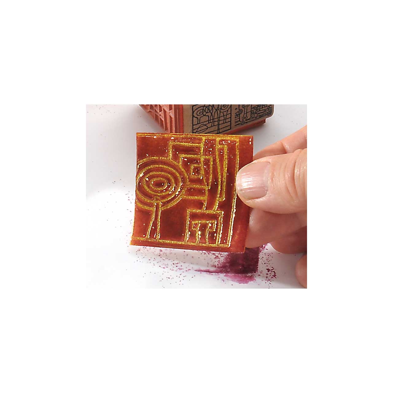 Es läßt sich in mehreren Schichten auftragen, um verschiedenartige Oberflächen zu erzielen. Ein bis zwei Schichten ergeben - je nachdem, wie lange Sie das Amazing Glaze erhitzen - eine rauhe steinartige oder perlig glänzende Oberfläche. Drei bis vier Schichten ergeben eine dicke, fast kachelartige Oberfläche. Das Amazing Glaze ist klar und wird mit anderen Embossing Pulvern während der Verarbeitung eingefärbt, besonders gut wirkt hier Sternenstaub mit Glitzer. So lange das Glaze noch heiß und weich ist, kann man einen Stempel in die Masse drücken und erzielt so ein schönes Relief.