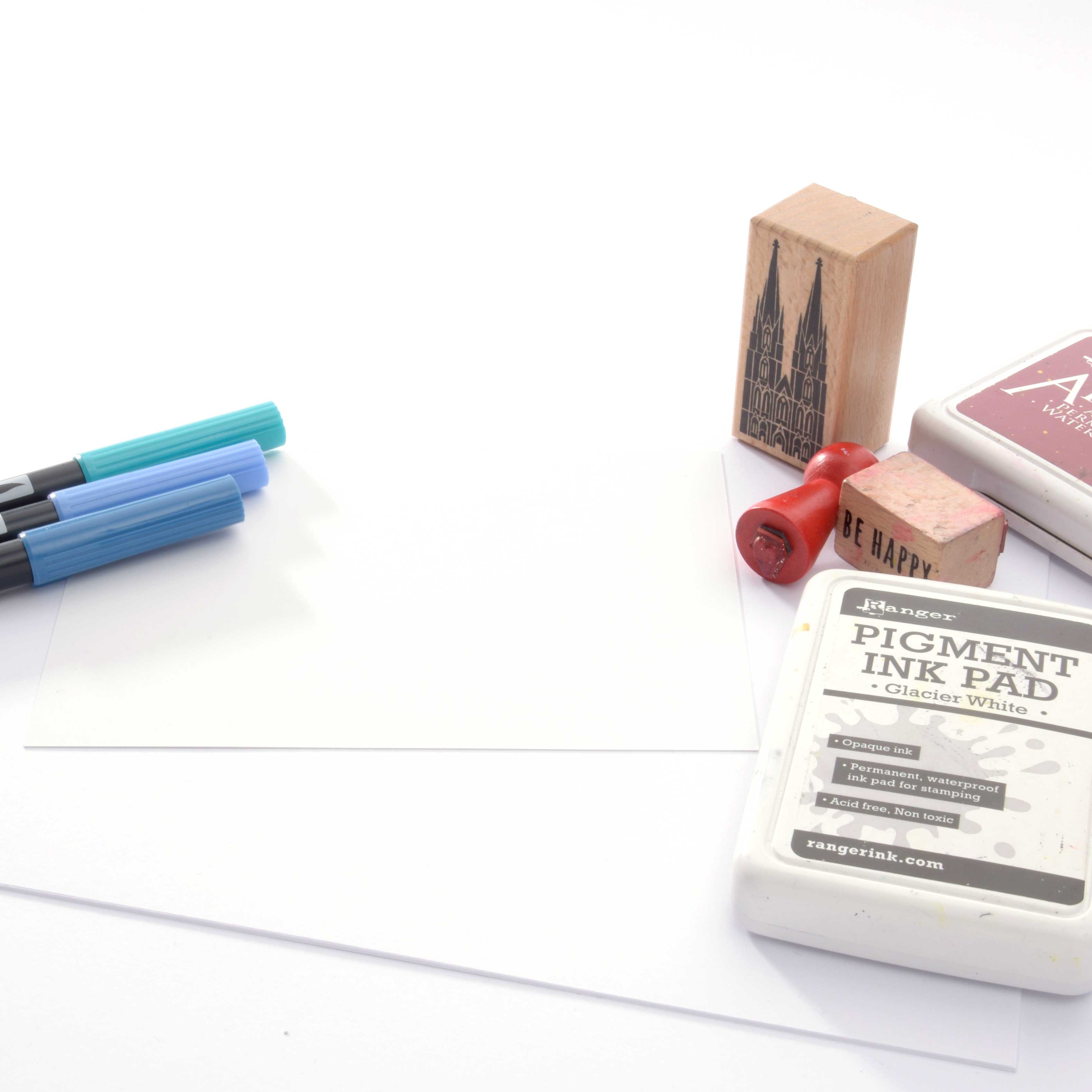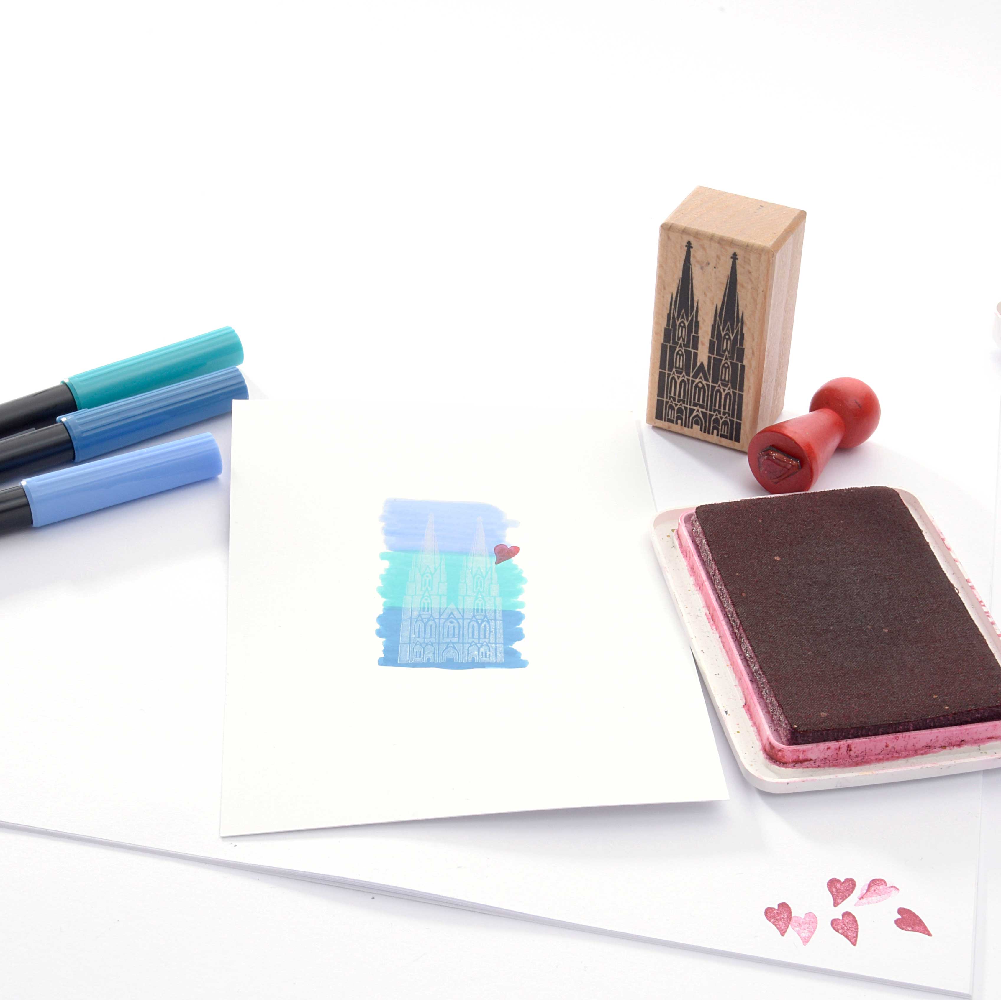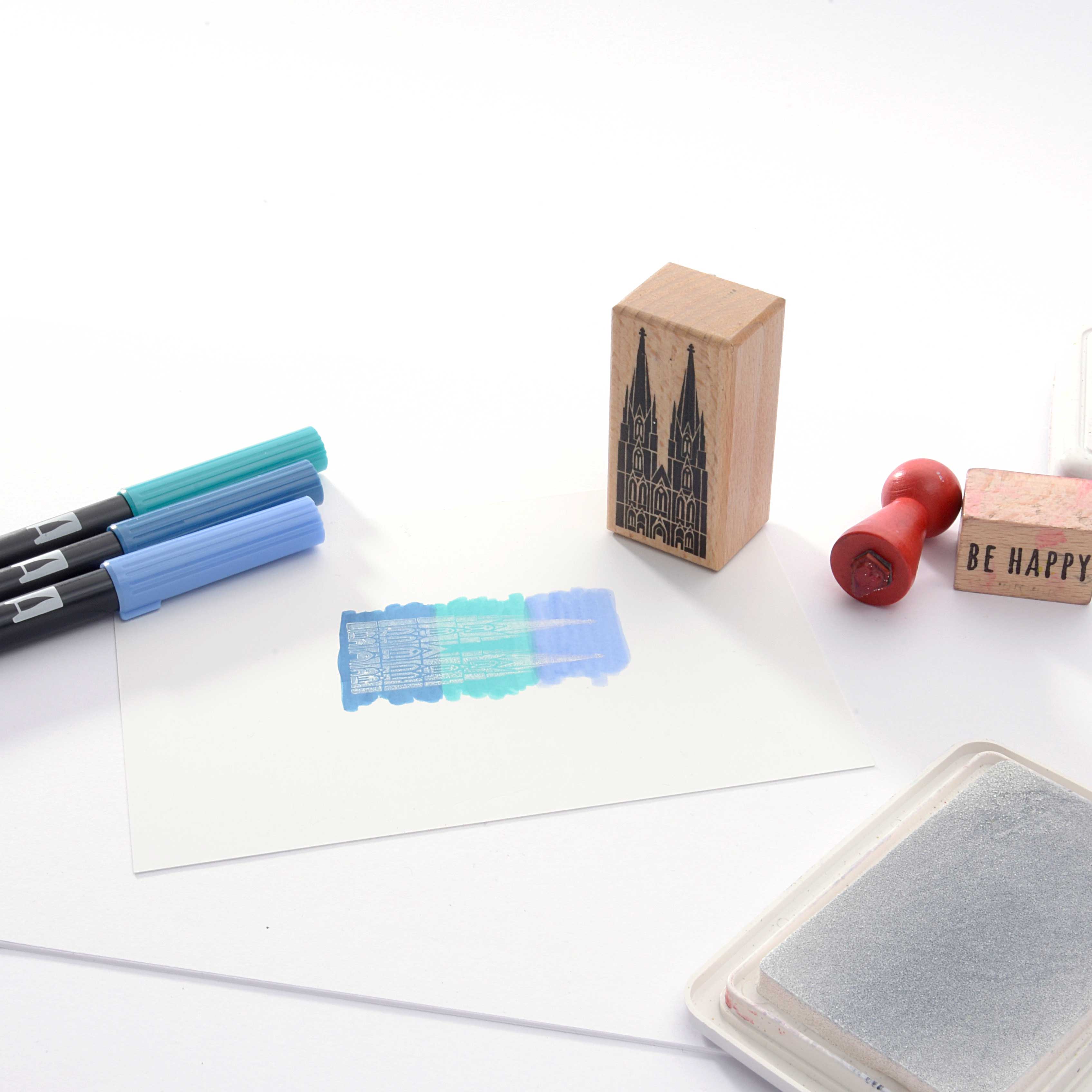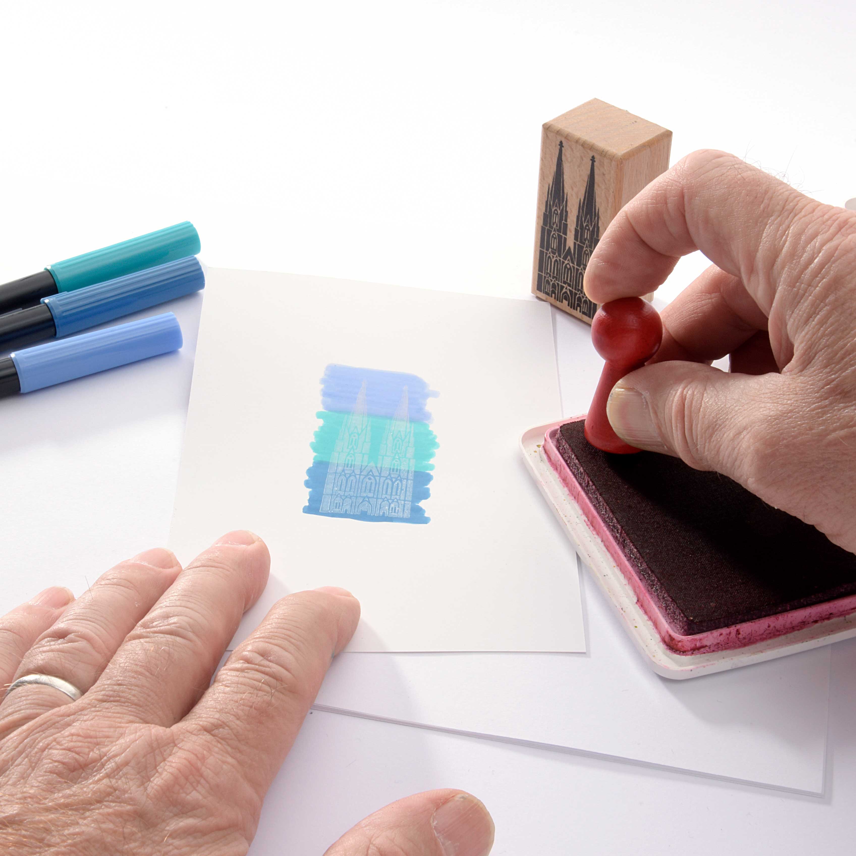 Stempeln Sie das Kölner Dom Motiv mit dem weißen Pigment Stempelkissen auf die blaue Fläche.