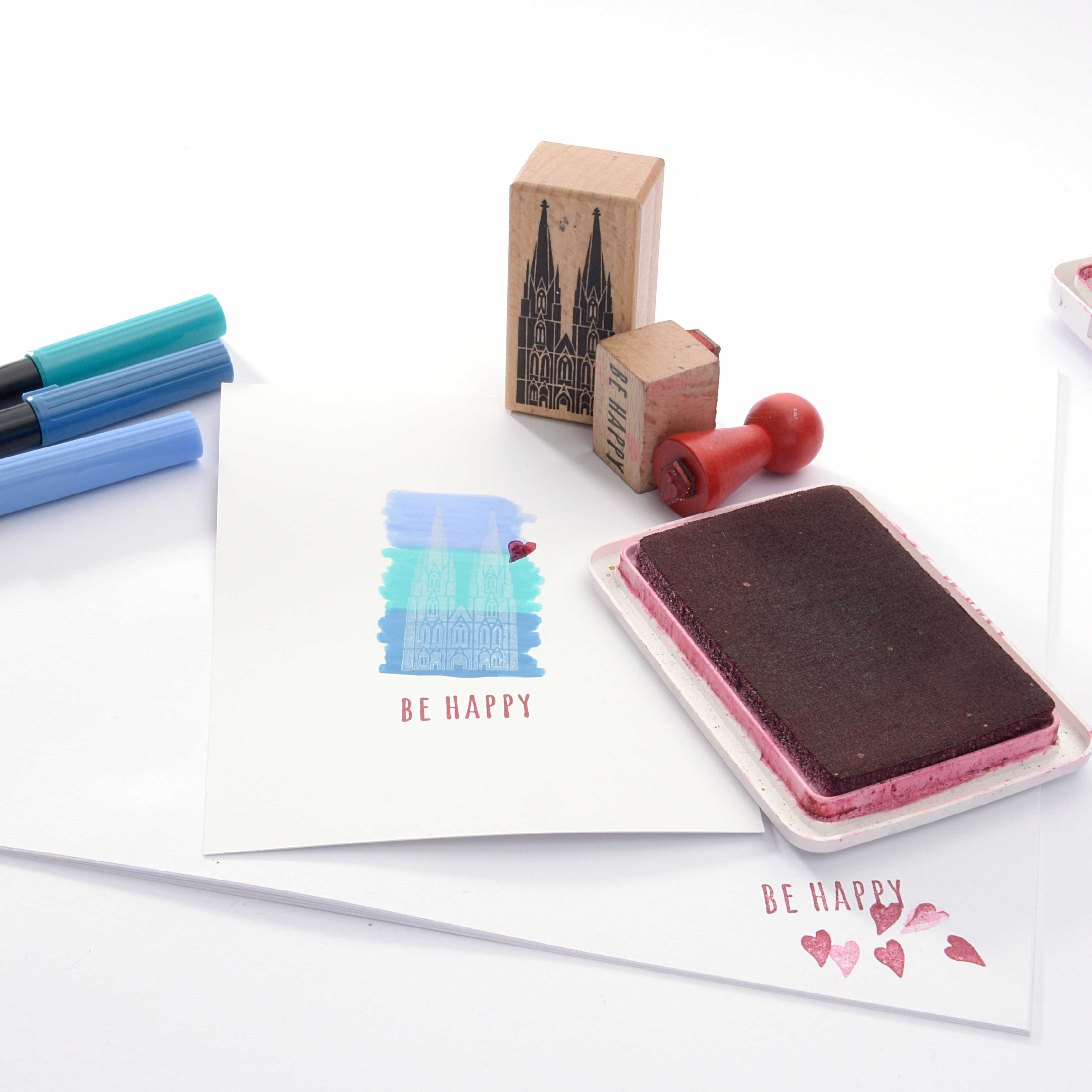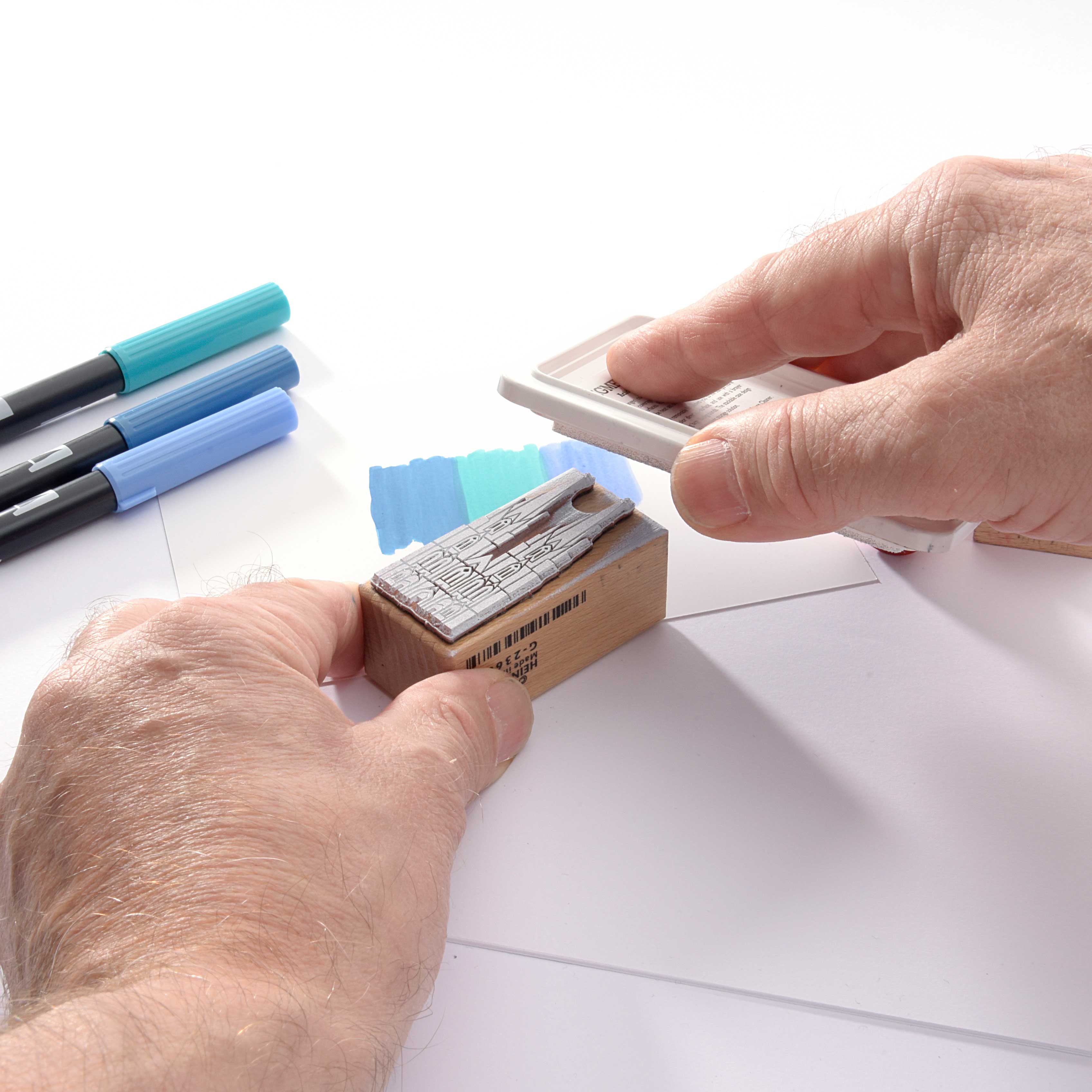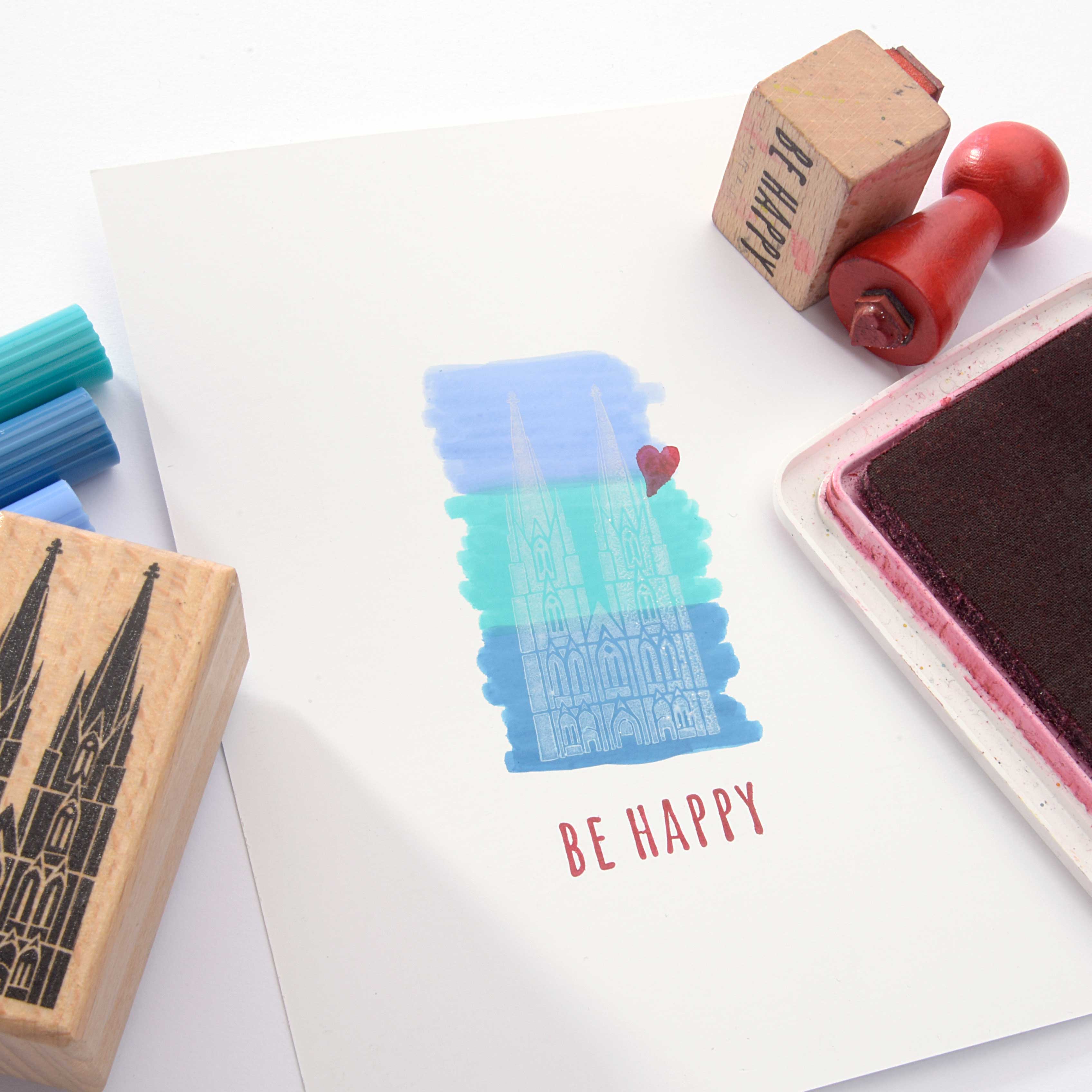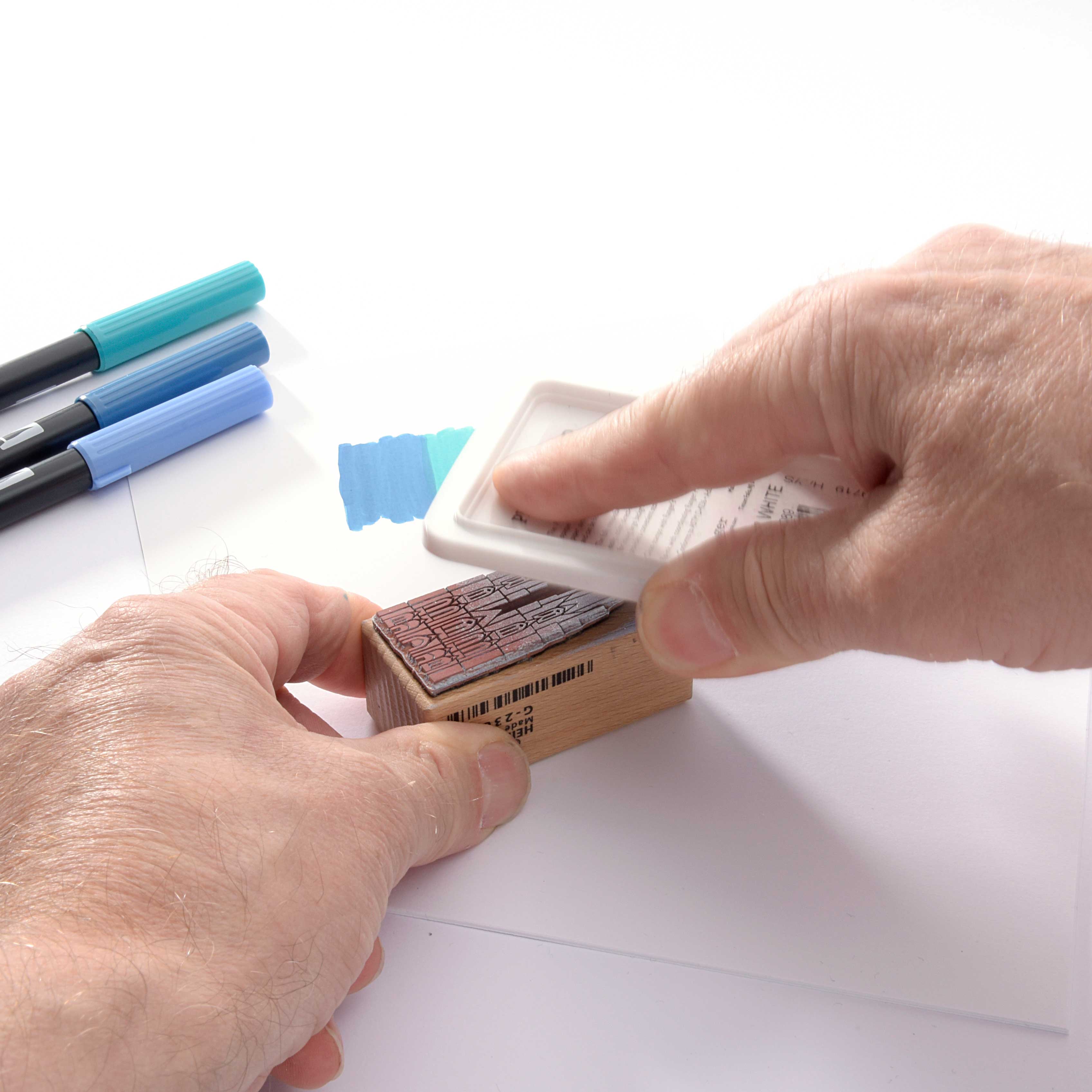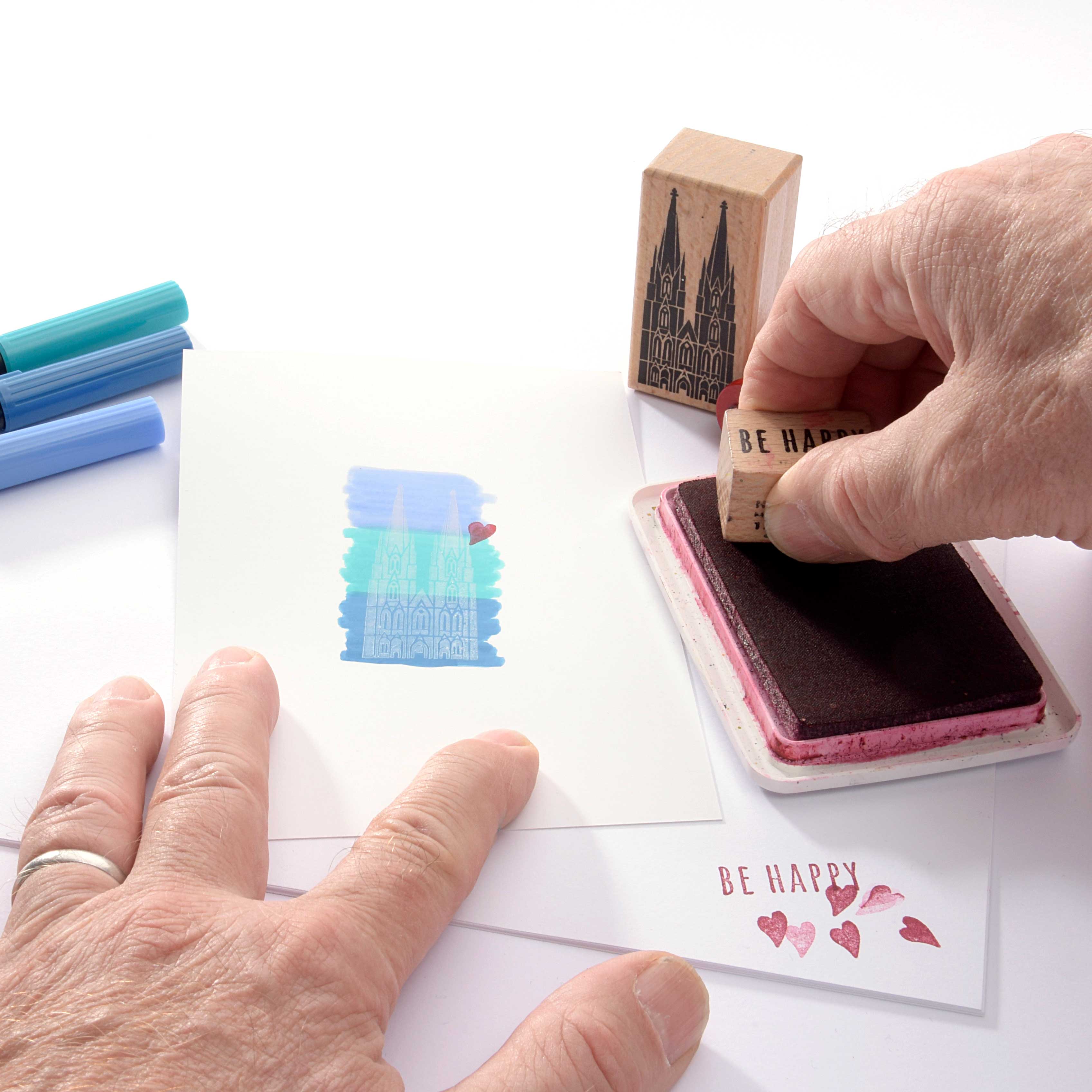 Stempeln Sie das Kölner Dom Motiv mit dem weißen Pigment Stempelkissen auf die blaue Fläche.