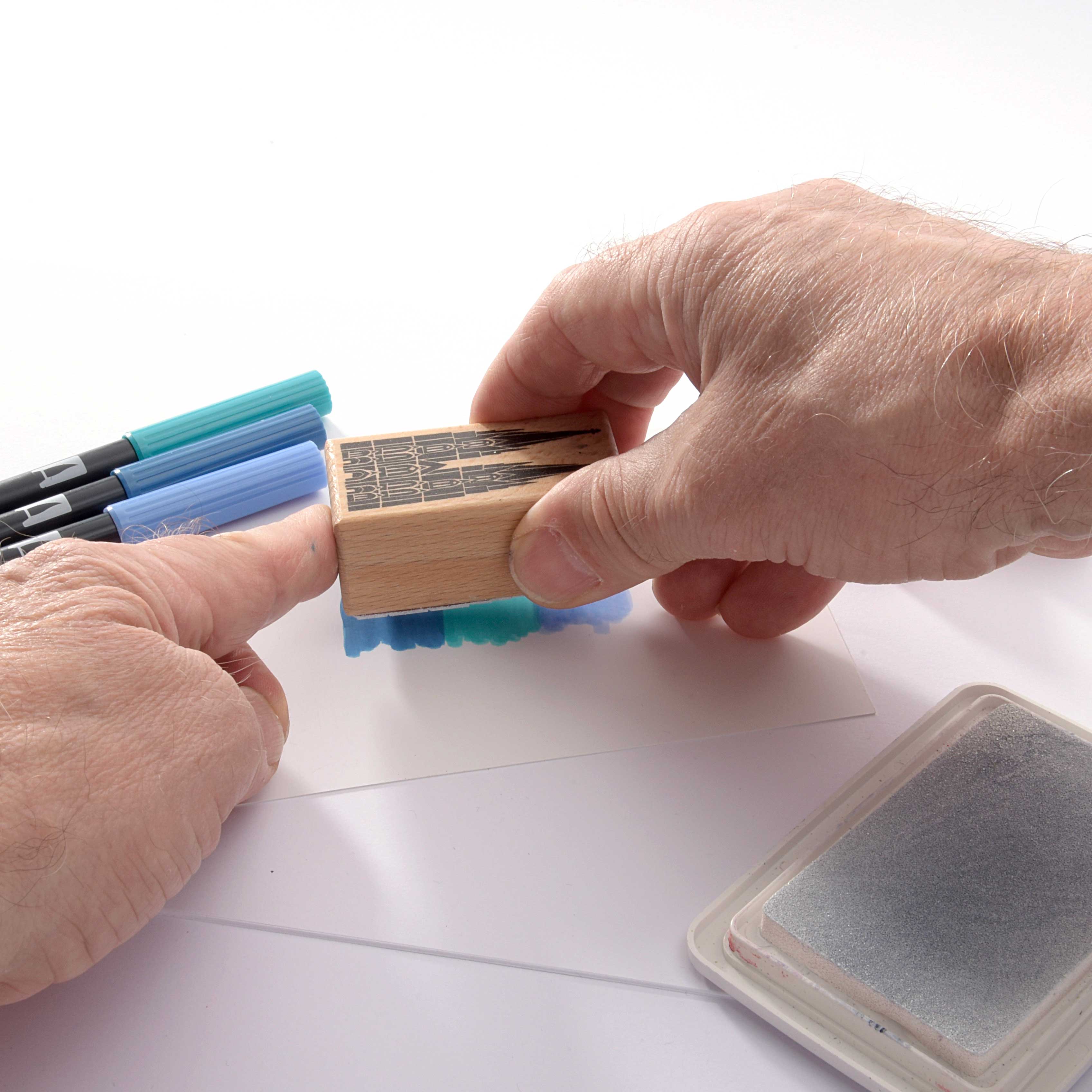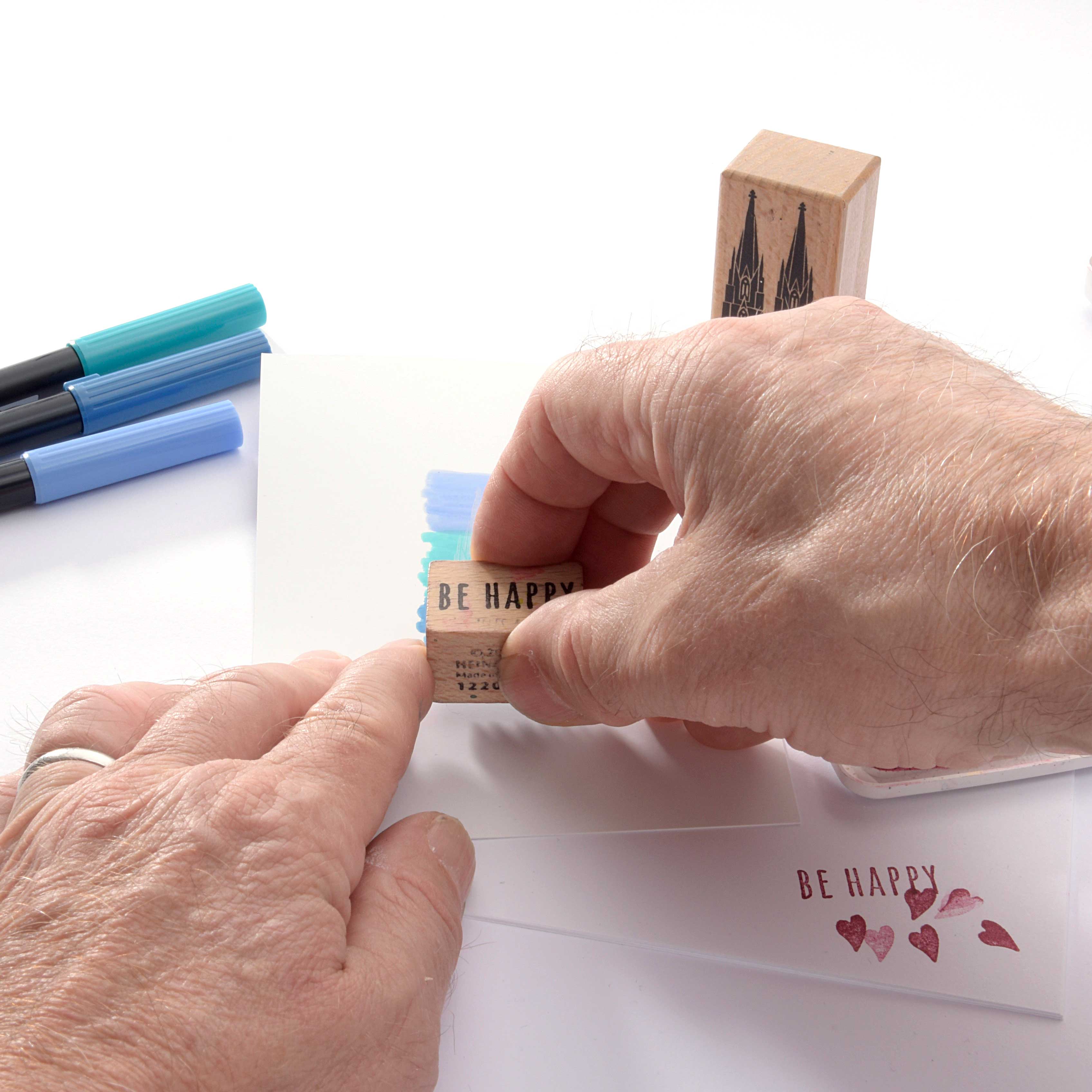 Stempeln Sie das „Be Happy“ Textmotiv mit dem roten Archival Ink Stempelkissen unter die blaue Fläche.
