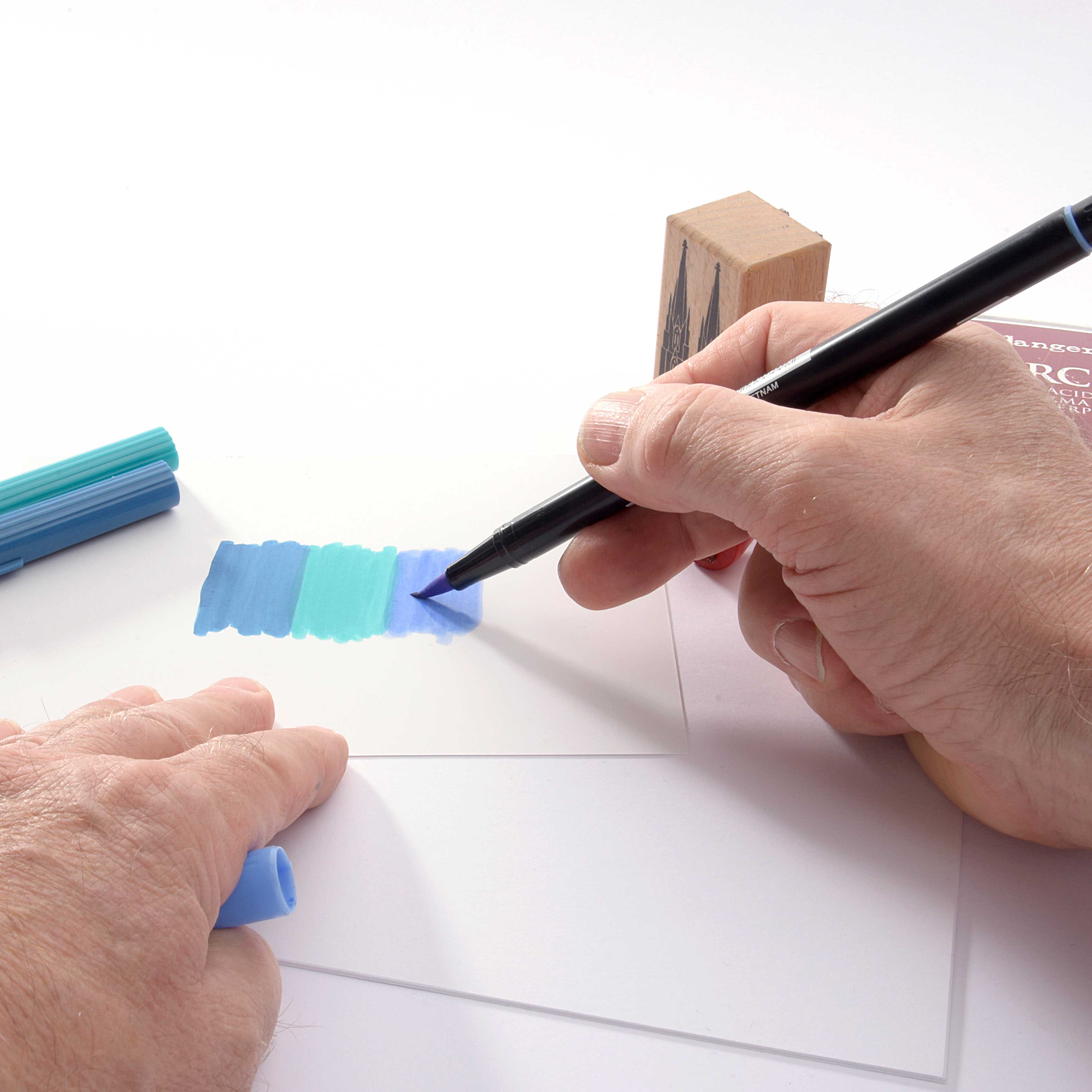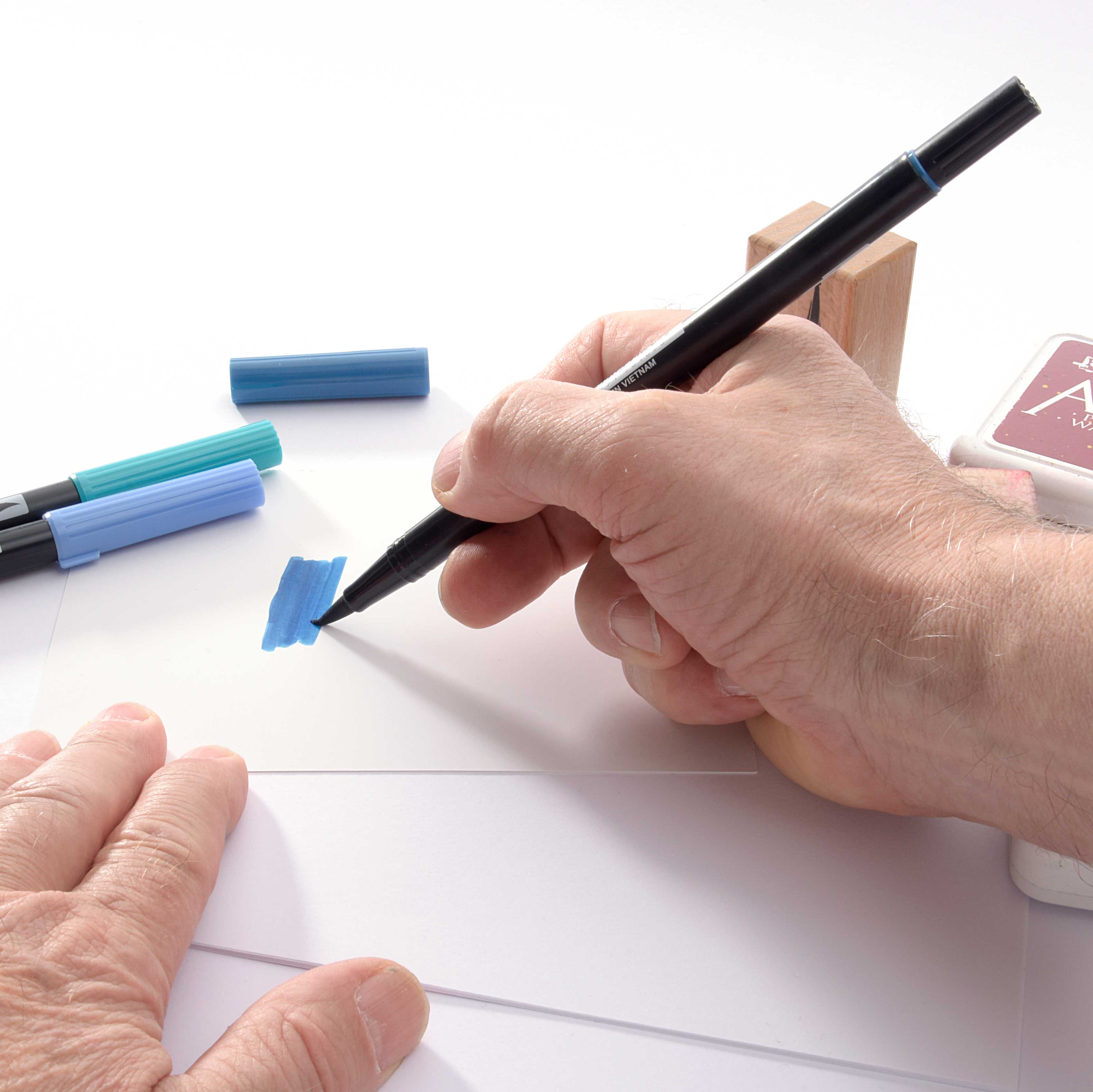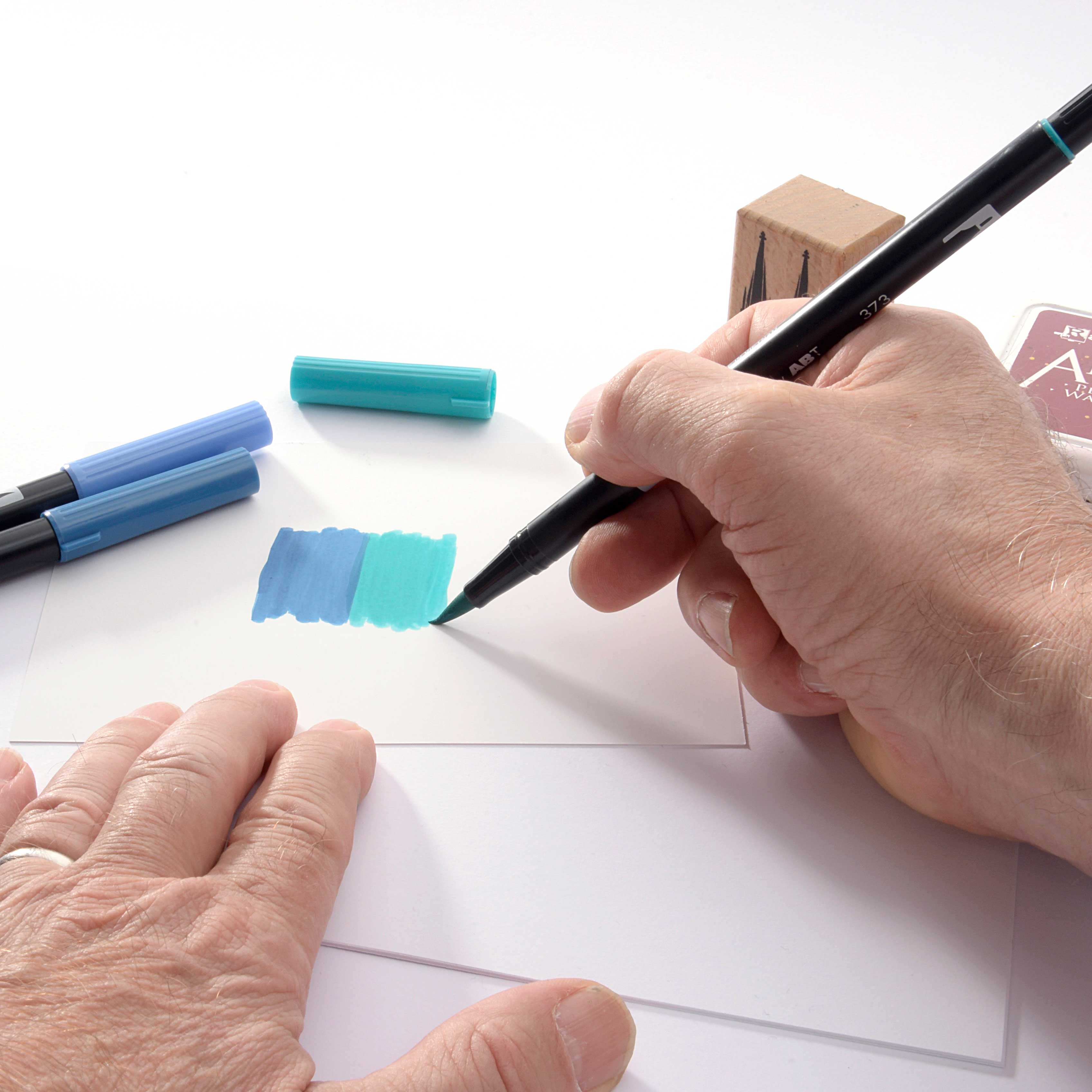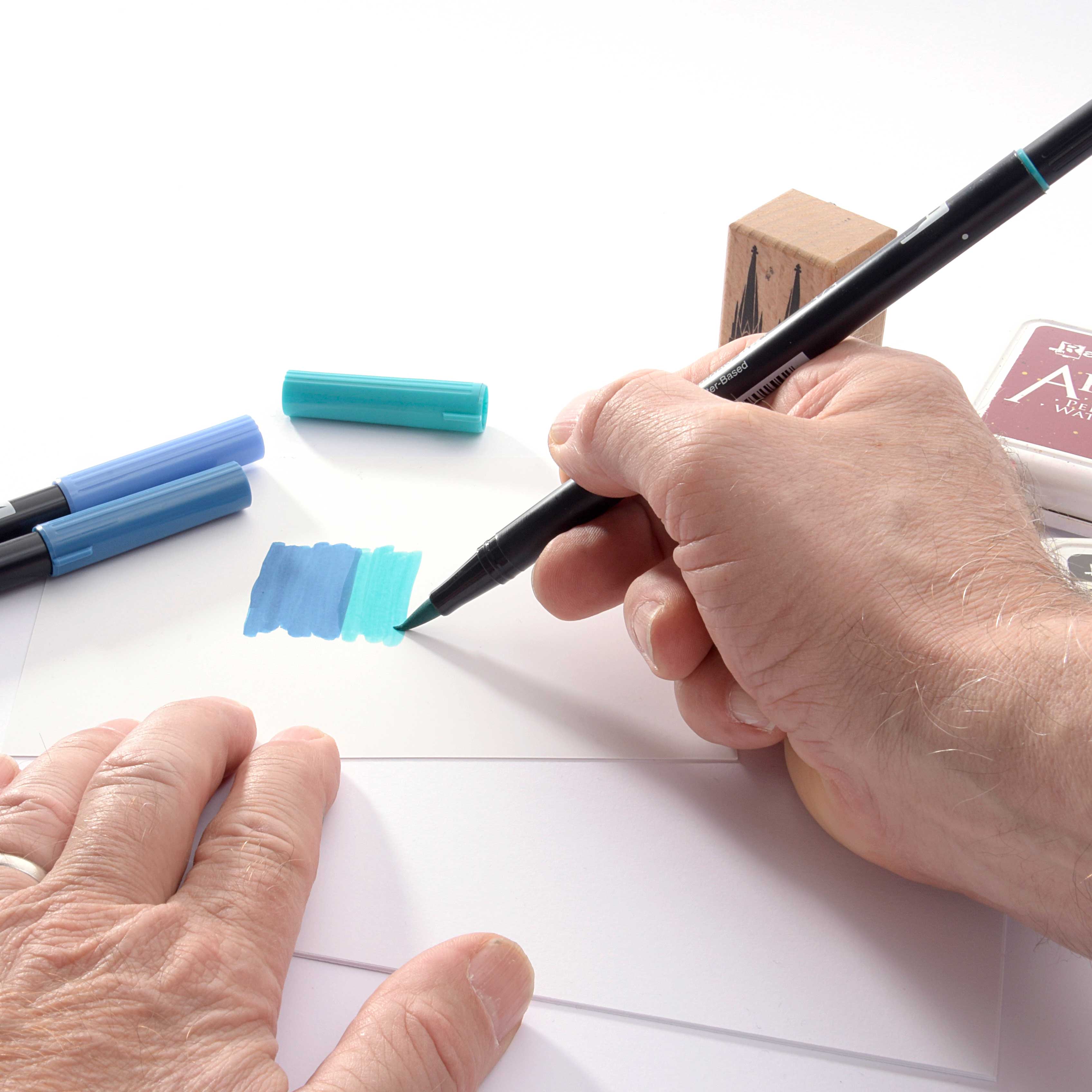 Malen Sie mit den Tombow Dual Brushpen mit den drei blauen Farben je etwa 4 cm breite Flächen.