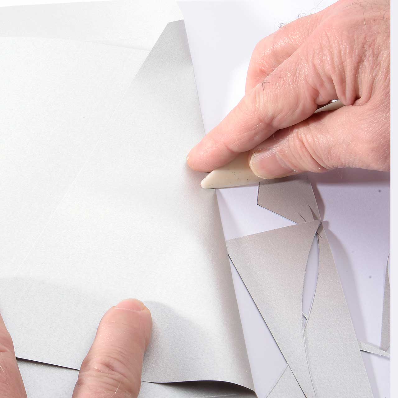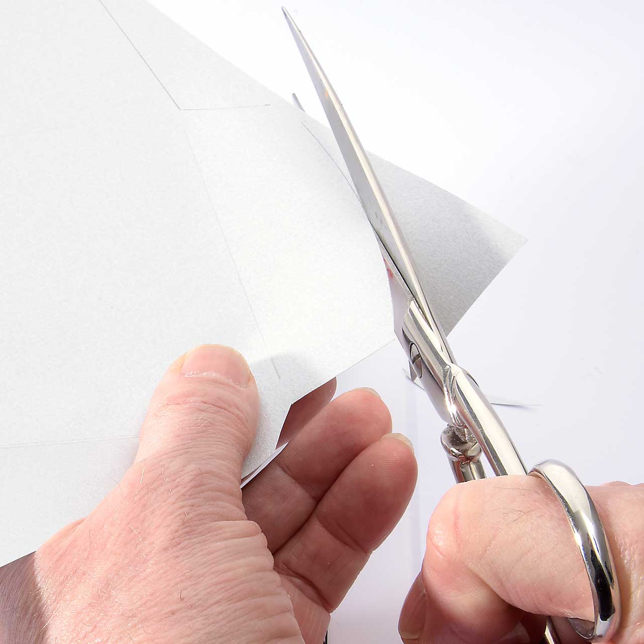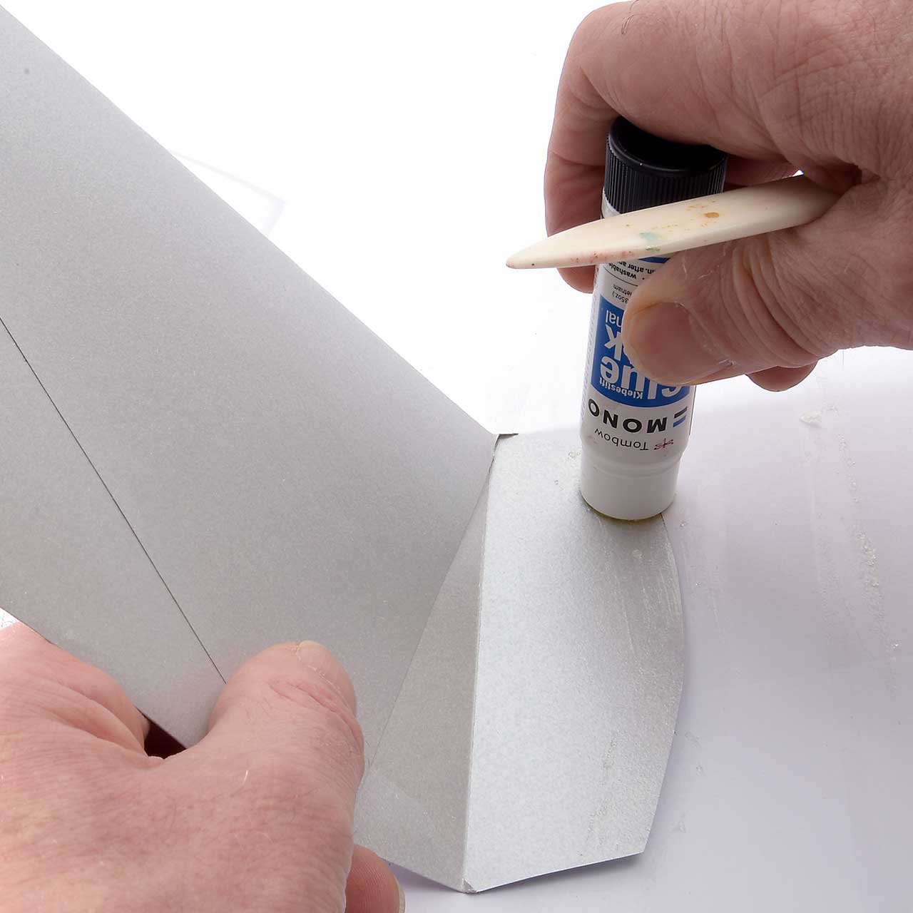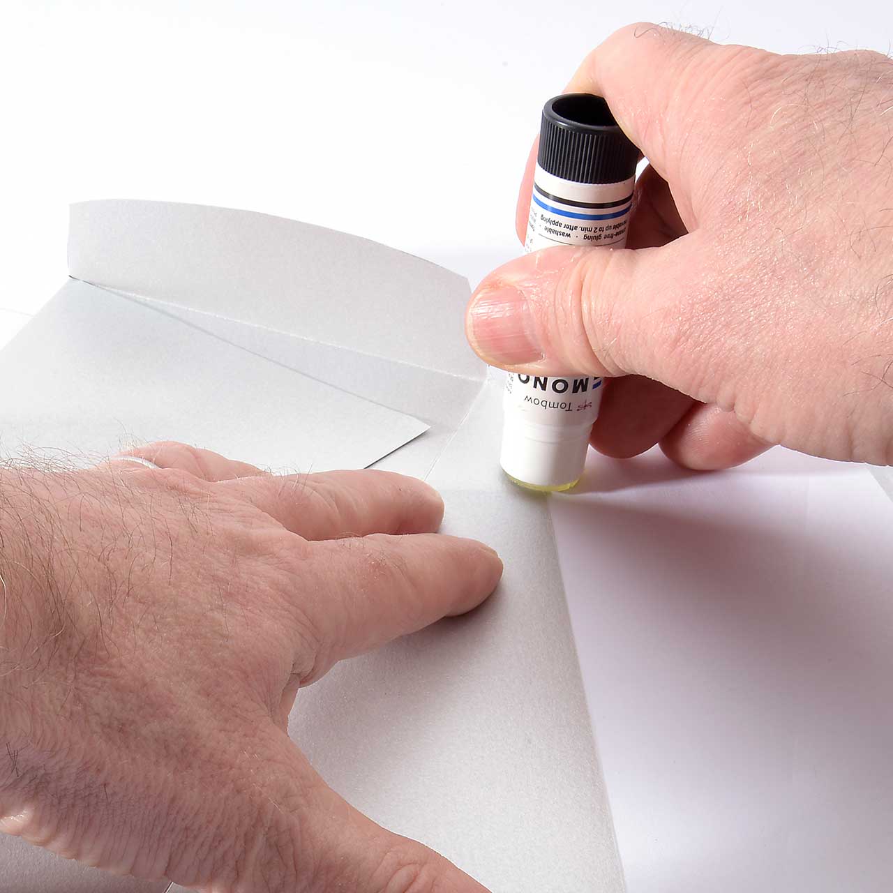Ziehen Sie den Umriss der Schablone mit einem Bleistift nach und fahren Sie mit einem Falzbein oder einem stumpfen Stift durch die Schlitze. Nun wird das Papier entlang der Bleistiftlinie ausgeschnitten und die Seitenlaschen nach innen gefaltet. Nutzen Sie den Kleberoller um die Laschen aneinander zukleben.