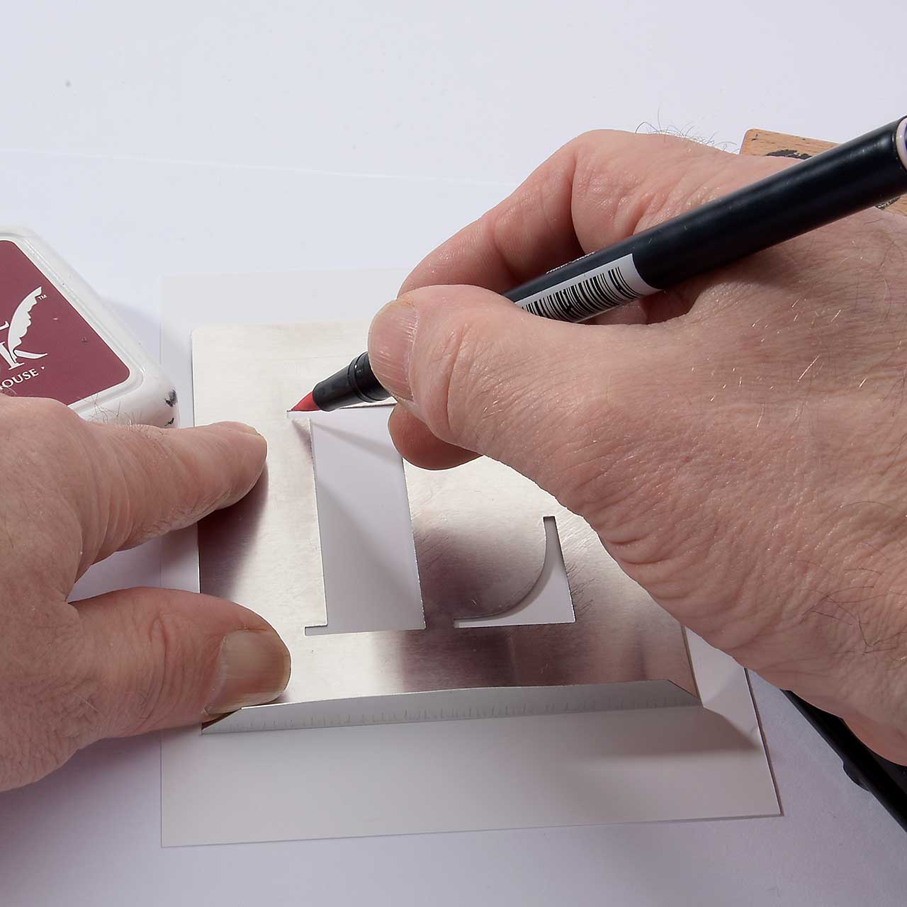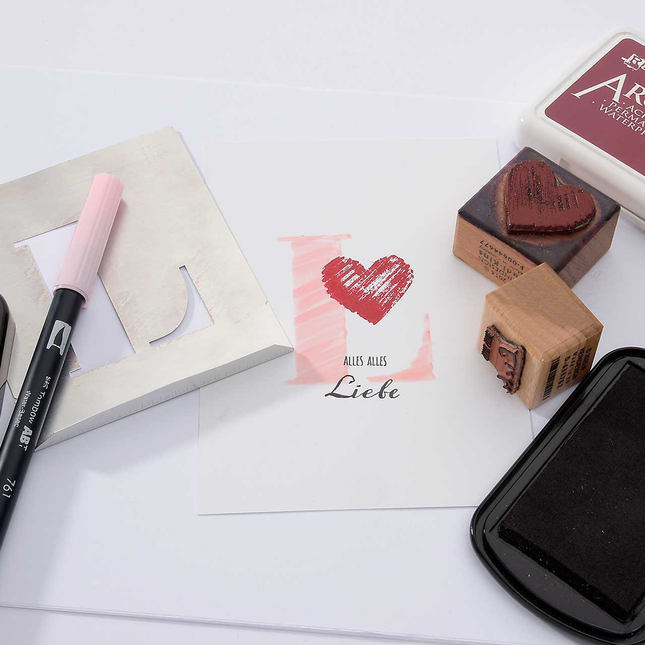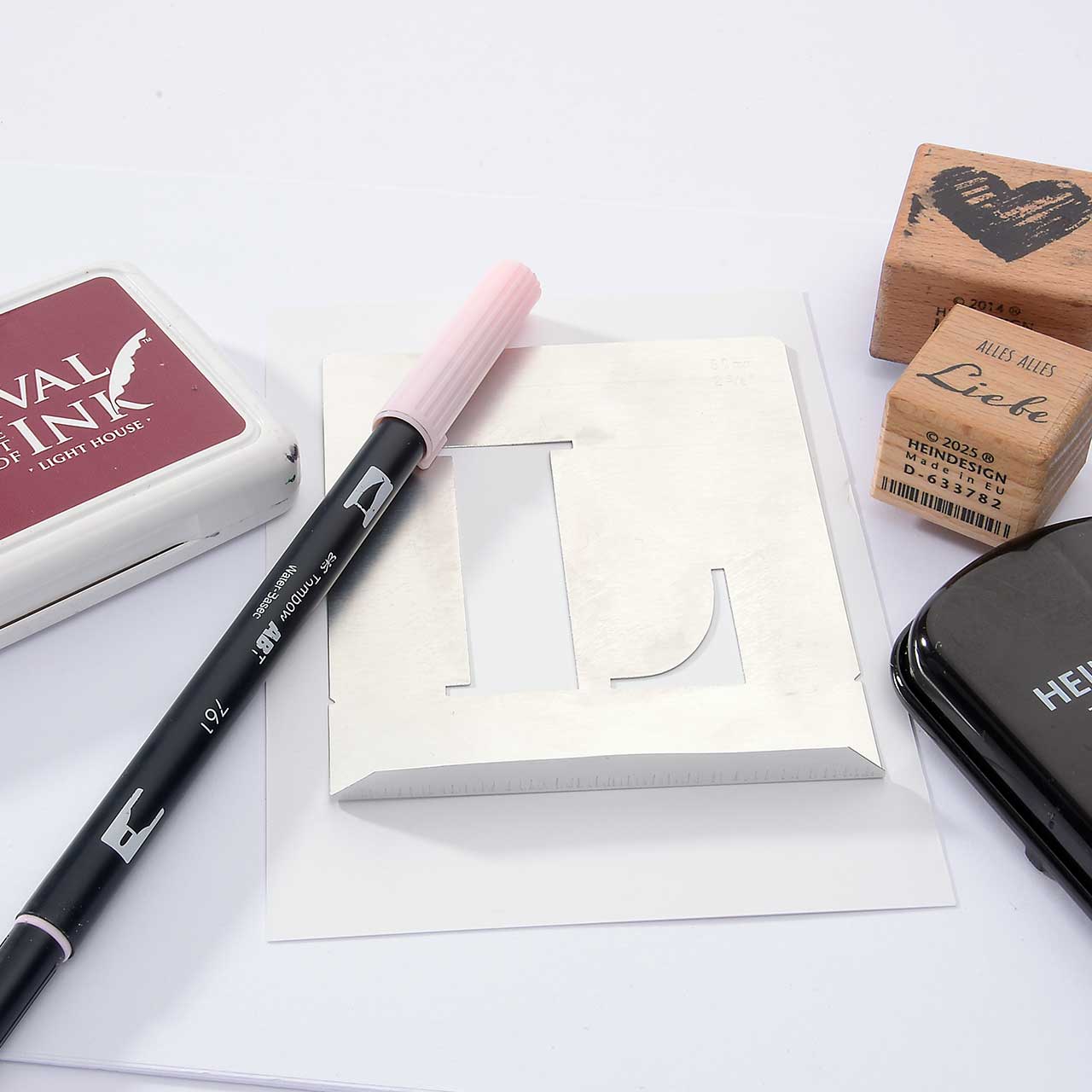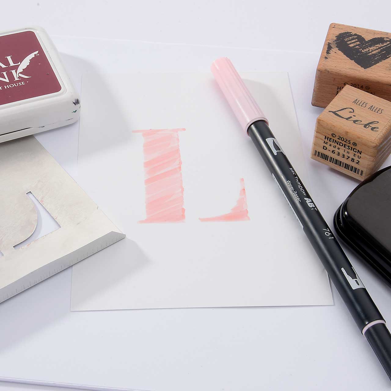 Legen Sie die „L“ Schablone* in die Mitte Ihrer Karte und malen Sie den Buchstaben mit dem Tombow Dual Brushpen (ABT) aus. Wenn Sie dabei den Faserschreiber schön flach halten geht es besonders fix.