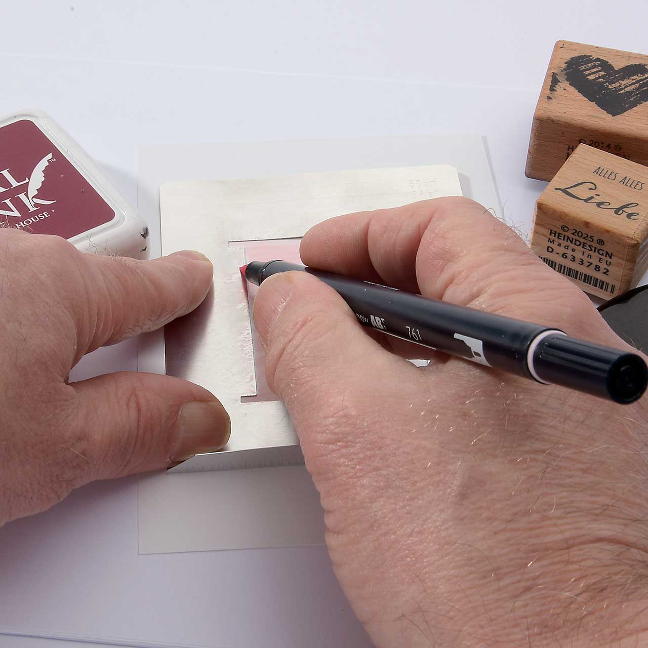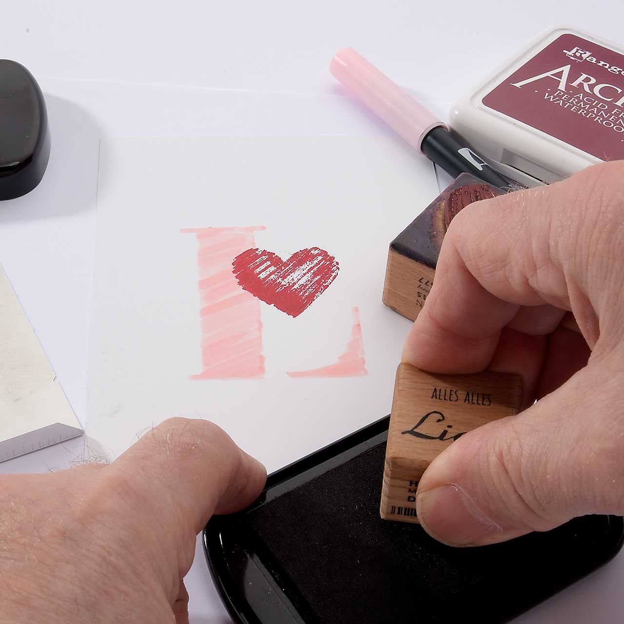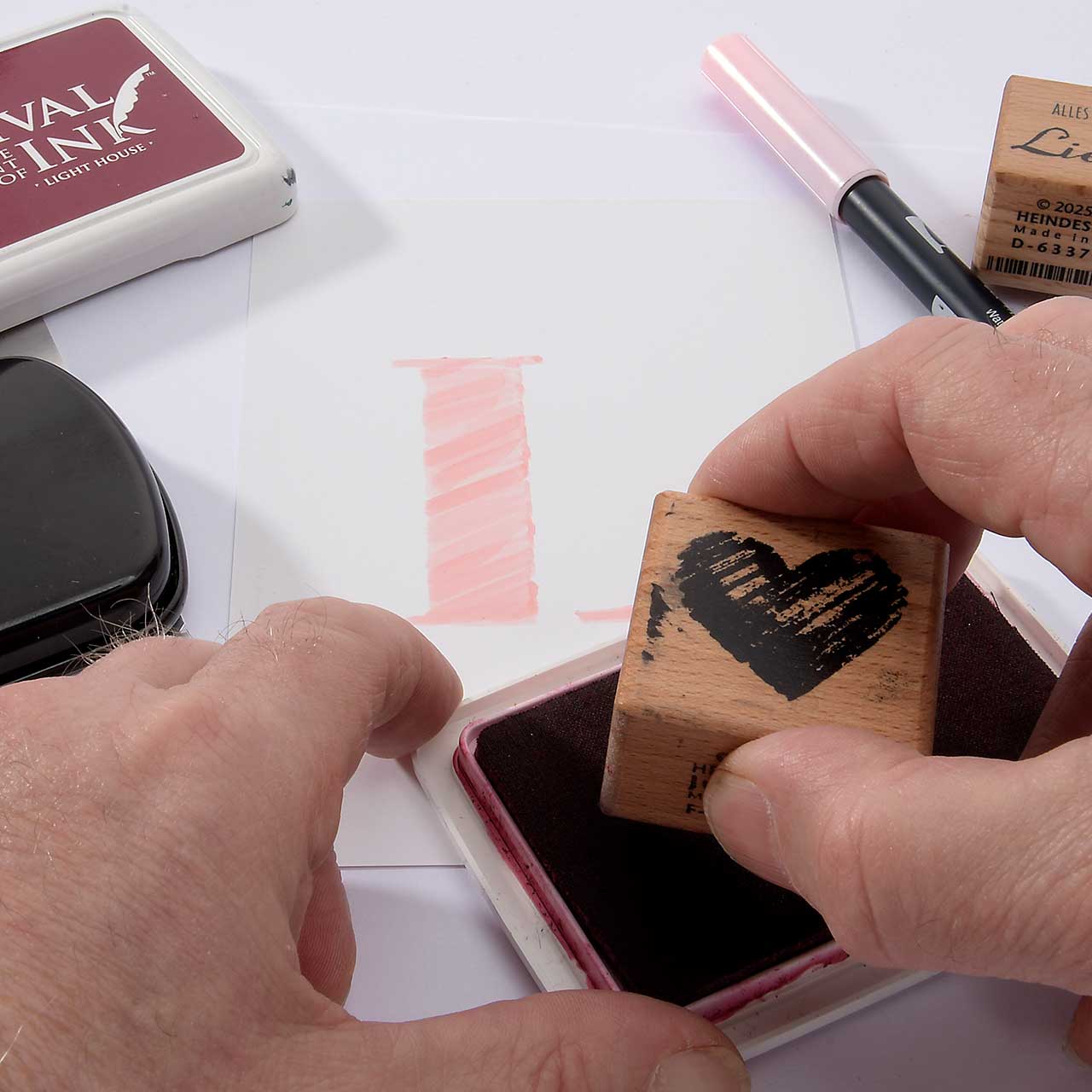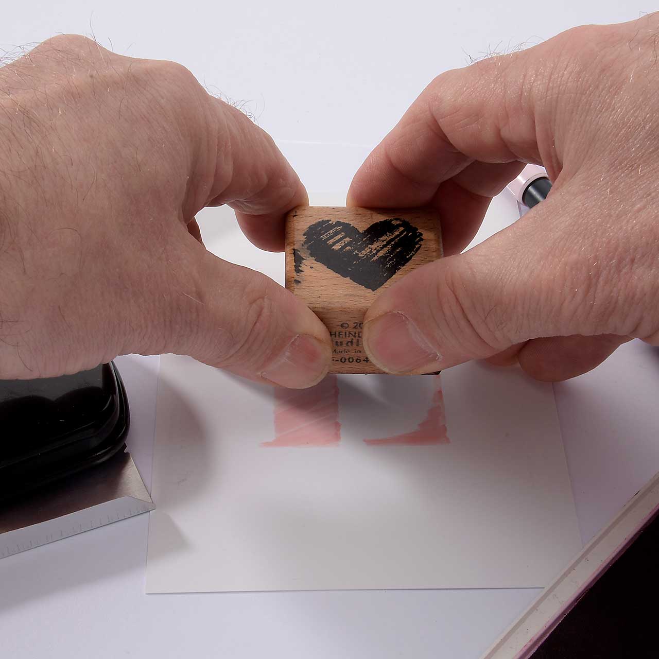 Nehmen Sie die Schablone weg und stempeln Sie das Herz Motiv mit dem roten Stempelkissen in die Mitte ihrer Karte.
