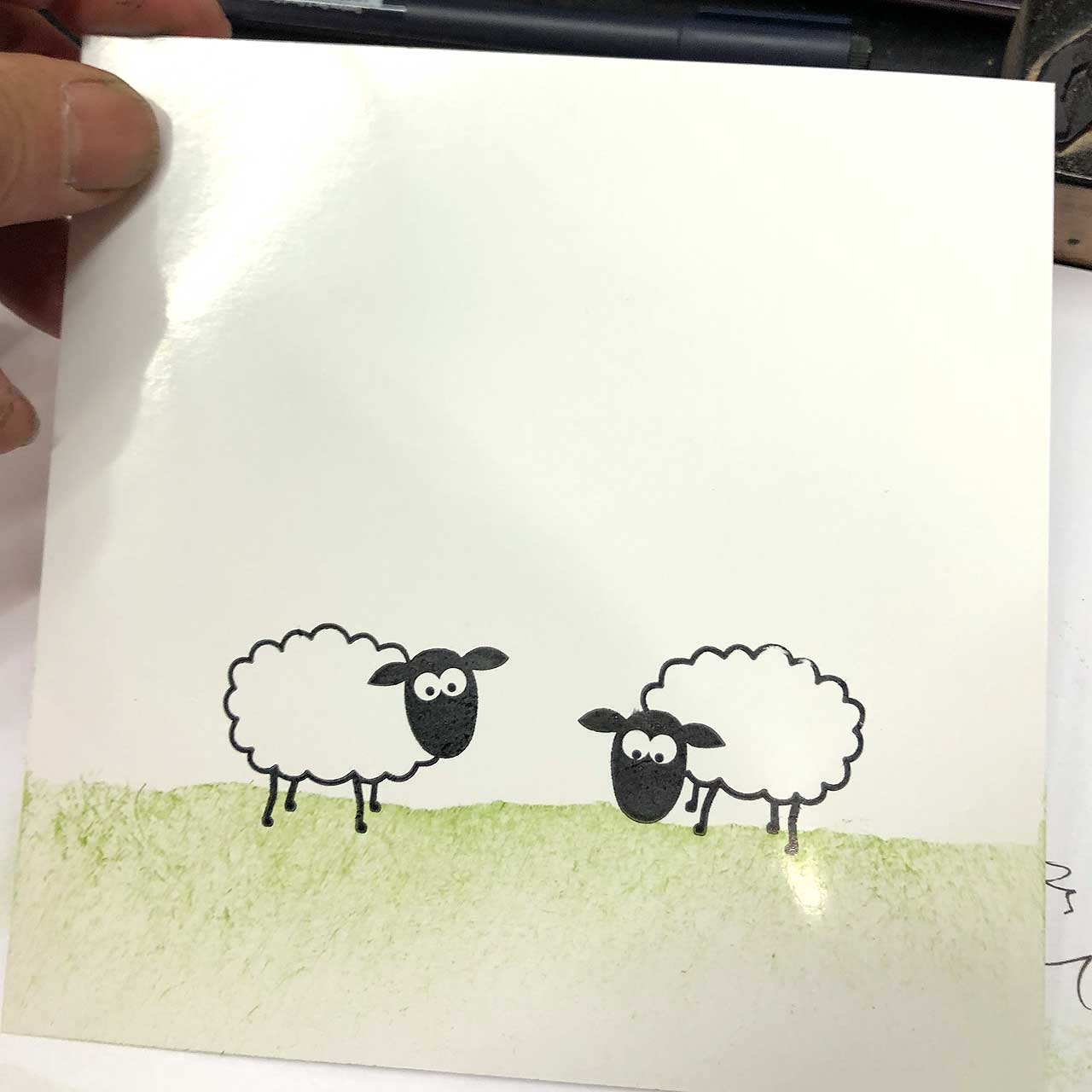 Stempeln Sie die Schaf-Motive mit dem schwarzen Archival Dye Ink Stempelkissen auf die Wiese.