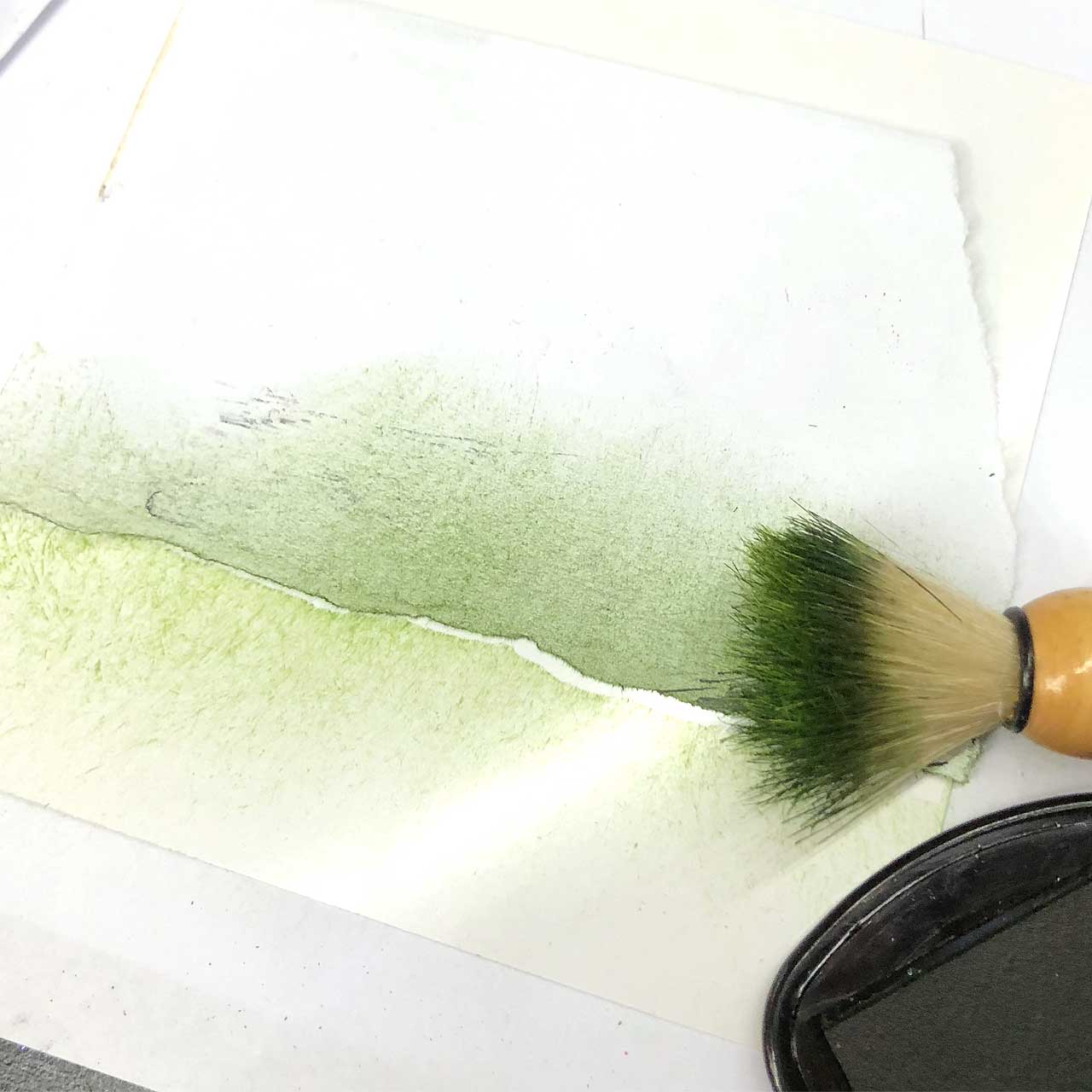 Decken Sie mit dem Papierstreifen die obere Hälfte Ihre Karte ab. Nehmen Sie mit einem Color-Duster Pinsel grüne Farbe aus einem Archival Dye Ink Stempelkissen auf und Tupfen Sie eine Wiese auf den unteren Teil Ihrer Karte.