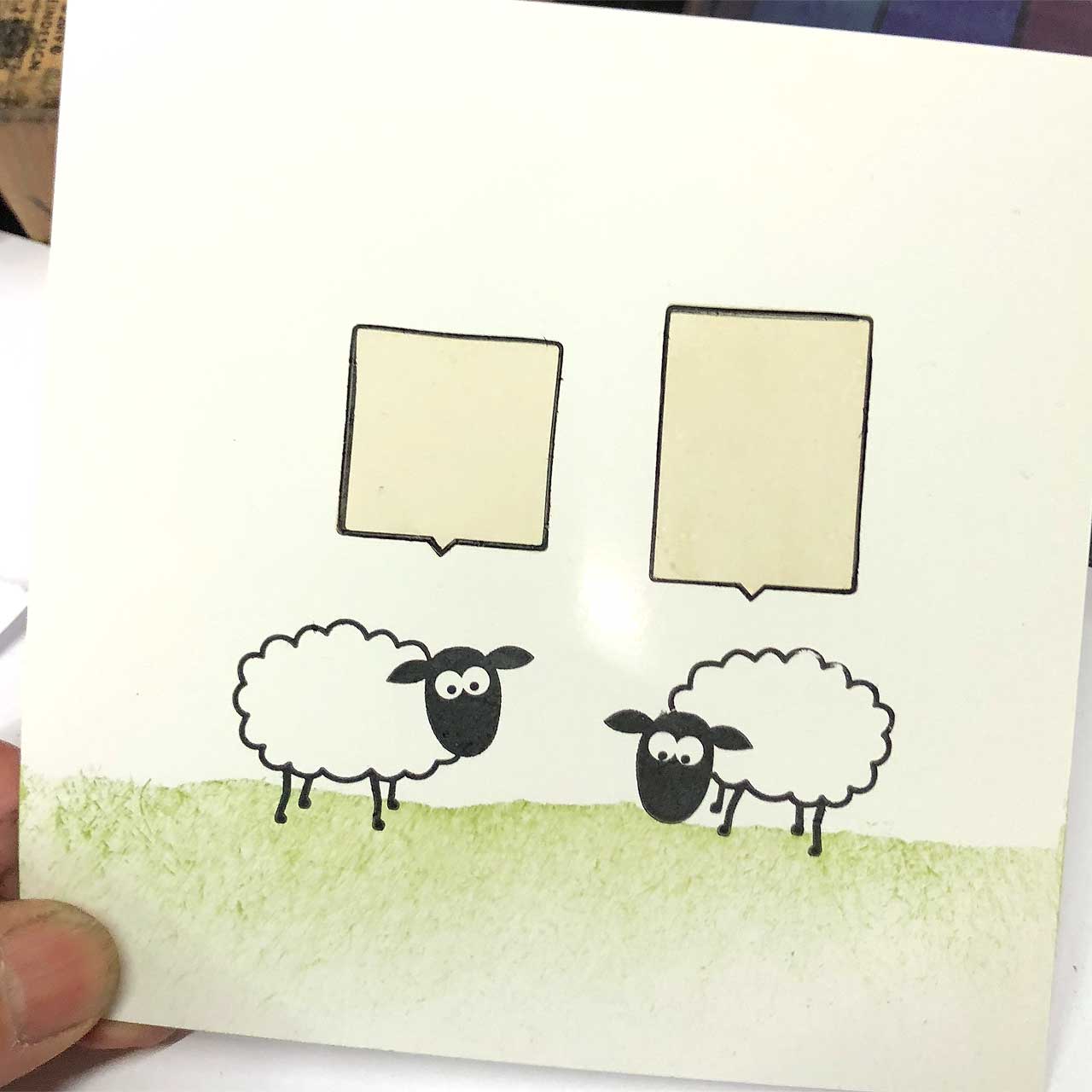Färben Sie das Sprechblase lang Flächenmotiv mit dem Tombow Dual Brush Pen (ABT) Sand Hell ein und stempeln Sie das Motiv mittig oberhalb des rechten Schaf-Motives ab.