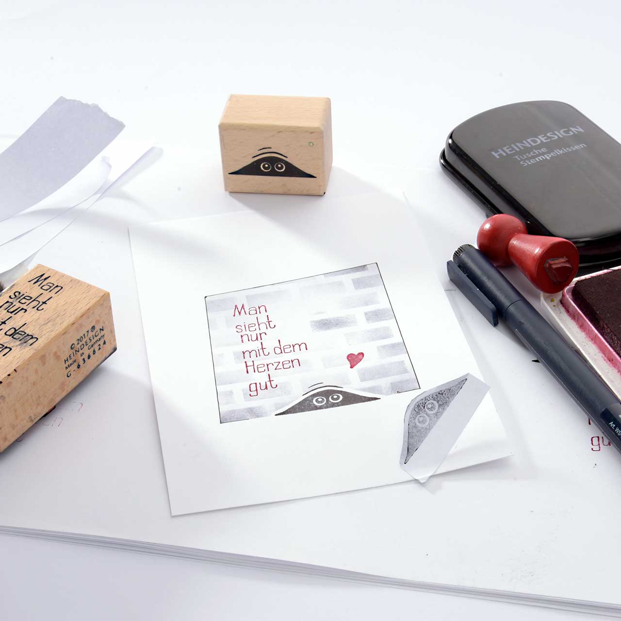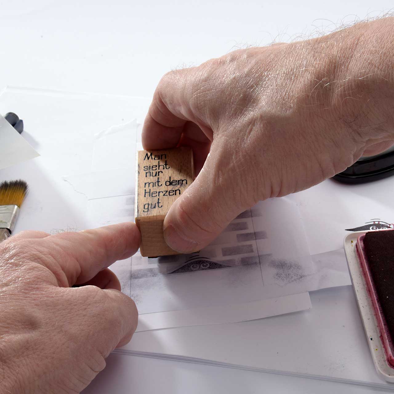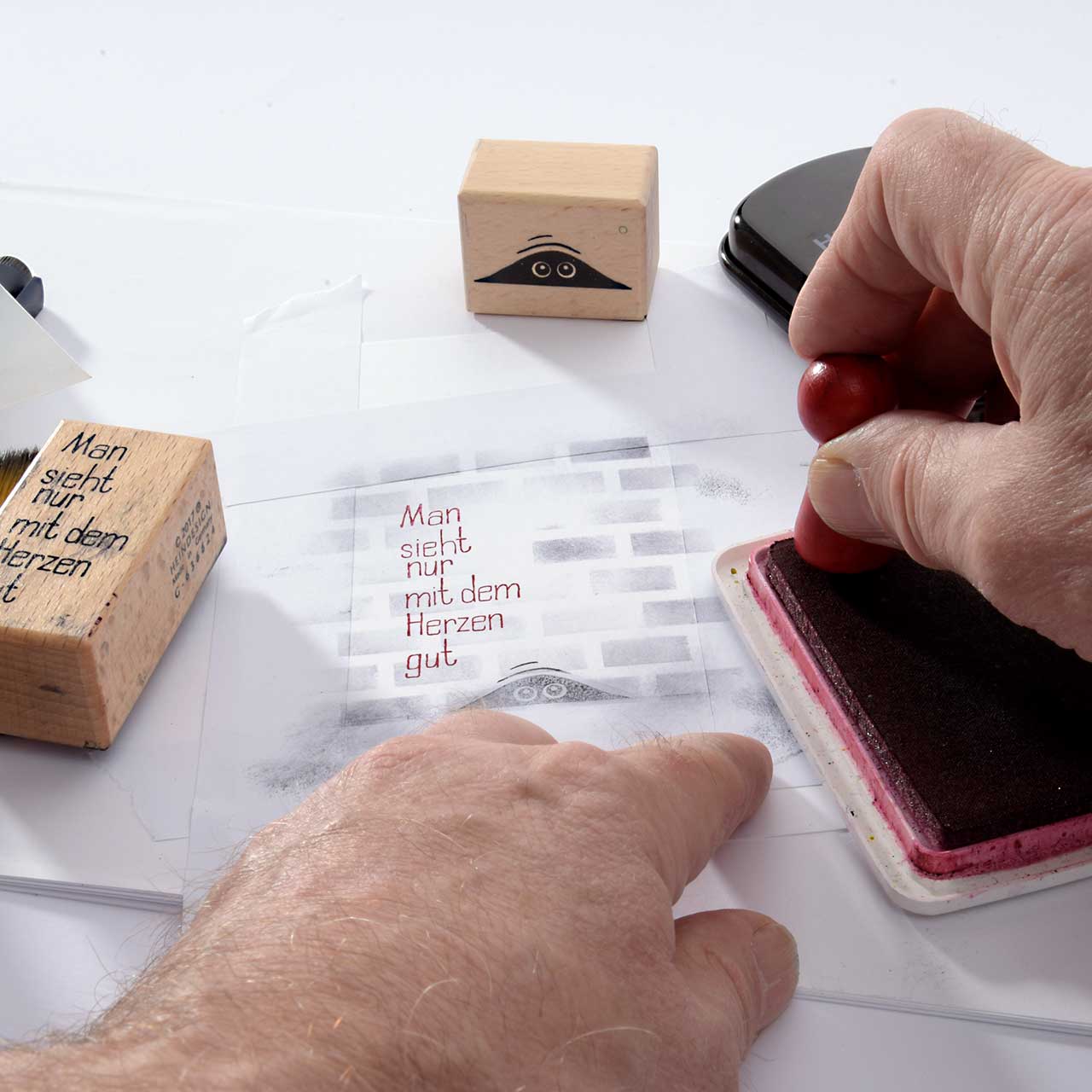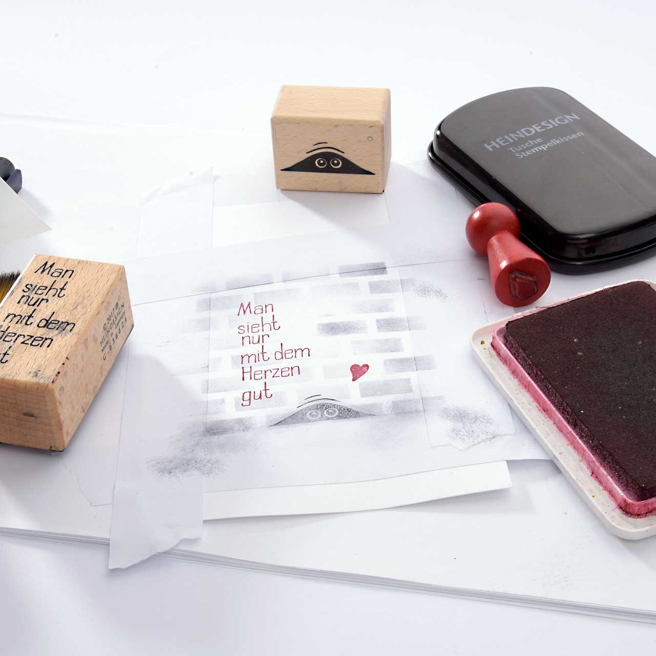 Stempeln Sie das „Man sieht nur mit dem Herzen gut“ Textmotiv mit dem roten Stempelkissen auf die linke Seite Ihrer Ziegelsteinwand.