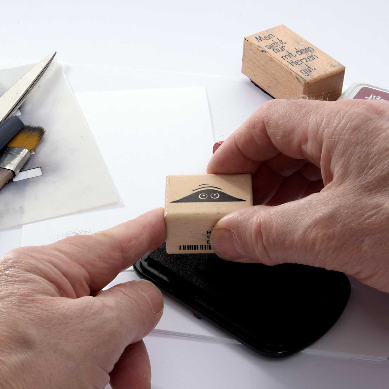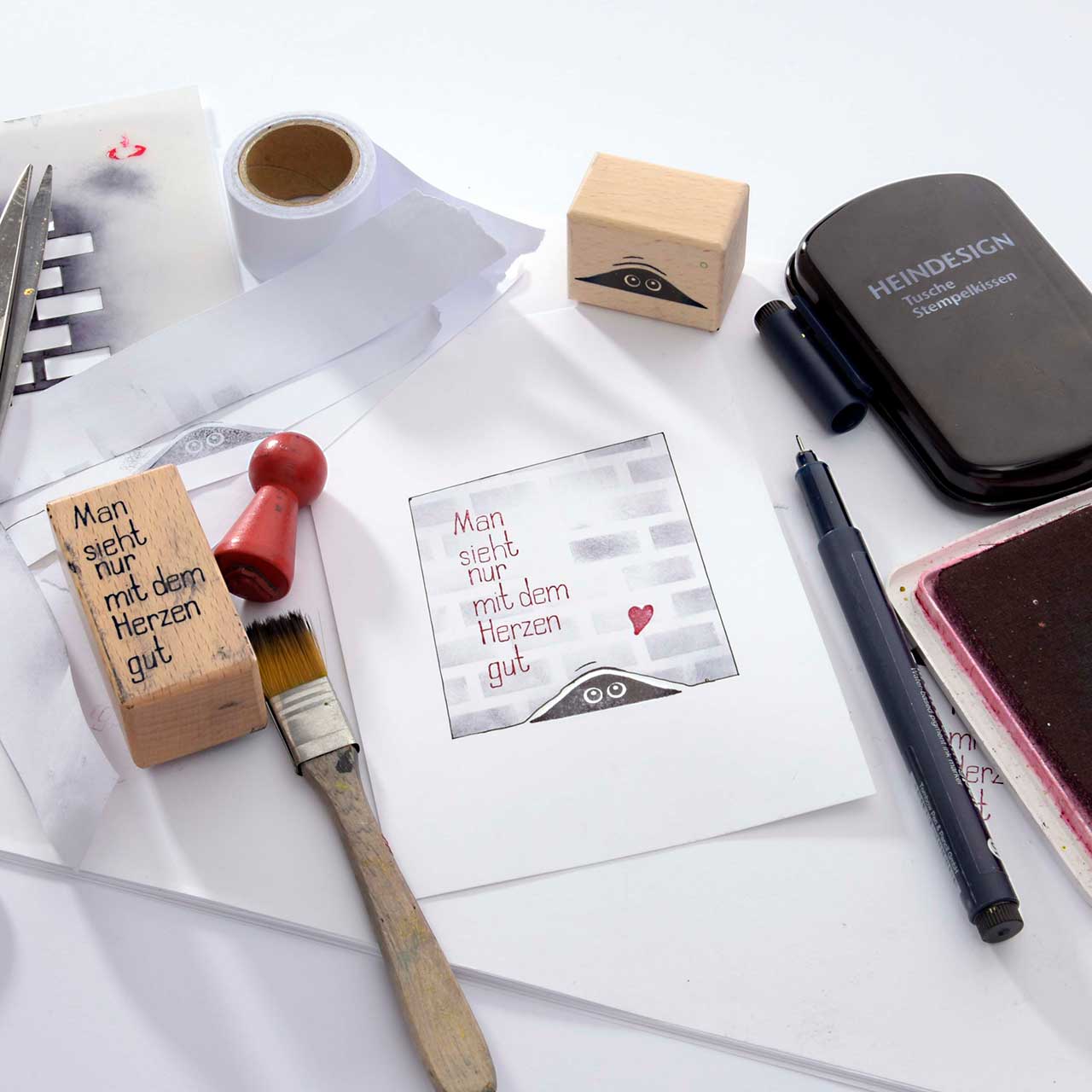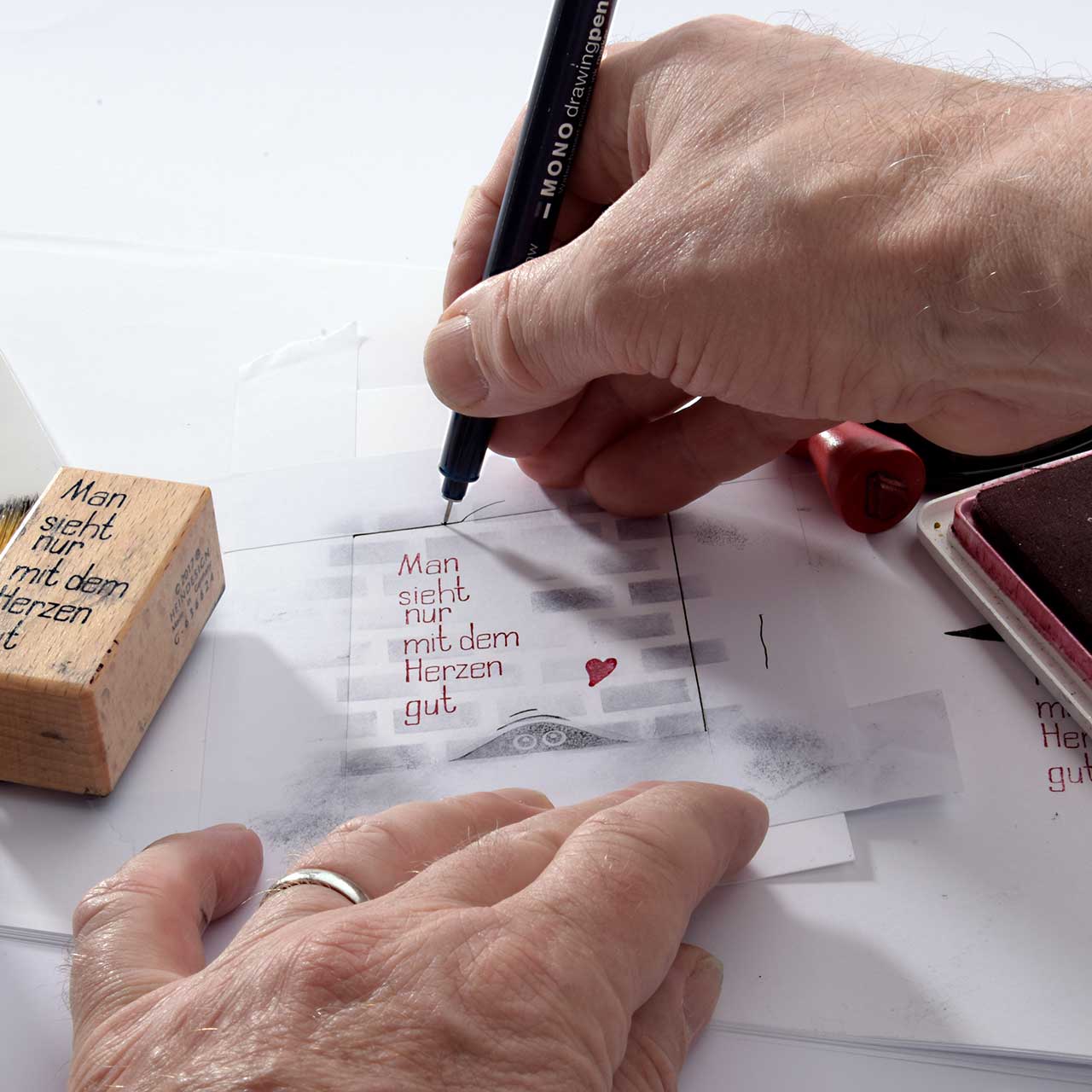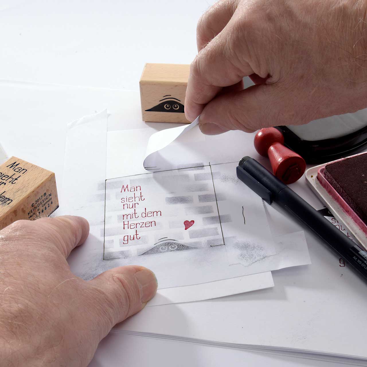 Stempeln Sie das „Man sieht nur mit dem Herzen gut“ Textmotiv mit dem roten Stempelkissen auf die linke Seite Ihrer Ziegelsteinwand.