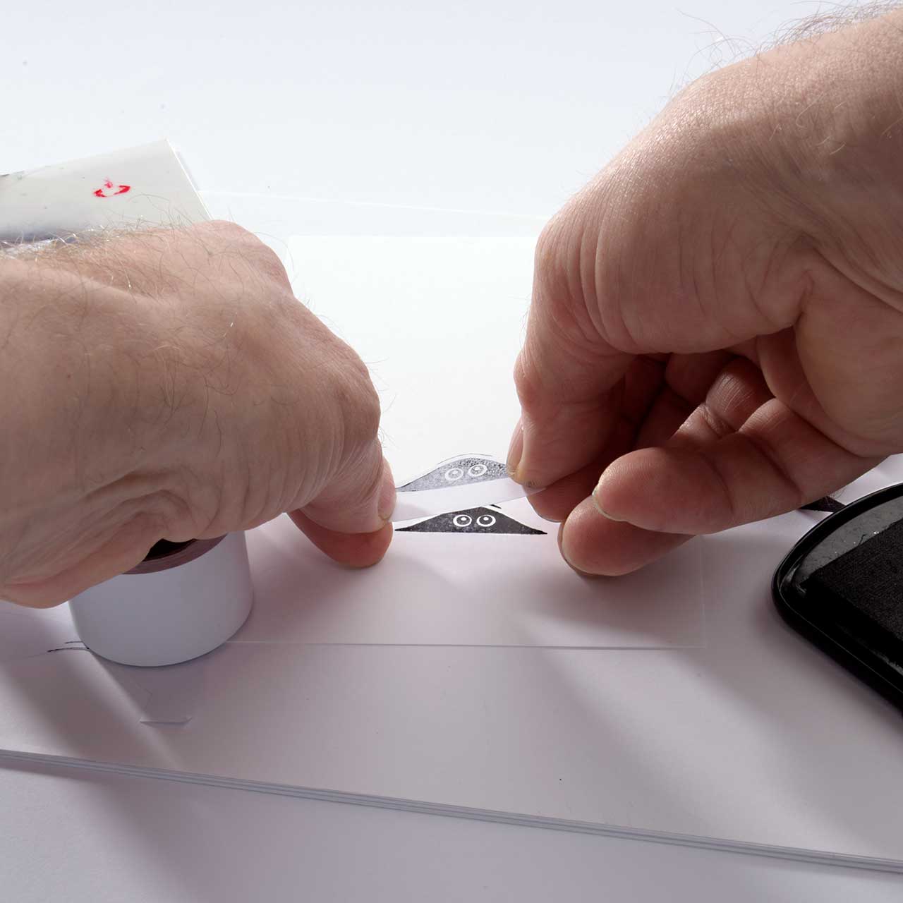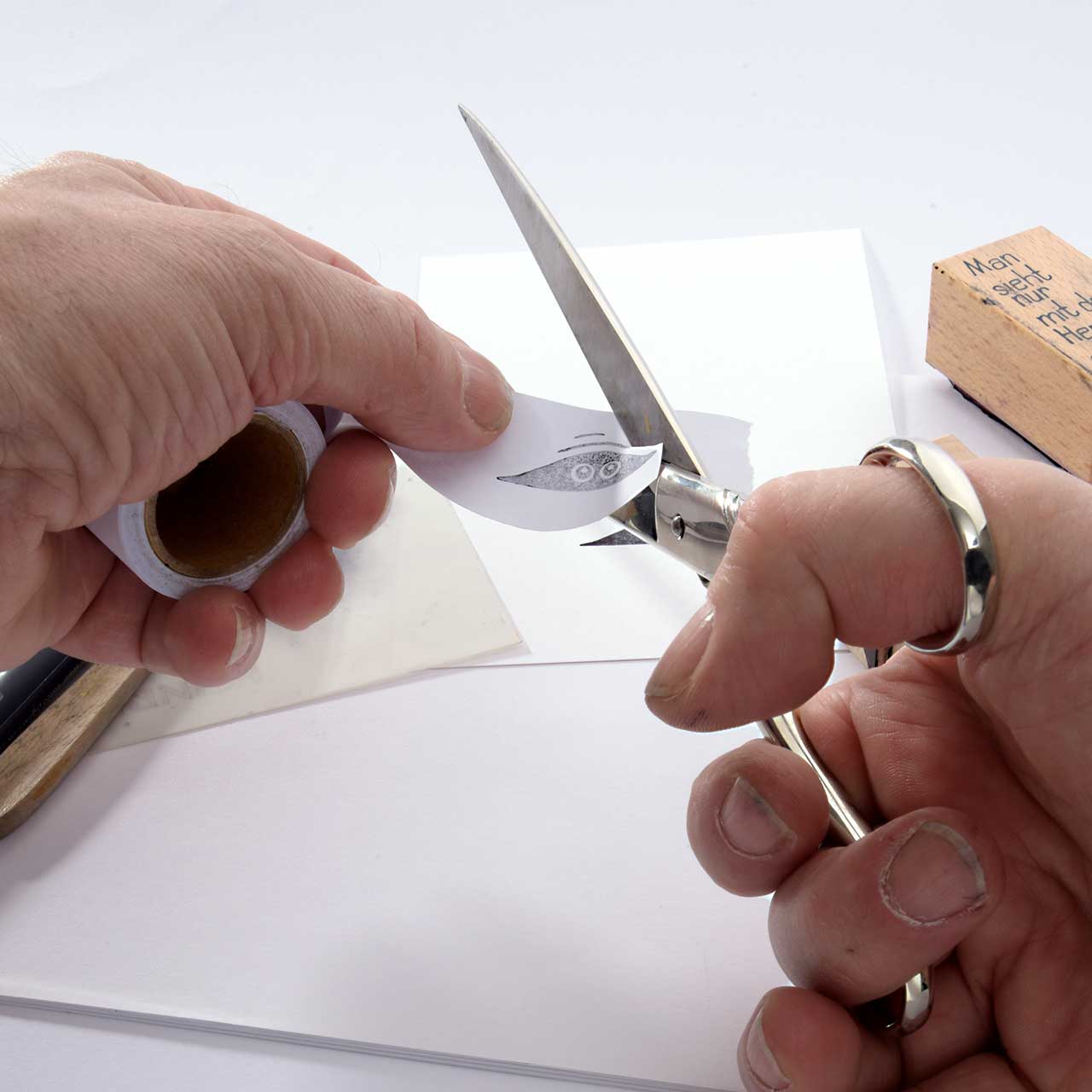 Schneiden Sie das Dunkelmunkel Motiv mit einer Schere aus dem Eclipse Papier und decken Sie damit das Motiv auf ihrer Karte ab.