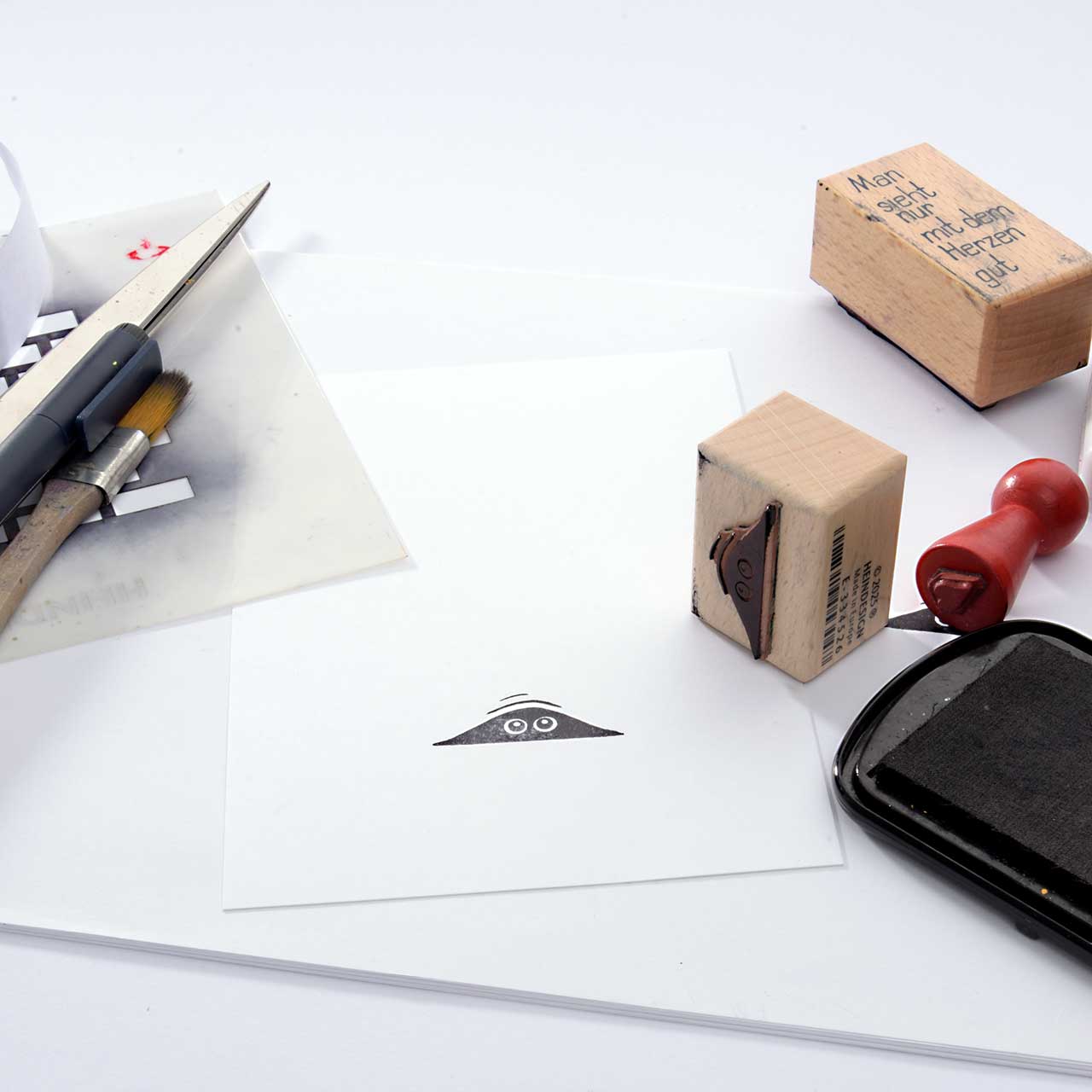 Stempeln Sie das kleine Herz Motiv mit dem roten Stempelkissen rechts oberhalb ihres Dunkelmunkel Motivs.