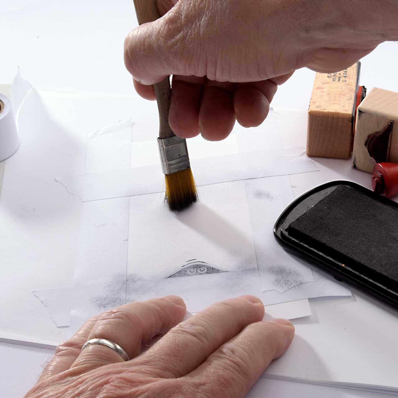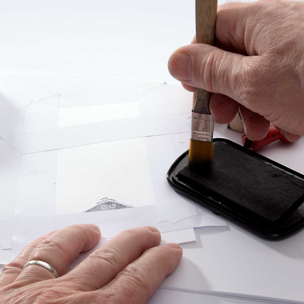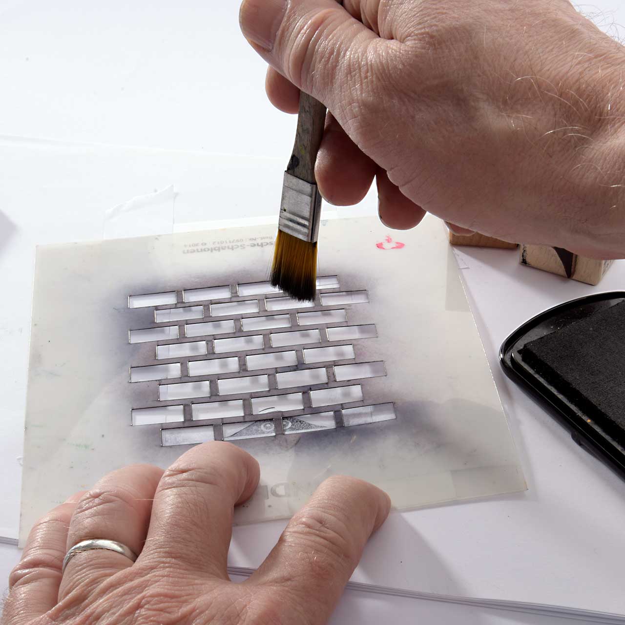 Legen Sie die Ziegelstein Schablone auf und tupfen Sie weiter schwarze Stempelkissenfarbe auf - bitte mit Vorsicht, es soll nur ein heller Grauton entstehen.