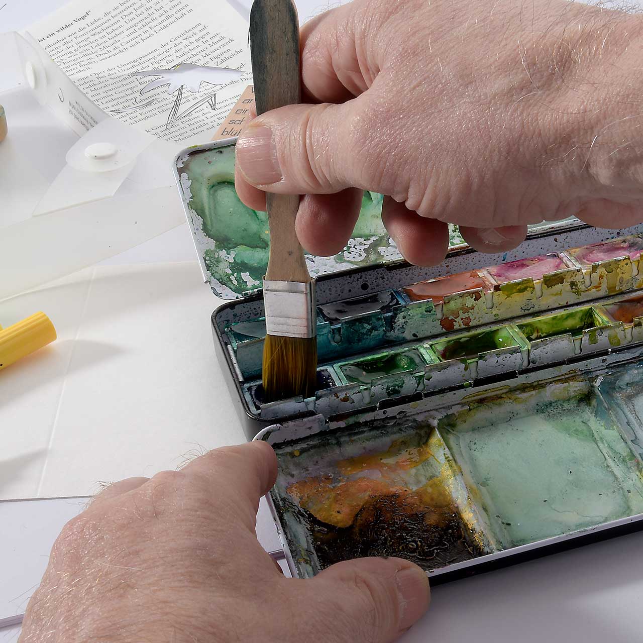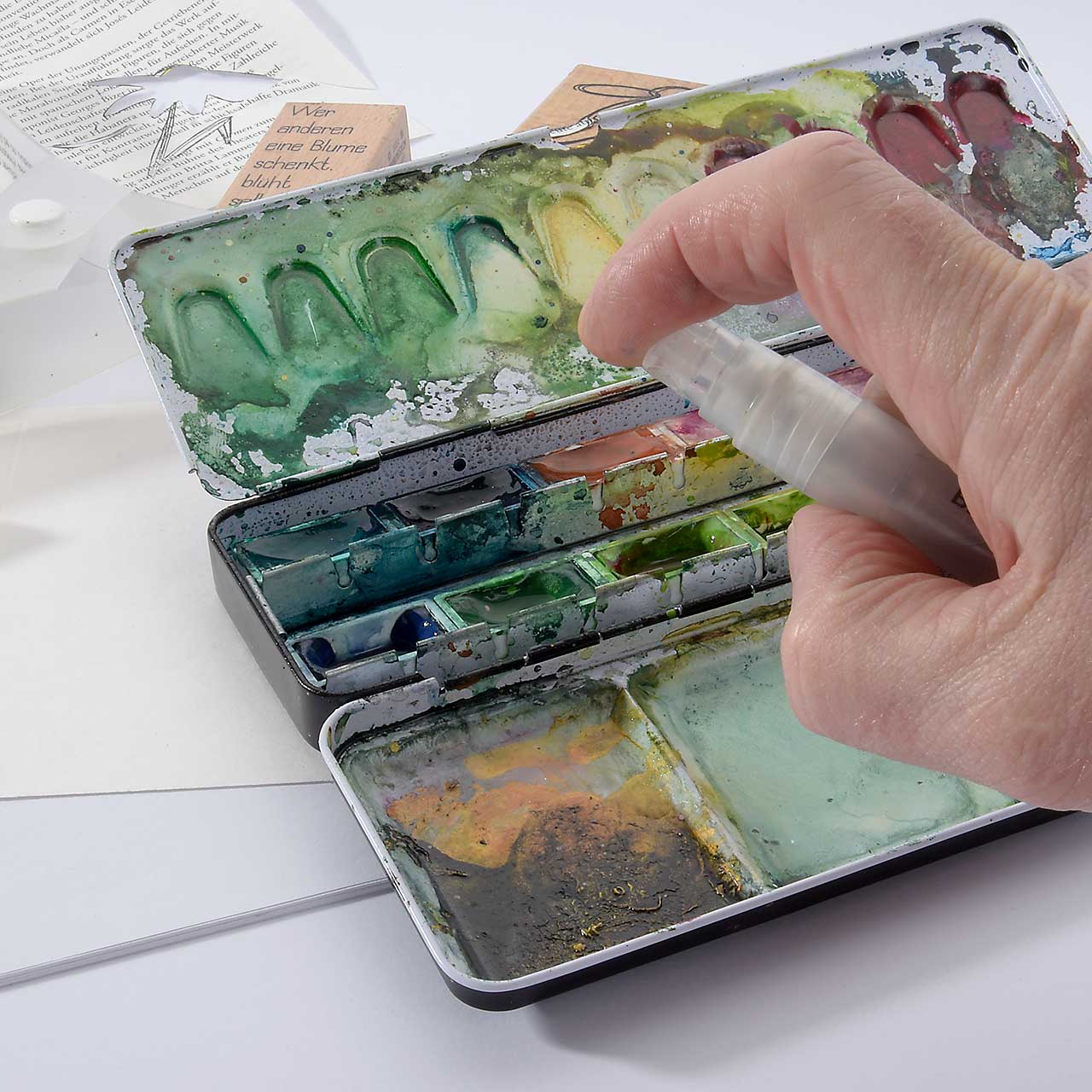 Besprühen Sie Ihren Malkasten mit etwas Wasser (dann klappt es mit der Farbaufnahme besser).