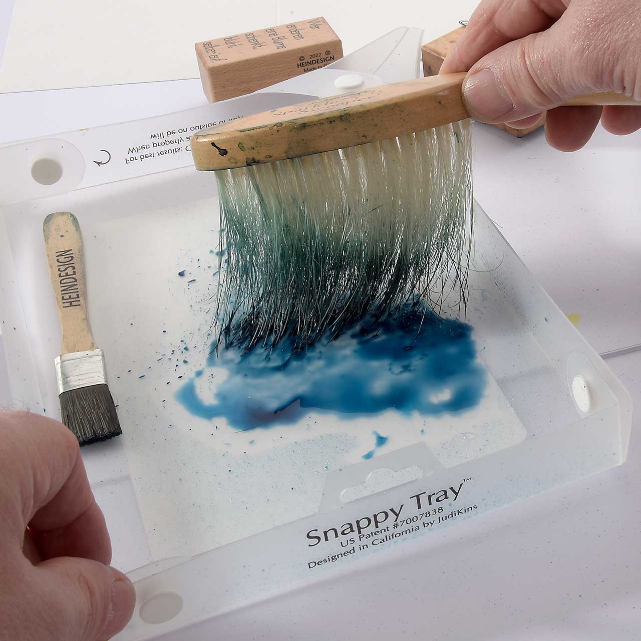 Sprühen Sie etwas Wasser in das SnappyTray und vermalen Sie darin die zuvor mit dem Pinsel aufgenommene Farbe. (Es soll eine größere, dunkelblaue Pfütze entstehen.)