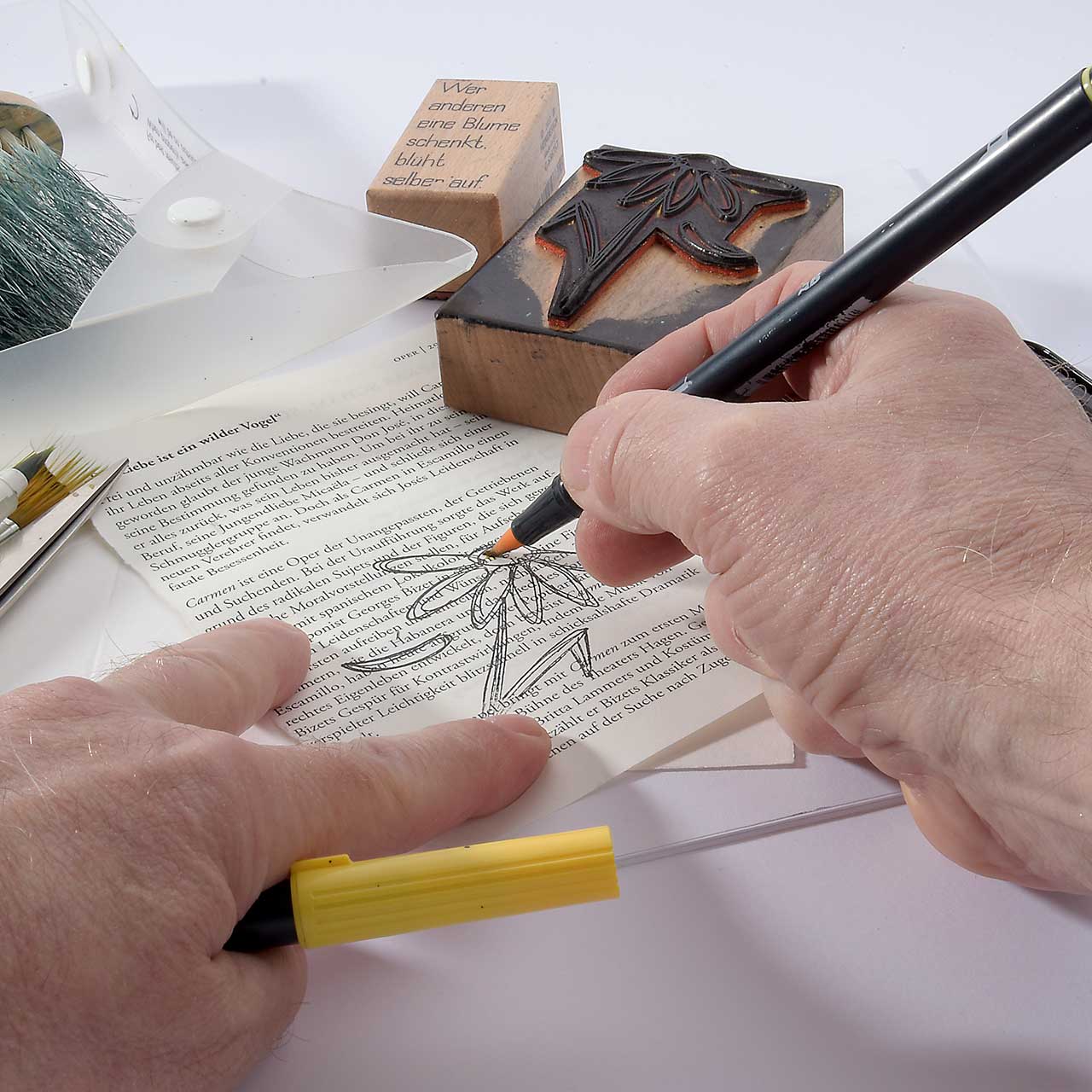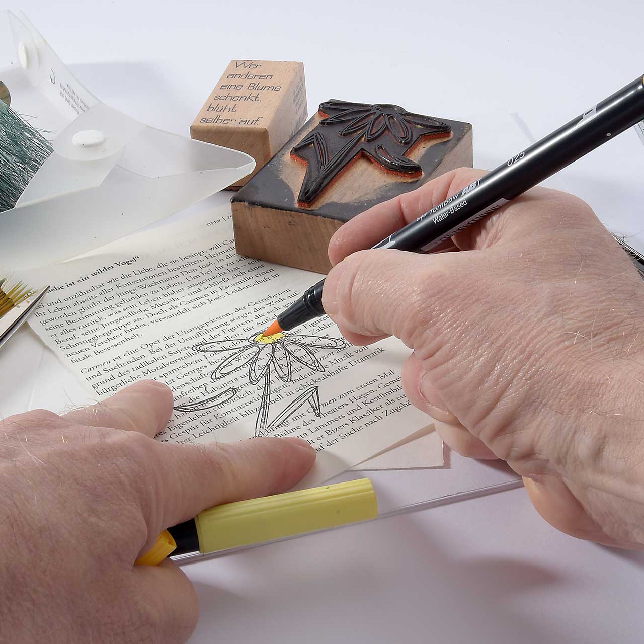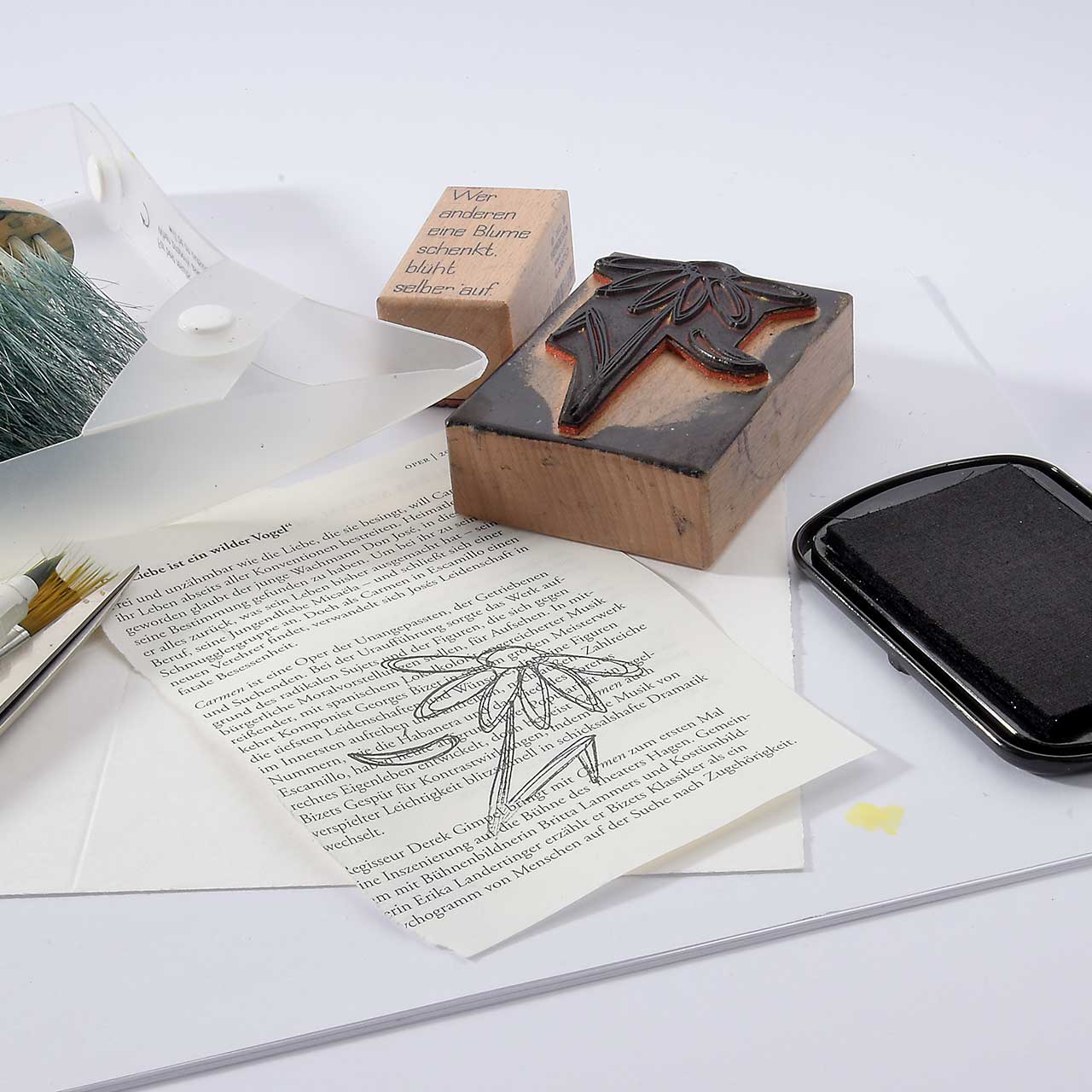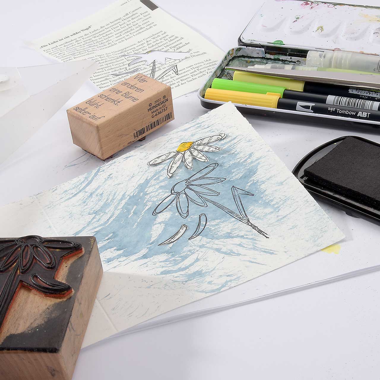 Stempeln Sie das Margerite Motiv mit dem schwarzen Stempelkissen auf eine alte Buchseite.