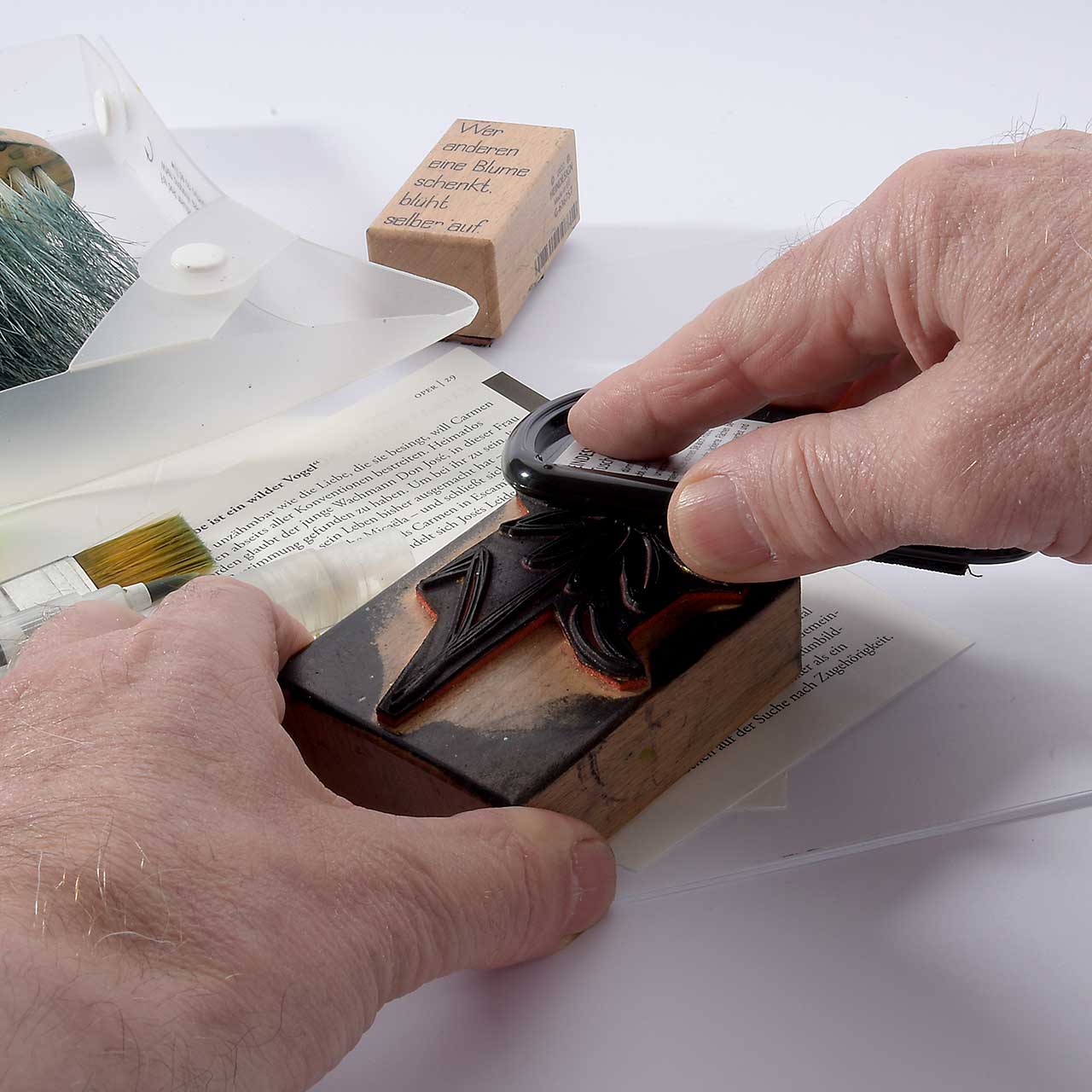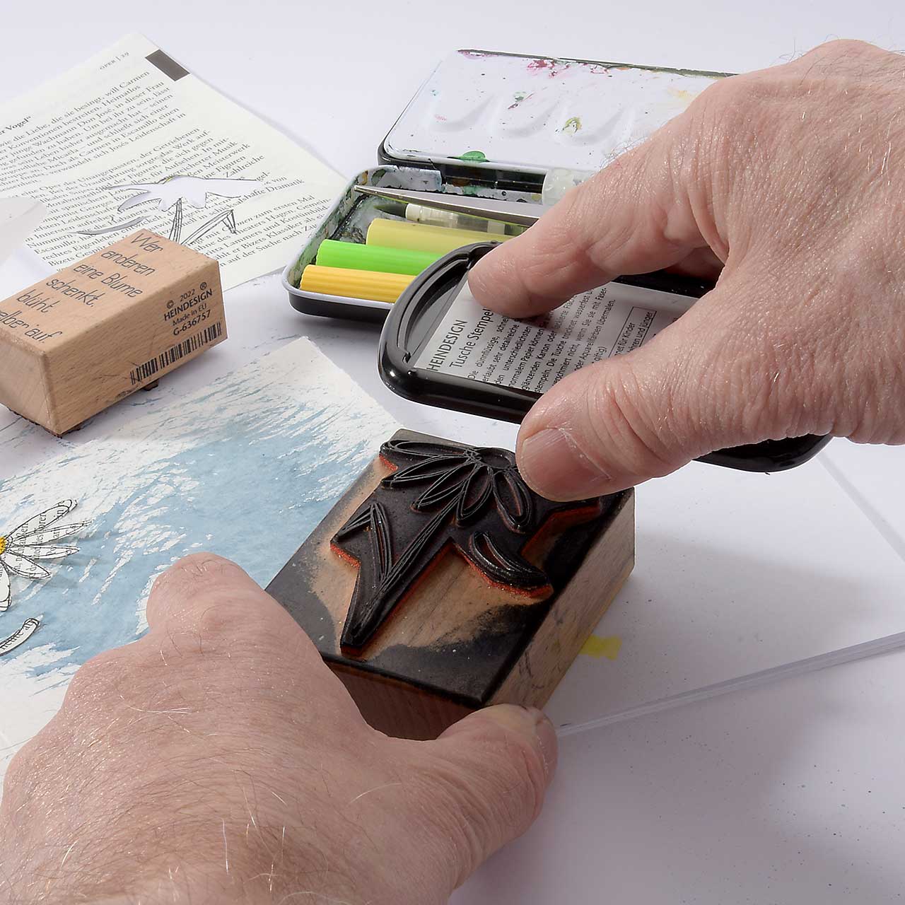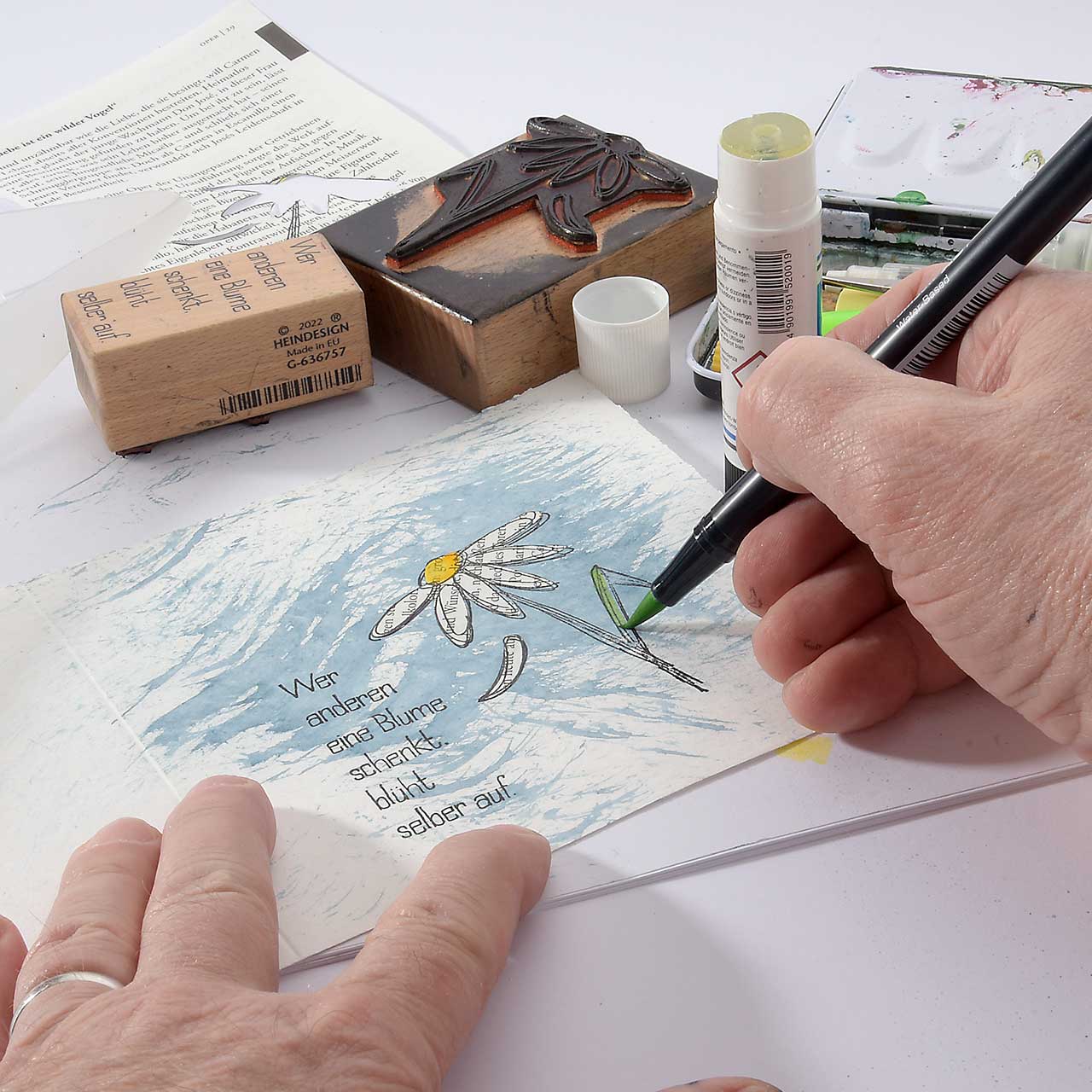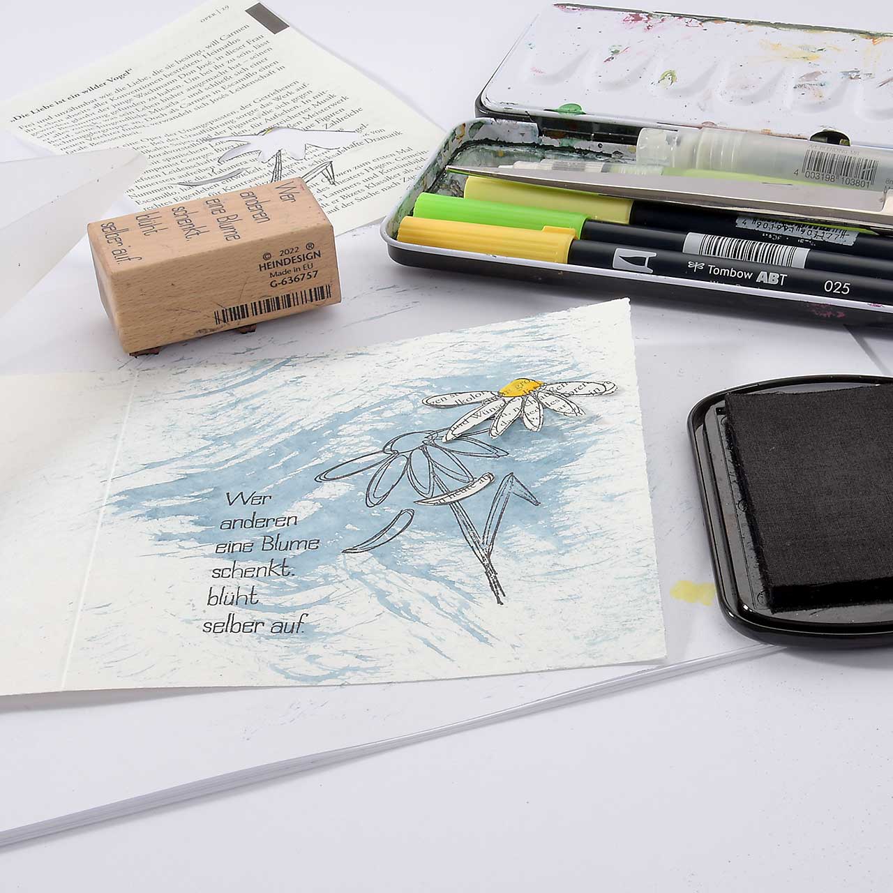 Stempeln Sie das „Wer anderen ...“ Textmotiv mit dem schwarzen Stempelkissen links neben das Blumen Motiv auf Ihre Karte.