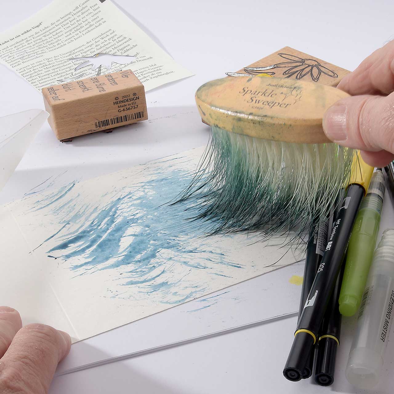 Nehmen Sie die blaue, wässerige Farbe mit dem flotten Feger auf und malen Sie kreuz und quer über Ihre Karte.