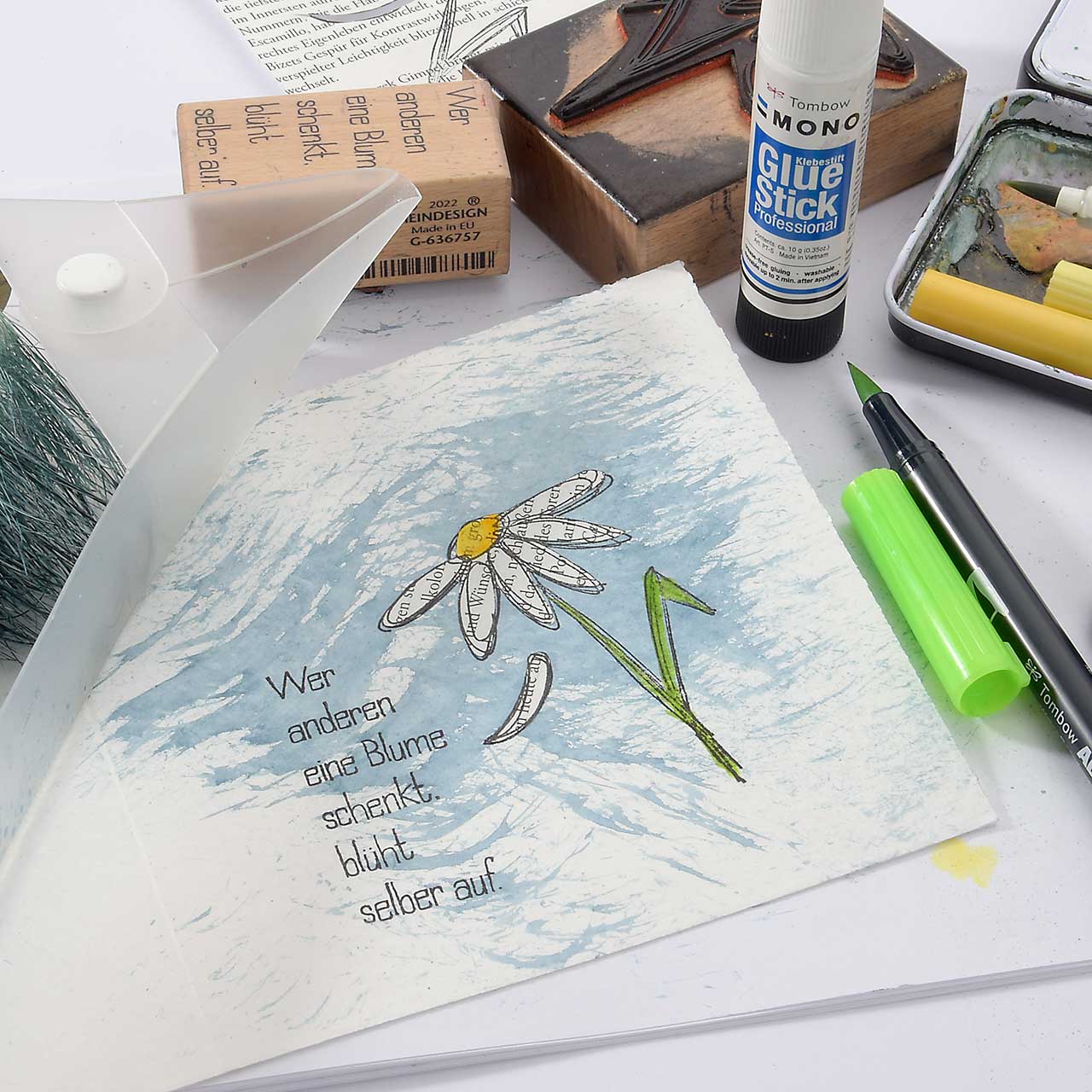Stempeln Sie das Margeriten Motiv mit dem schwarzen Stempelkissen etwas rechts von der Mitte auf Ihre Karte.