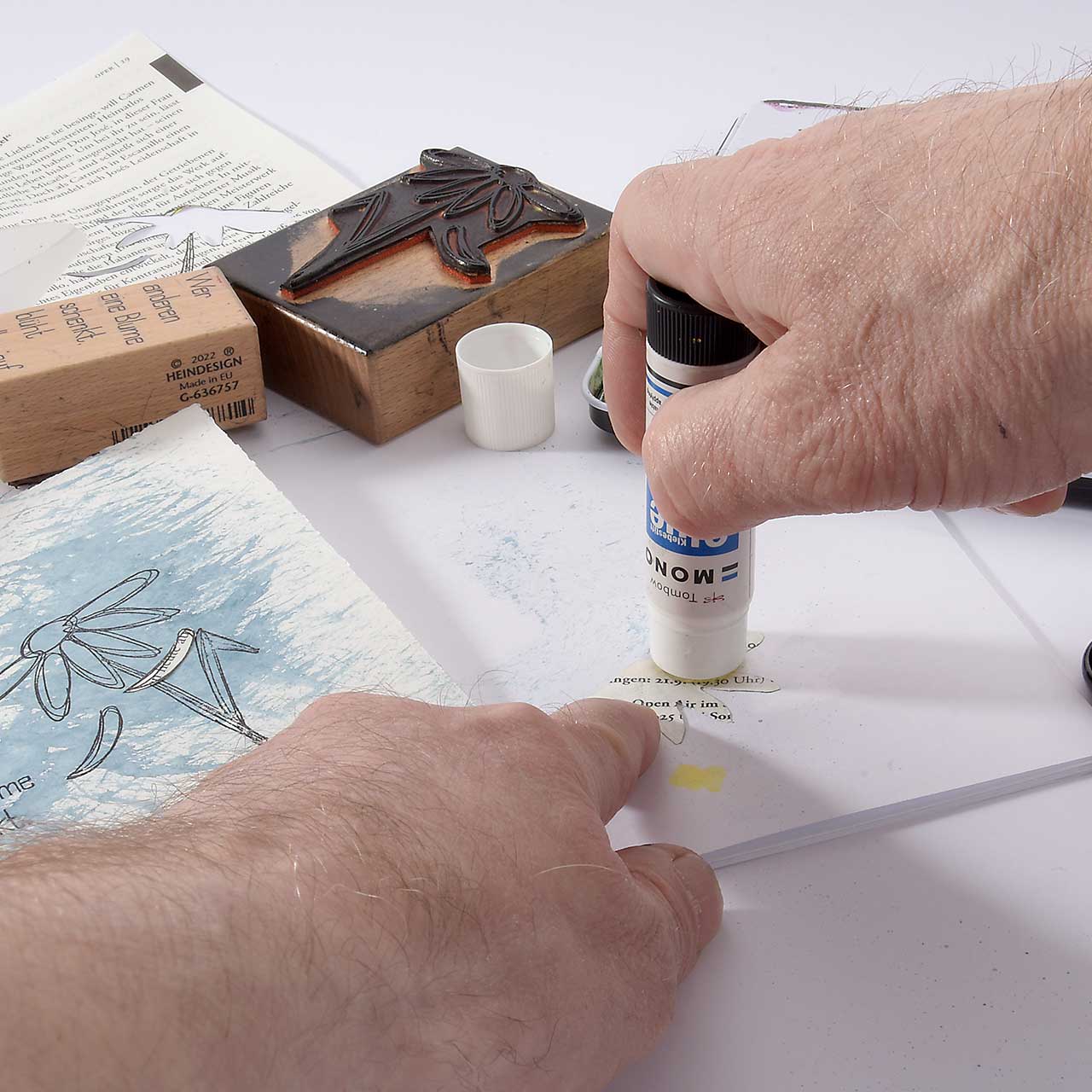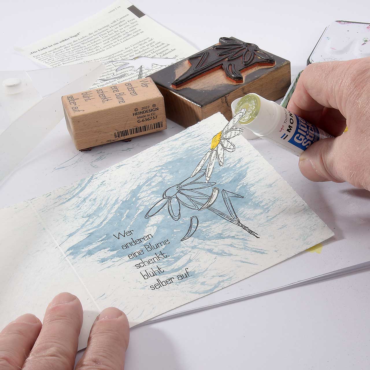 Kleben Sie die beiden aus der alten Buchseite ausgeschnittenen Bildelemente passend auf das zuvor gestempelte Blumen Motiv auf Ihrer Karte.