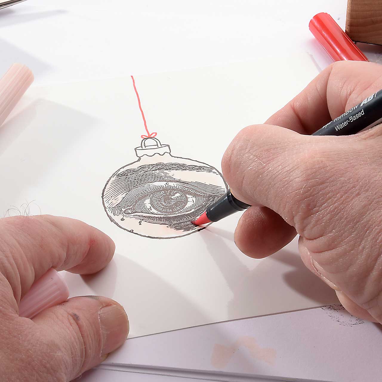Für eine gute Handhabung der Stempel wird das Stempelgummi mit einer dämpfenden Schicht auf einen Griff geklebt. Dieser Griff besteht aus einem lackierten Buchenholzklötzchen, das das Motiv in original Größe zeigt.