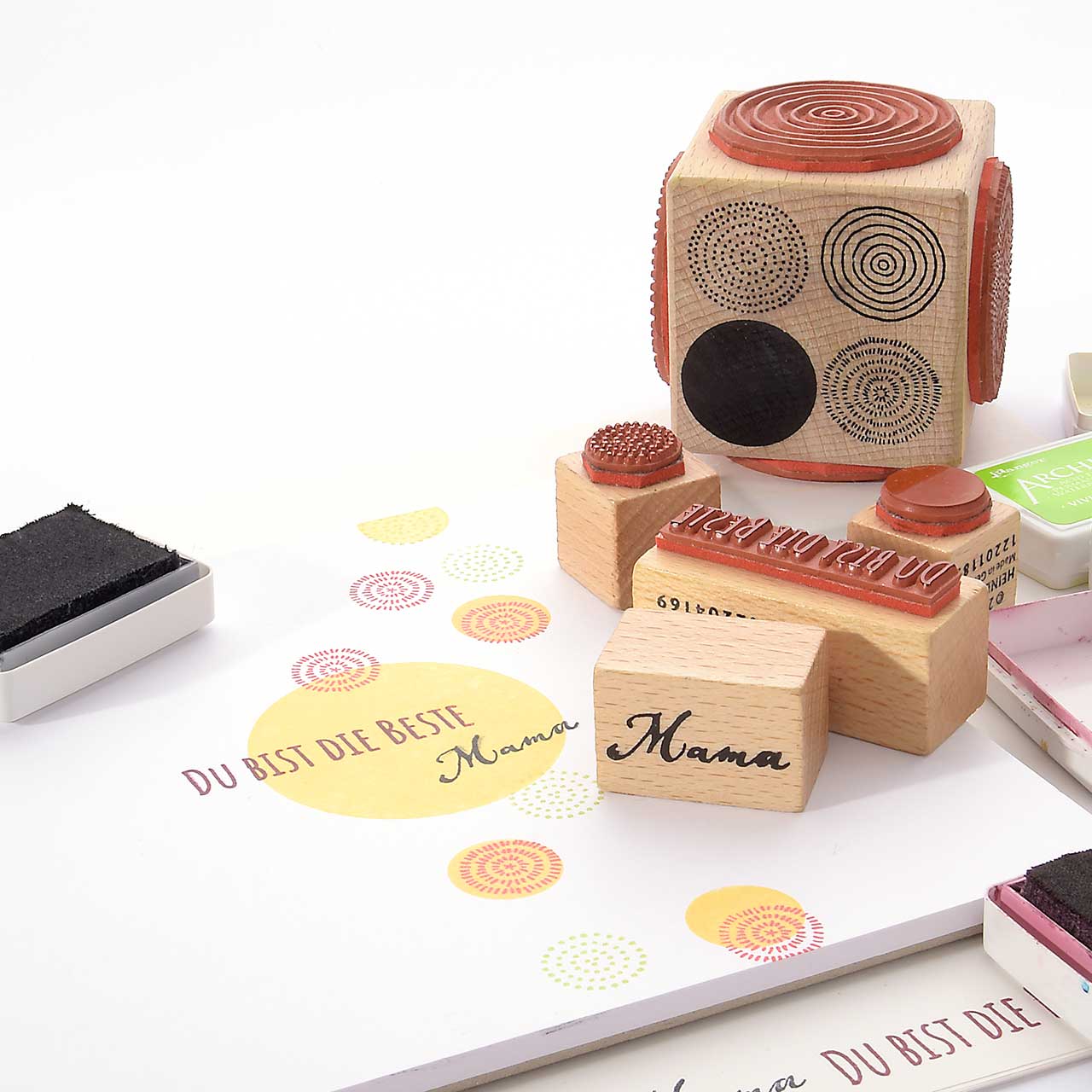 Für eine gute Handhabung der Stempel wird das Stempelgummi mit einer dämpfenden Schicht auf einen Griff geklebt. Dieser Griff besteht aus einem lackierten Buchenholzklötzchen, das das Motiv in original Größe zeigt.