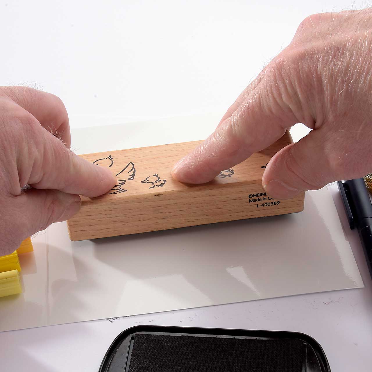 Für eine gute Handhabung der Stempel wird das Stempelgummi mit einer dämpfenden Schicht auf einen Griff geklebt. Dieser Griff besteht aus einem lackierten Buchenholzklötzchen, das das Motiv in original Größe zeigt.