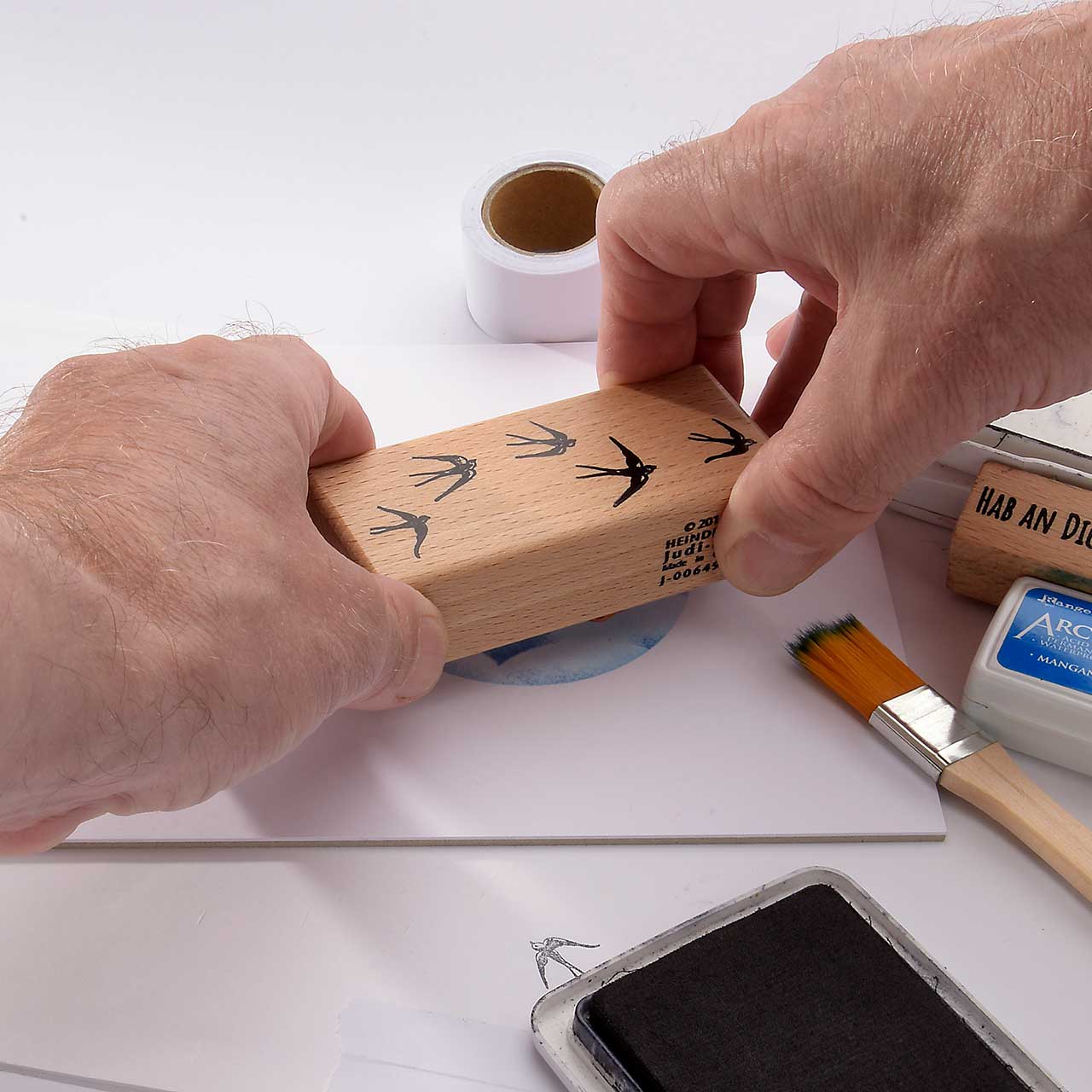 Für eine gute Handhabung der Stempel wird das Stempelgummi mit einer dämpfenden Schicht auf einen Griff geklebt. Dieser Griff besteht aus einem lackierten Buchenholzklötzchen, das das Motiv in original Größe zeigt.