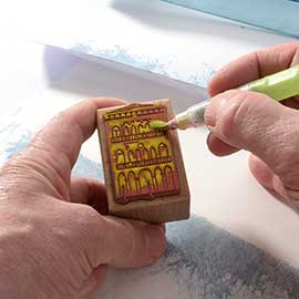 Für eine gute Handhabung der Stempel wird das Stempelgummi mit einer dämpfenden Schicht auf einen Griff geklebt. Dieser Griff besteht aus einem lackierten Buchenholzklötzchen, das das Motiv in original Größe zeigt.