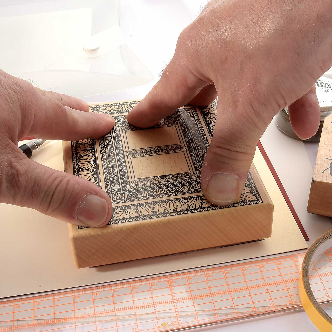 Bei der Stempelmontage wird das Stempelgummi so ausgerichtet, dass das Gummi genau unter dem Abbild auf dem Klotz klebt. So können Sie immer gerade und passgenau stempeln.