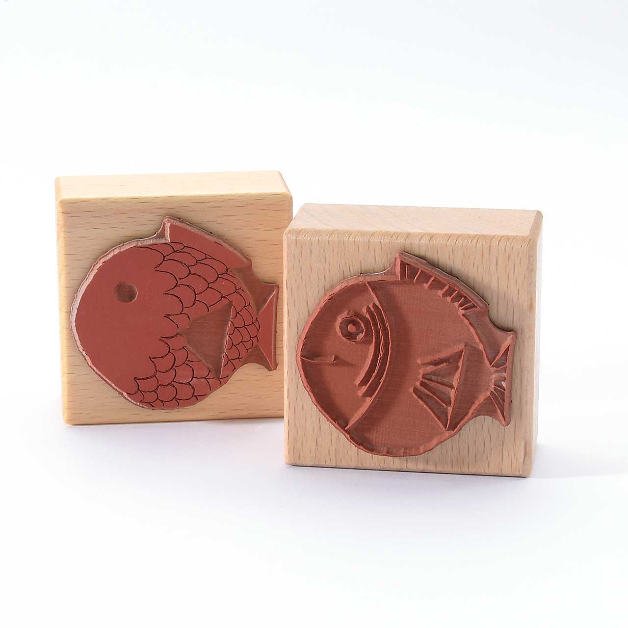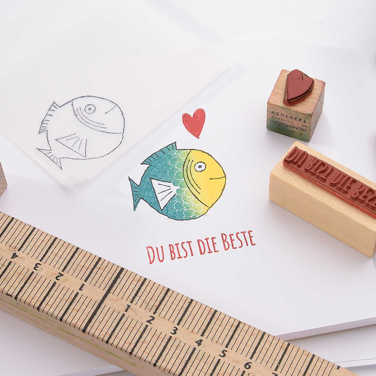 Für eine gute Handhabung der Stempel wird das Stempelgummi mit einer dämpfenden Schicht auf einen Griff geklebt. Dieser Griff besteht aus einem lackierten Buchenholzklötzchen, das das Motiv in original Größe zeigt.