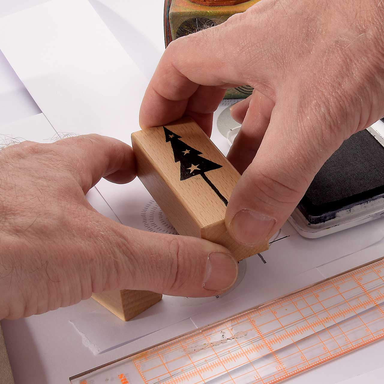Bei der Stempelmontage wird das Stempelgummi so ausgerichtet, dass das Gummi genau unter dem Abbild auf dem Klotz klebt. So können Sie immer gerade und passgenau stempeln.