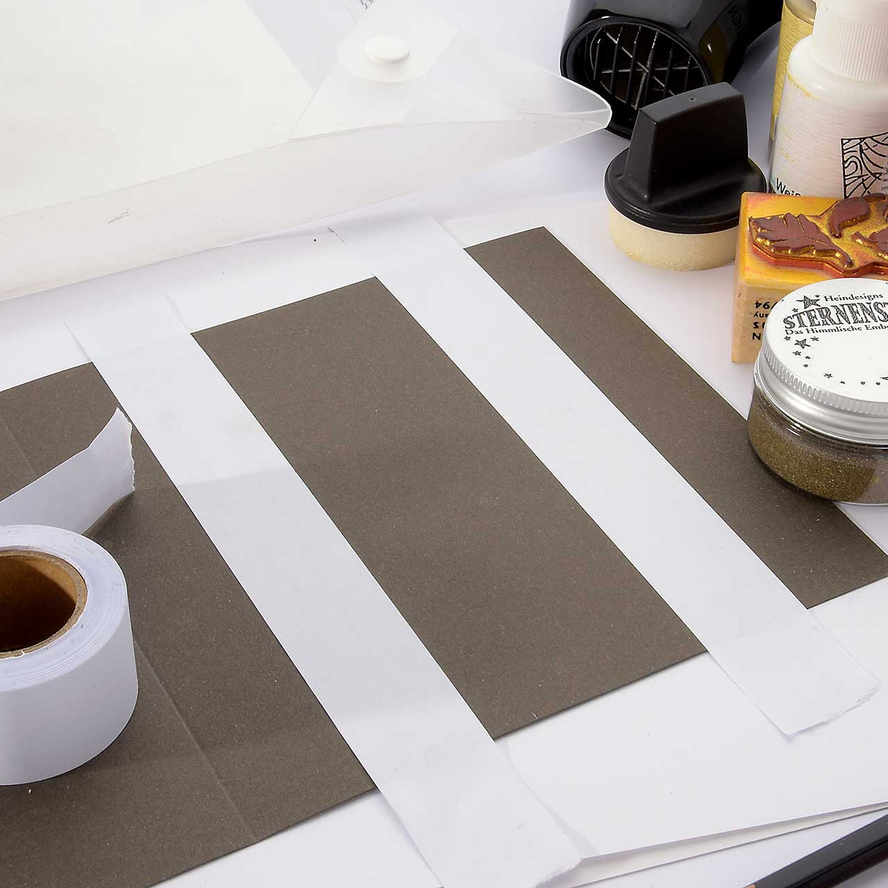 Kleben Sie sich mit dem Judi-Kins Eclipse Schablonenpapier einen 5 cm breiten Streifen in der Mitte Ihrer Karte ab.