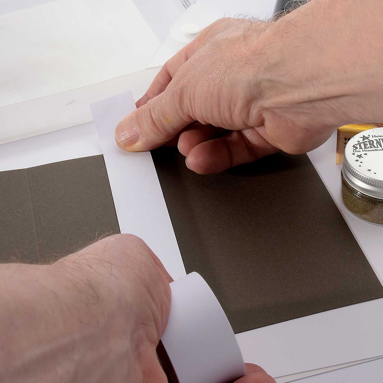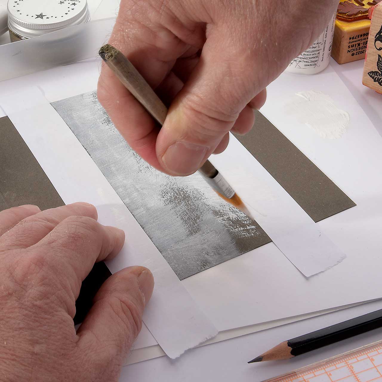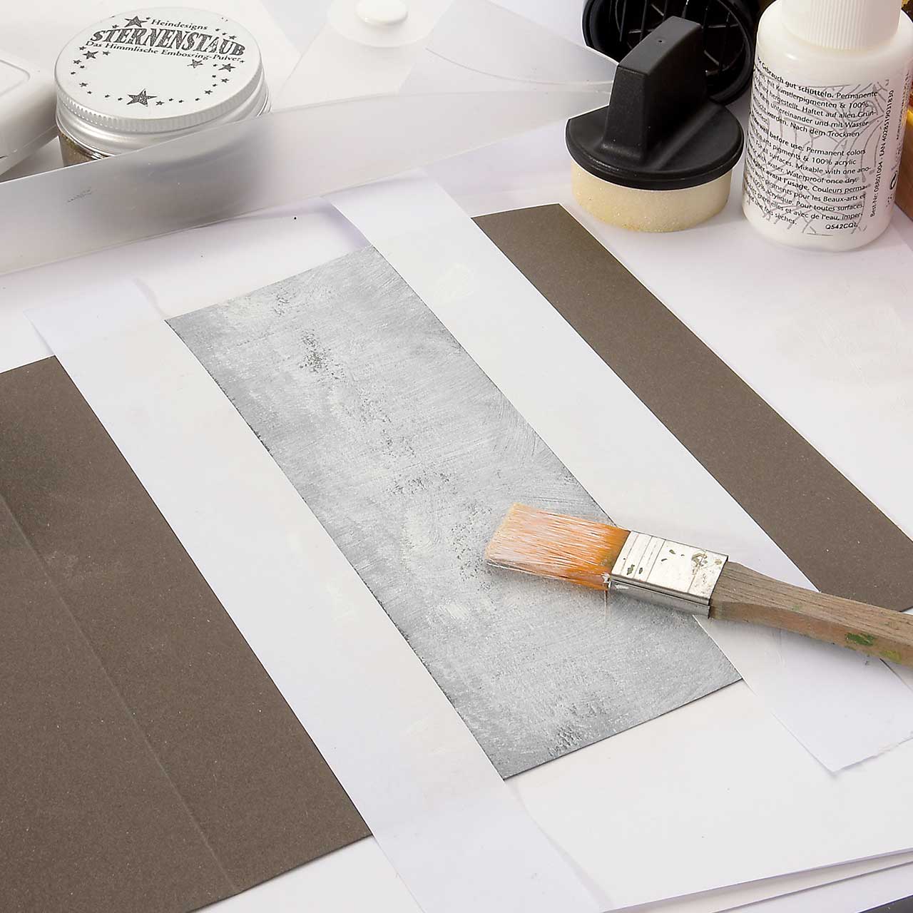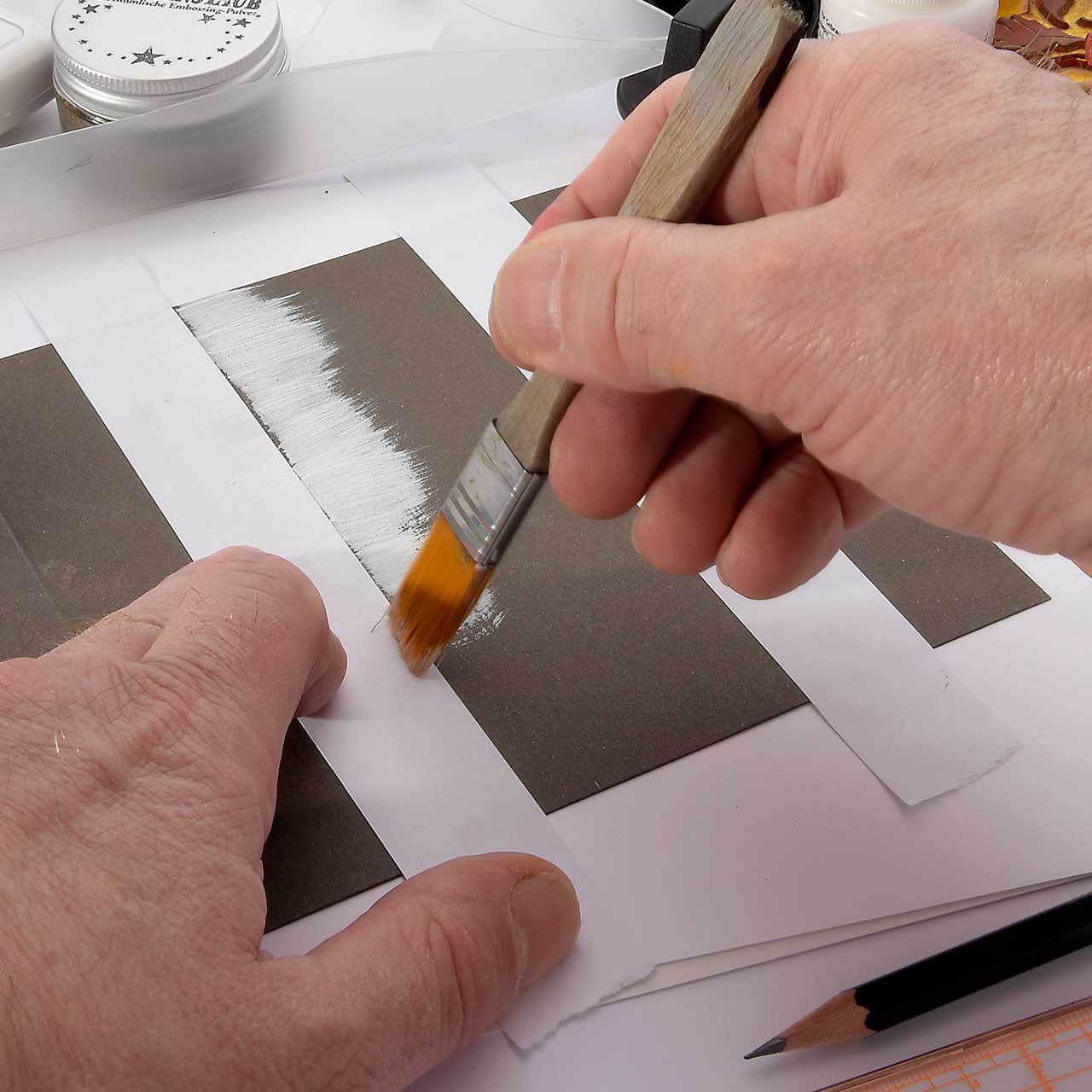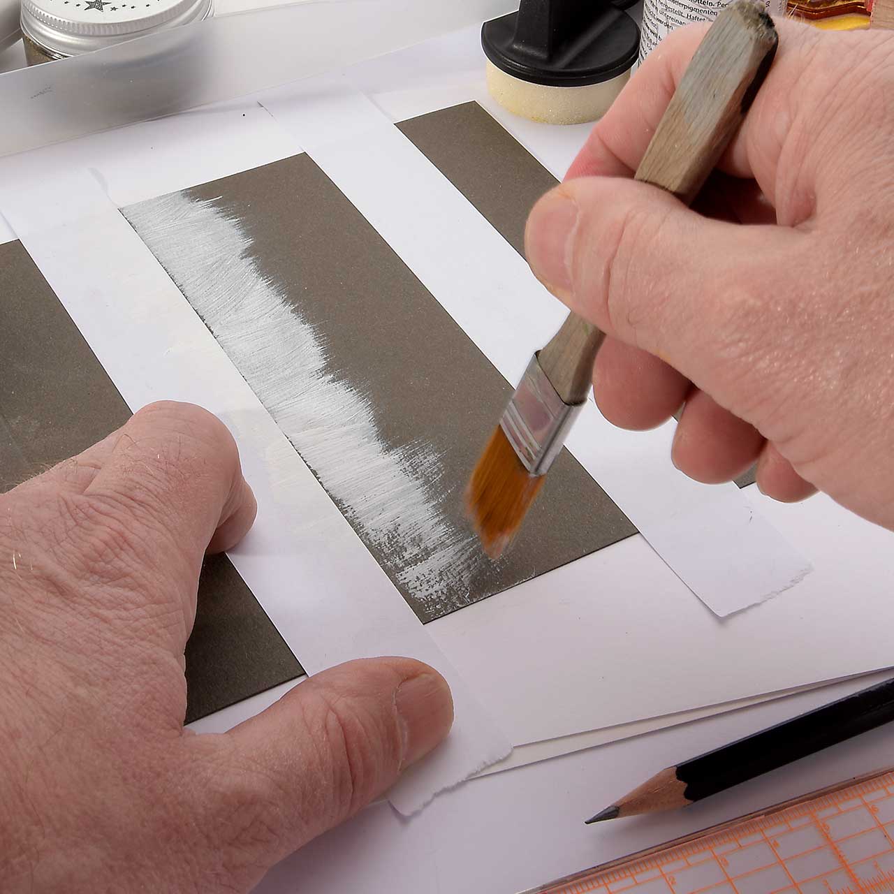 Malen Sie mit einem Flachpinsel weiße Acrylfarbe - immer vom abgeklebten Rand aus zur Mitte - auf den Streifen in der Mitte Ihrer Karte. Der Farbauftrag soll ein wenig rustikal erscheinen, daher die Farbe nicht deckend auftragen.