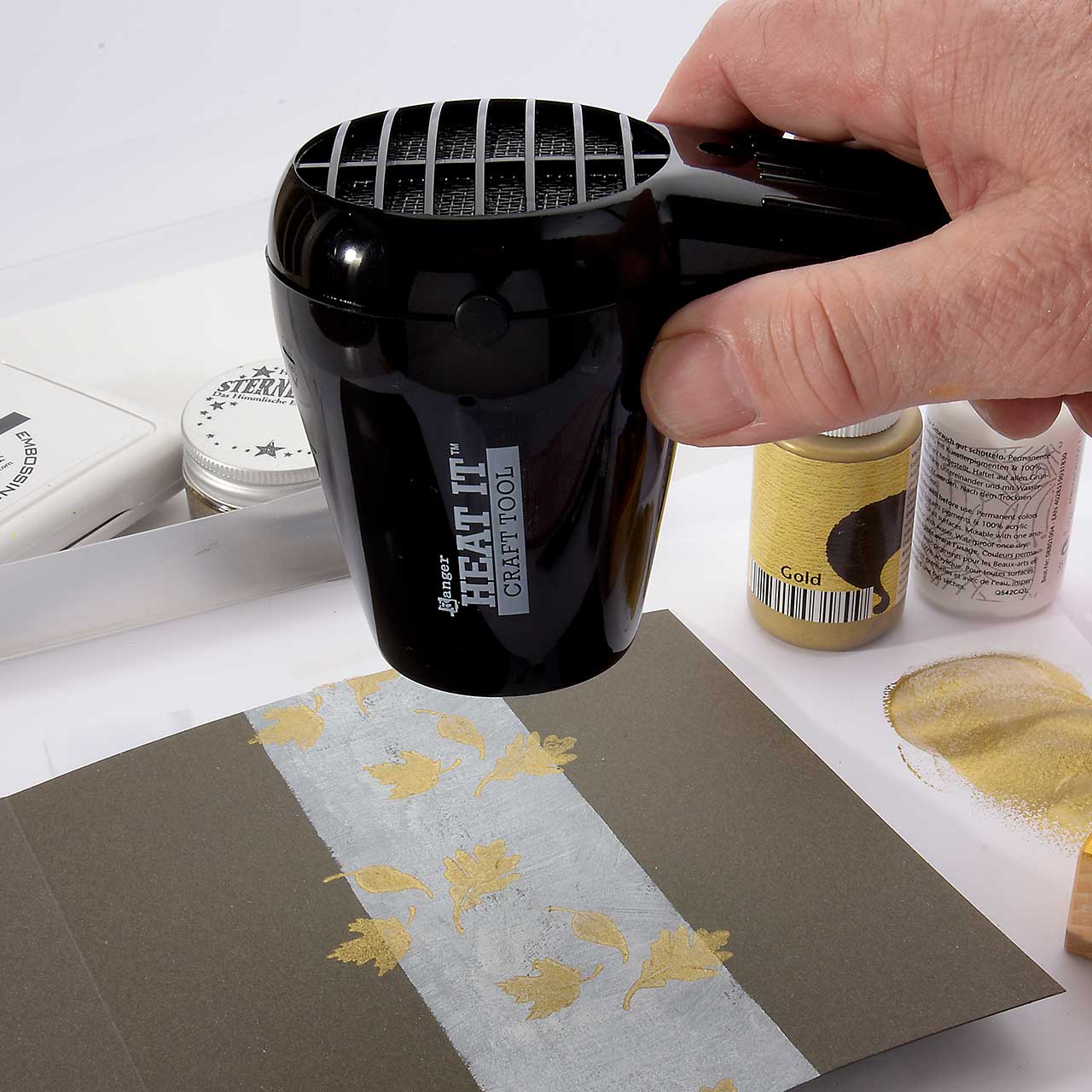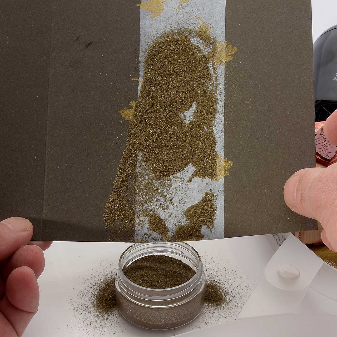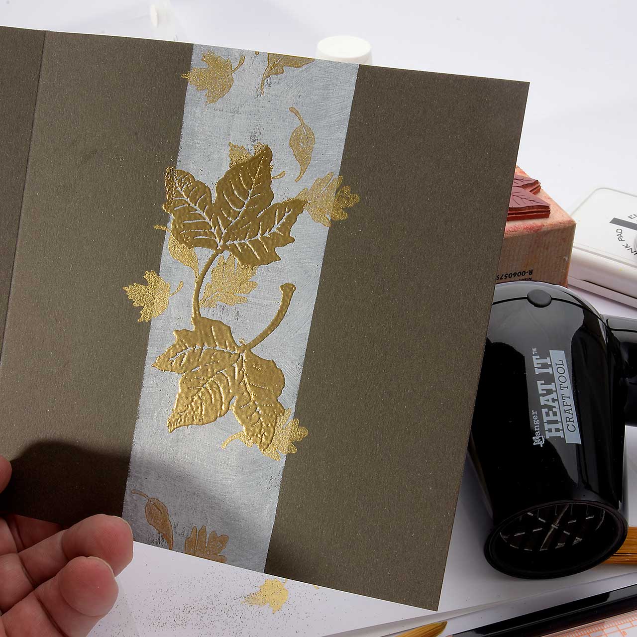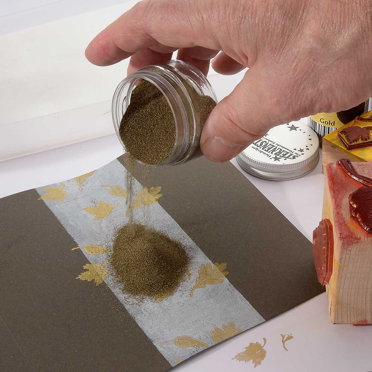 Stempeln und embossen Sie eines der Vier fallenden Blätter Motive mit dem goldenen Sternenstaub zwei mal auf Ihre Karte. (Färben Sie ihren Stempel für jeden Abdruck erneut mit dem Emboss It Stempelkissen ein. Den Sternenstaub können Sie dann auf alle gestempelten Motive gemeinsam schütten.)