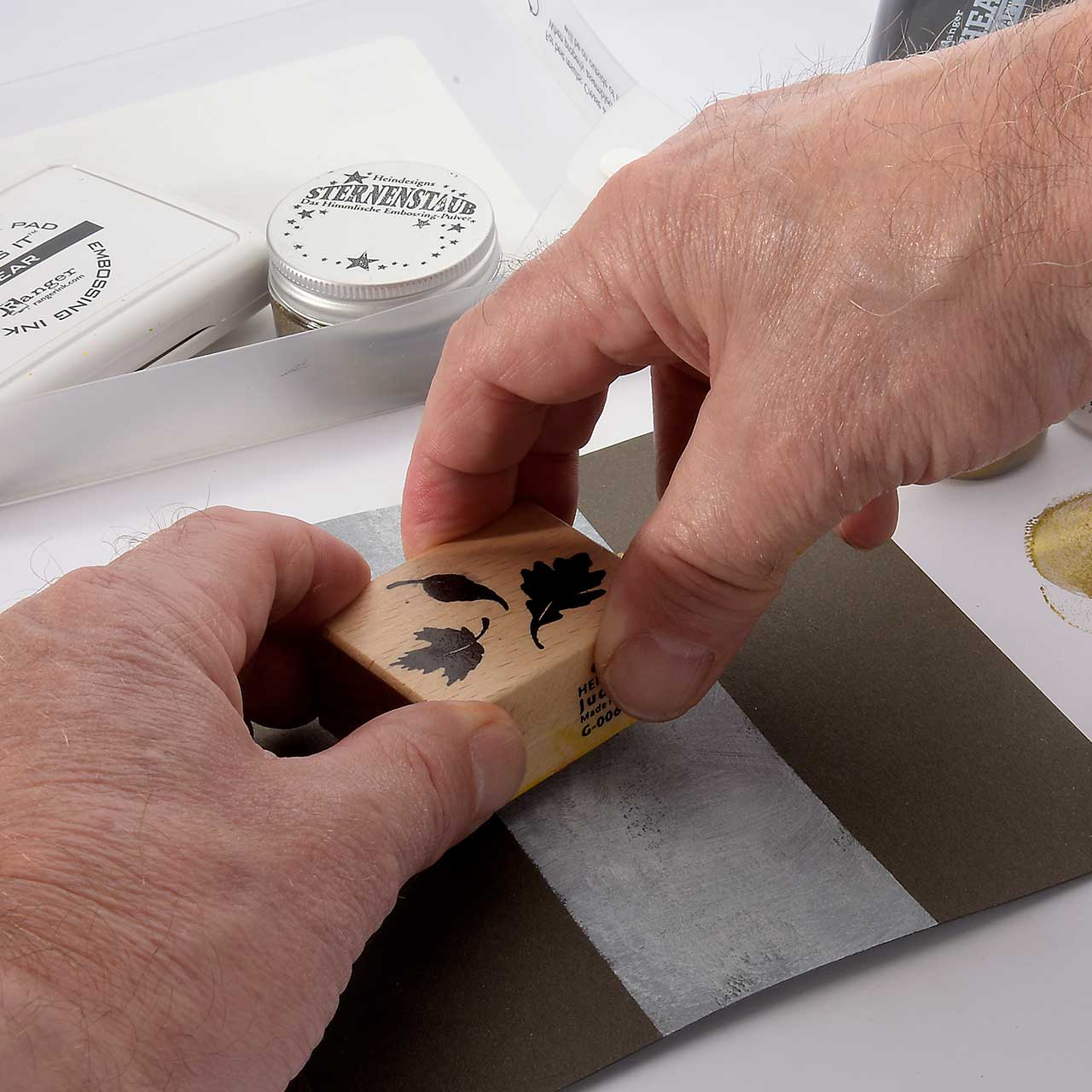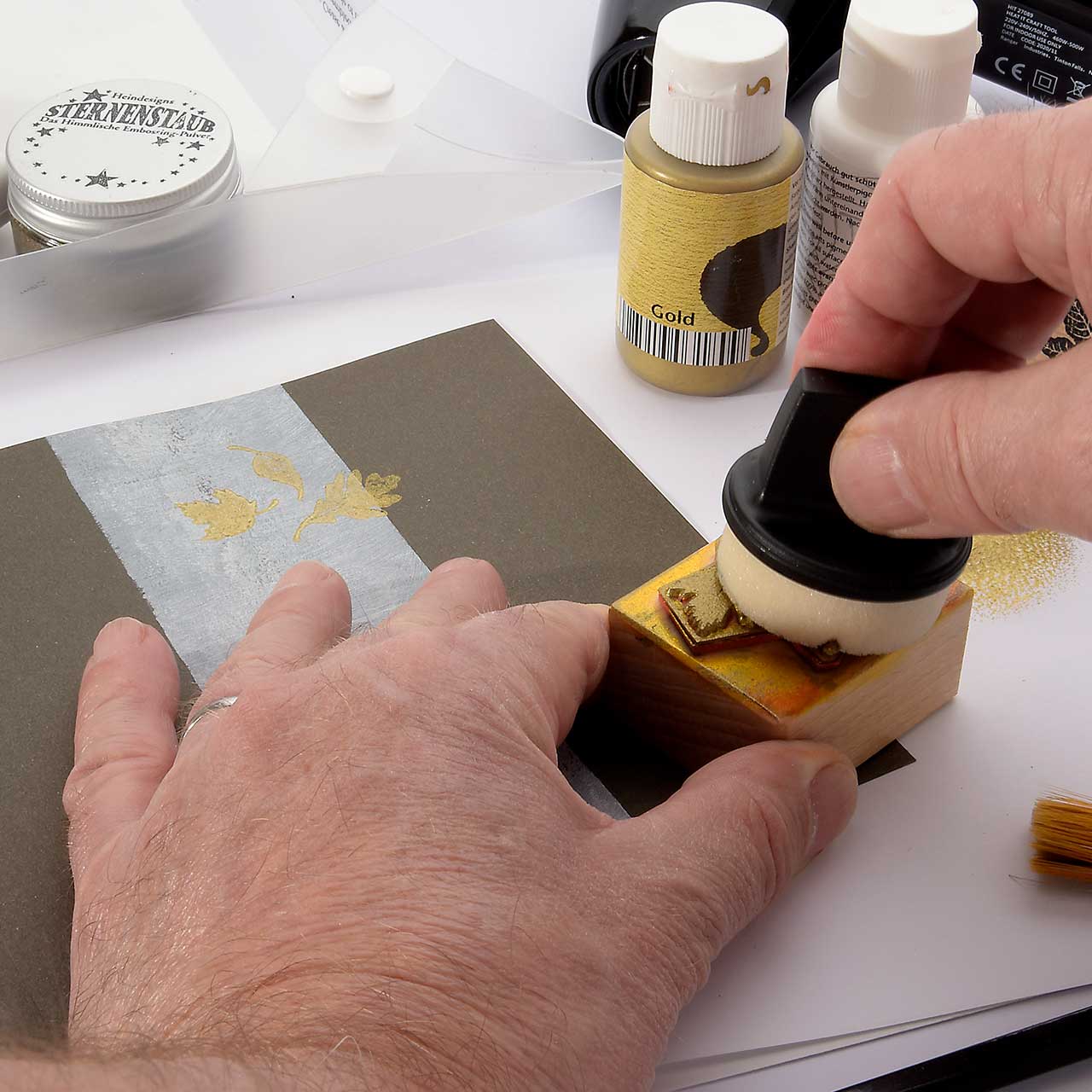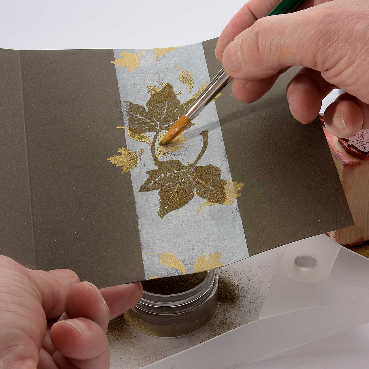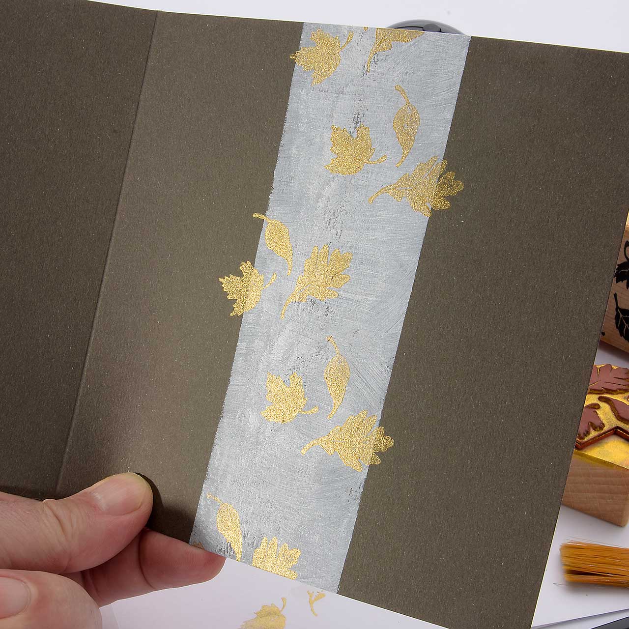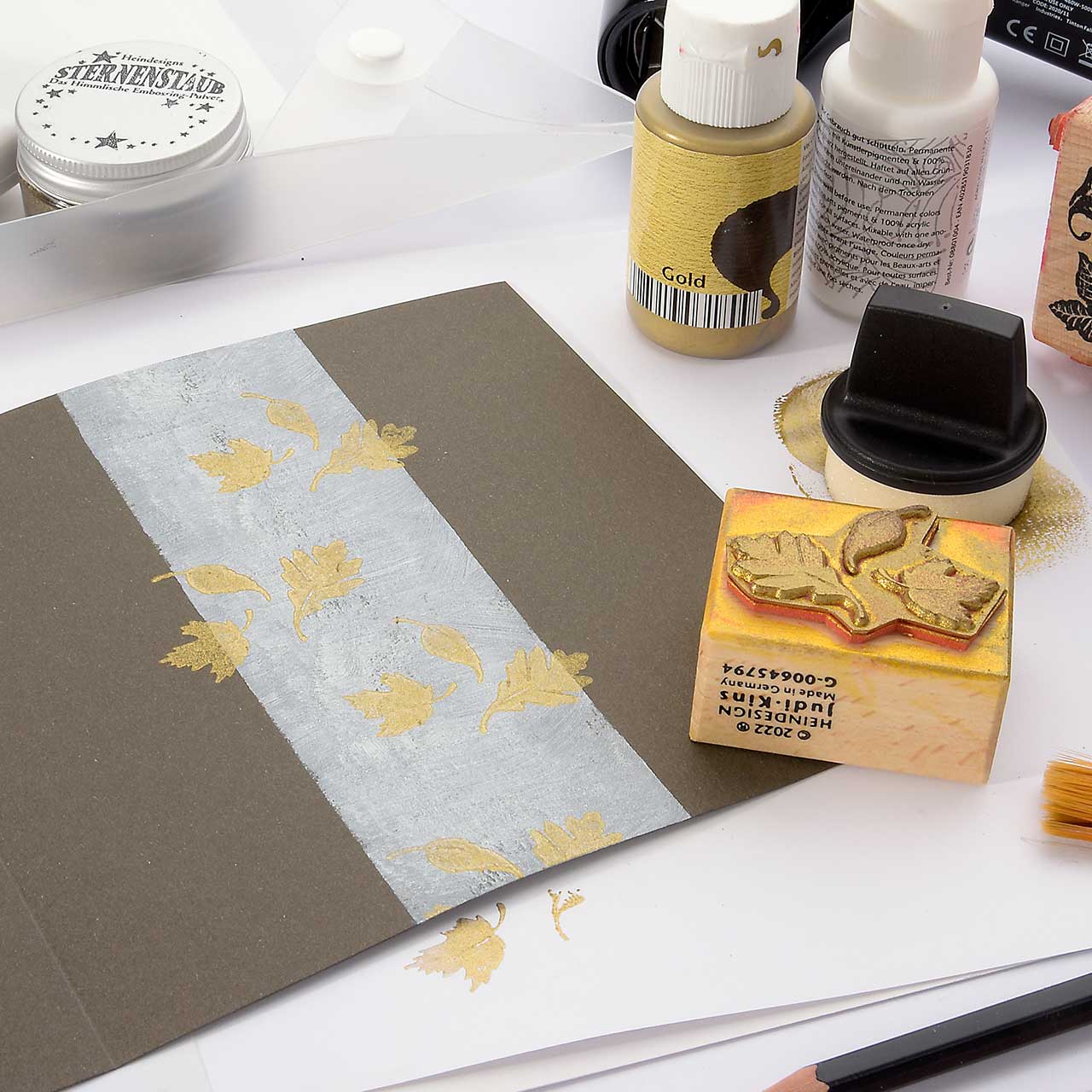 Nehmen Sie mit dem Farbtupfer Schwämmchen goldene Acrylfarbe auf und färben Sie den Fallende Blätter Stempel ein. Stempeln Sie das Motiv 3 oder 4 mal auf den weißen Streifen in der Mitte Ihrer Karte - ruhig etwas über den Rand hinaus. Für ein gleichmäßiges Druckbild färben Sie den Stempel vor jedem Abdruck erneut ein.