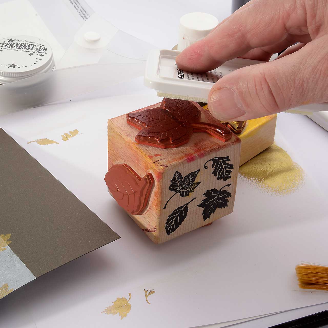 Reinigen Sie den Stempel und das Schwämmchen mit reichlich Wasser.