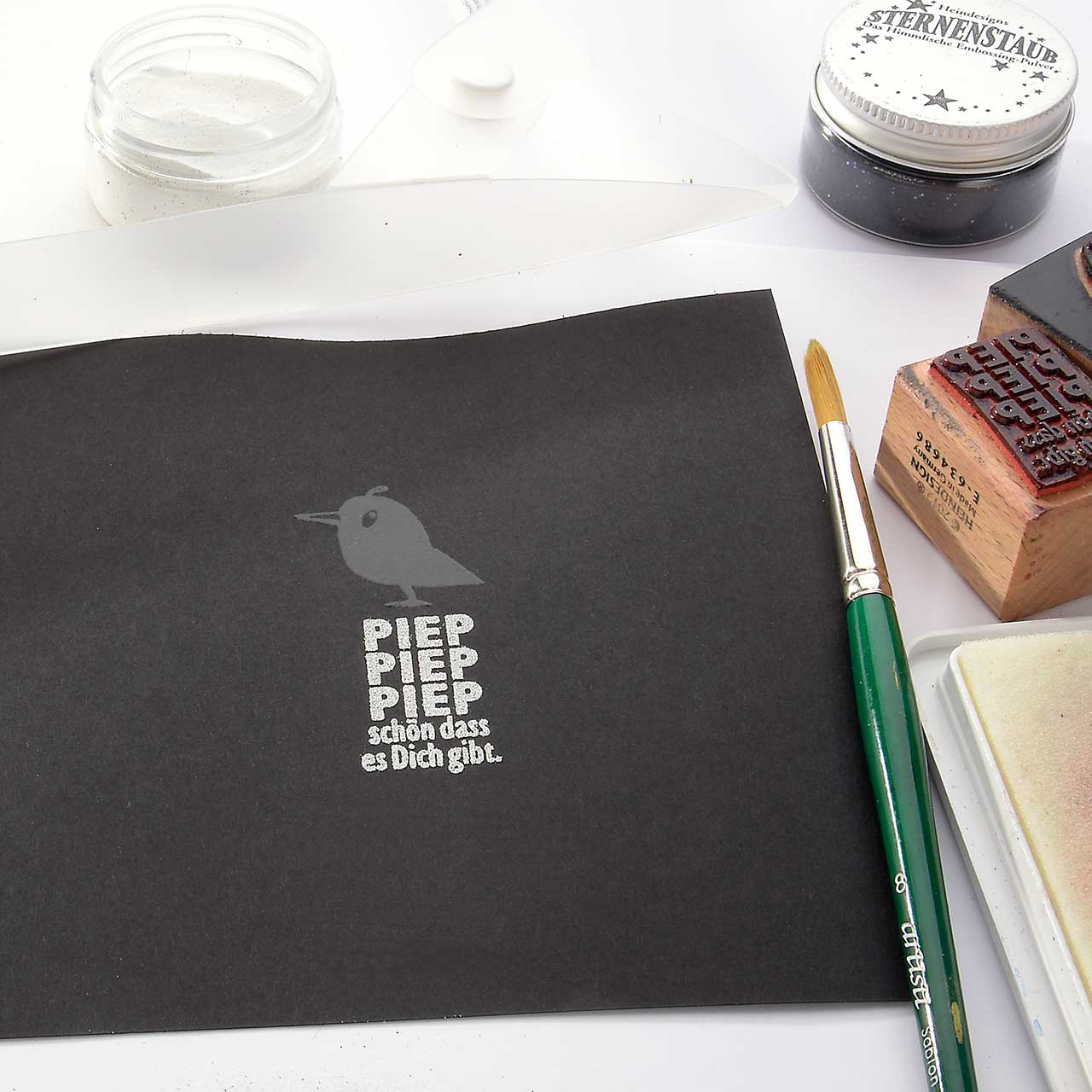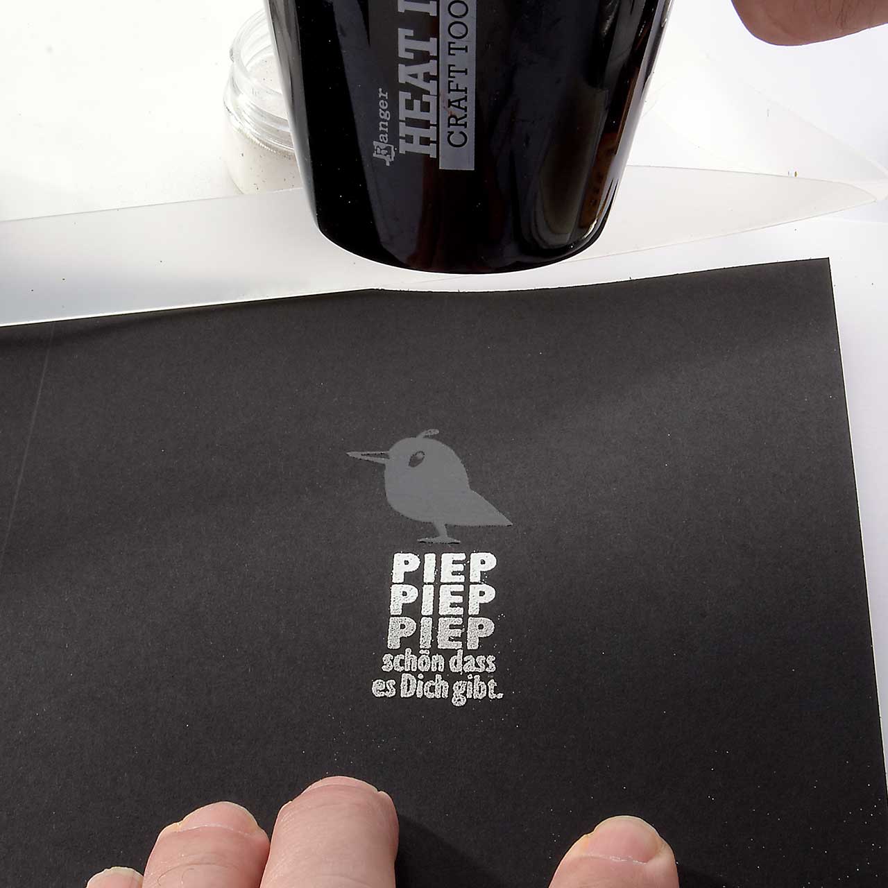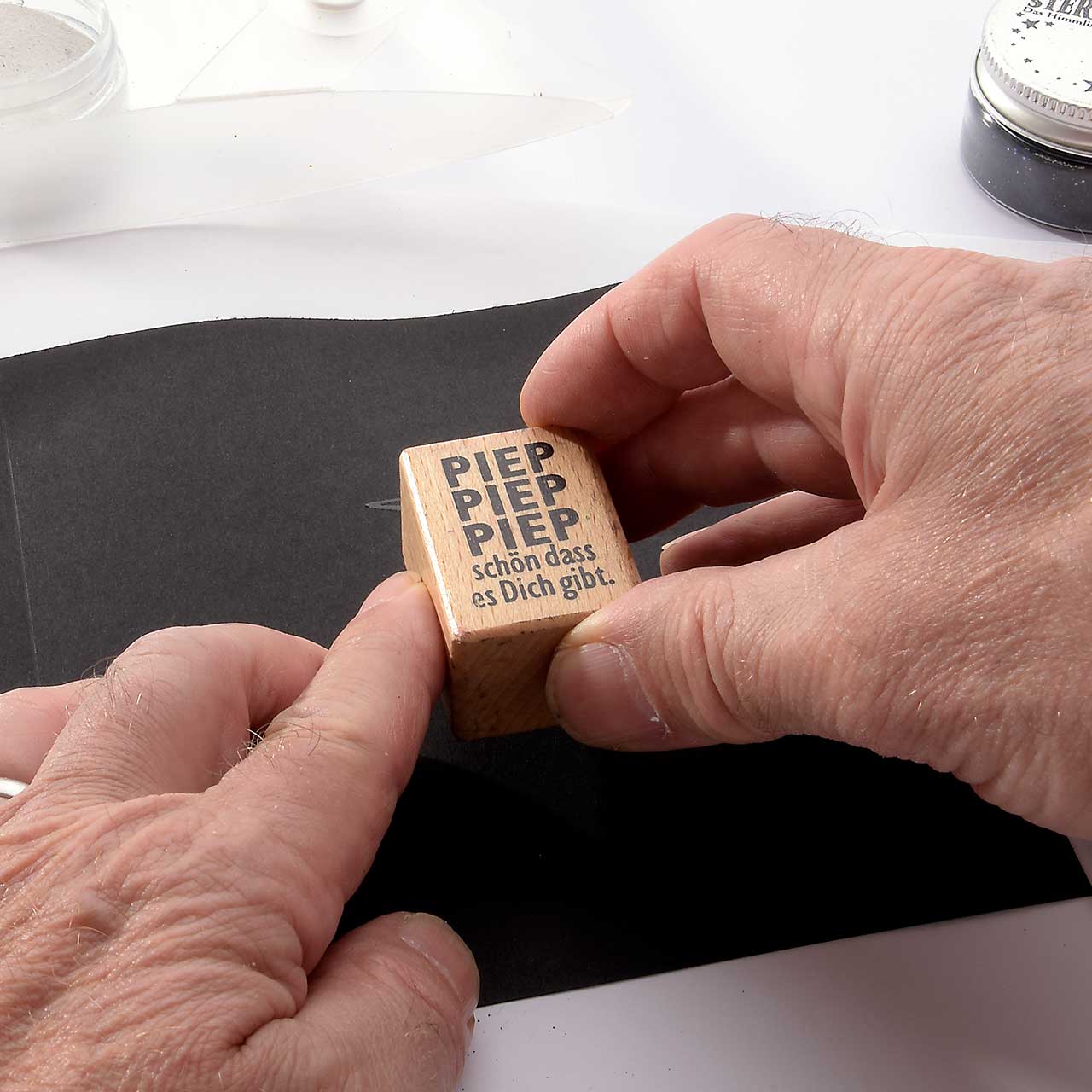 Stempeln und Embossen Sie das „Piep Piep Piep ...“ Textmotiv mit dem weißen Sternenstaub unterhalb des Vogel Motivs in die Mitte Ihrer Karte.