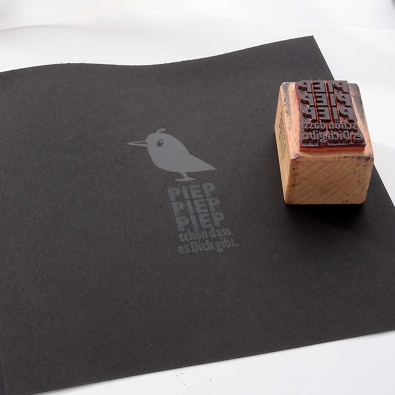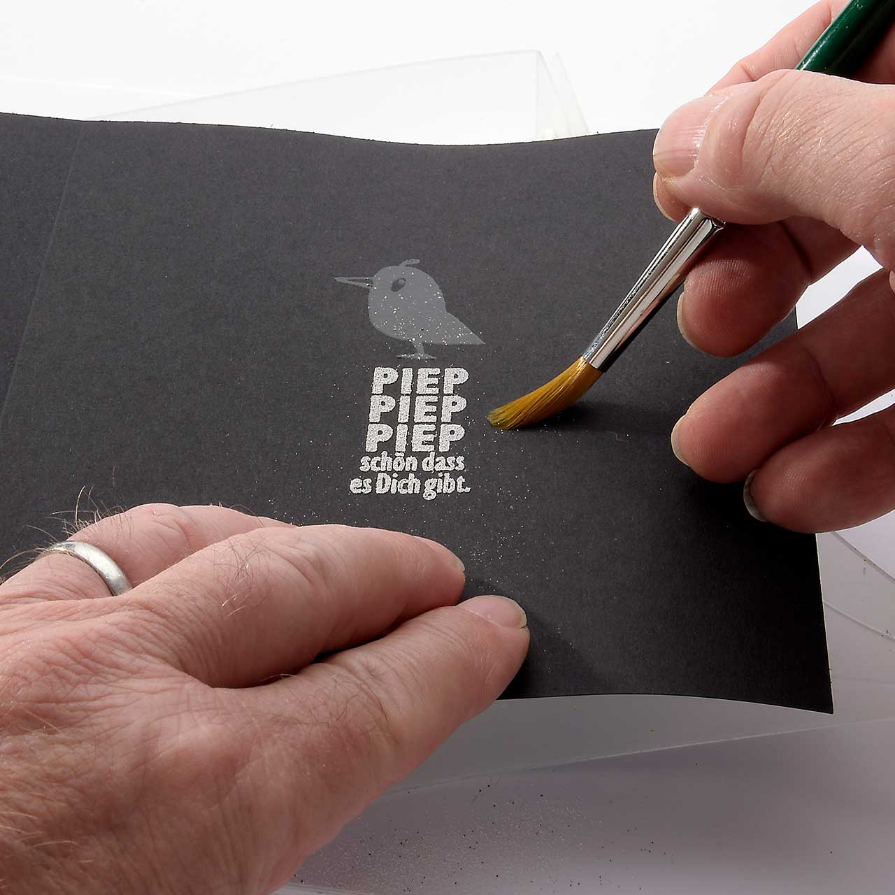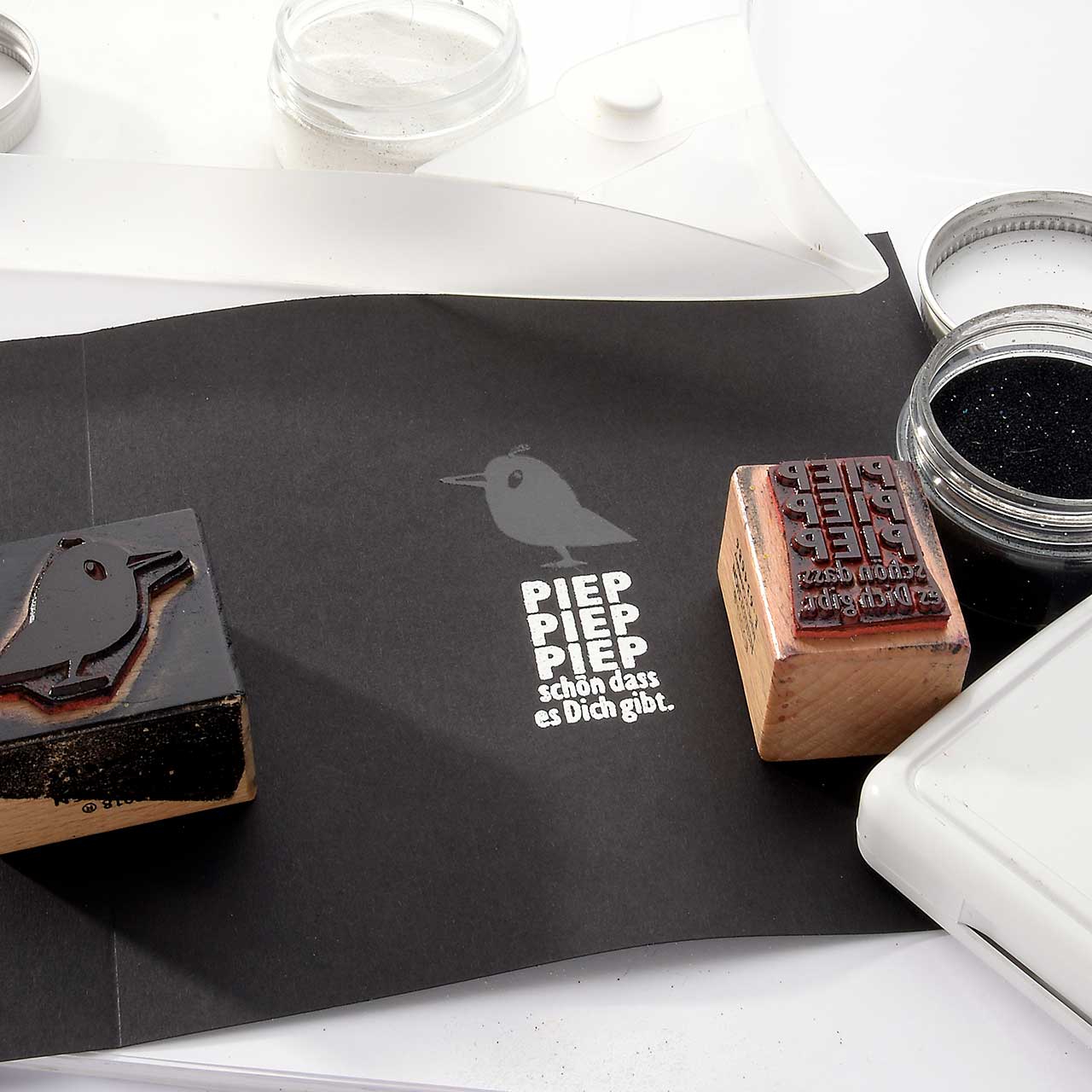 Stempeln und Embossen Sie das „Piep Piep Piep ...“ Textmotiv mit dem weißen Sternenstaub unterhalb des Vogel Motivs in die Mitte Ihrer Karte.
