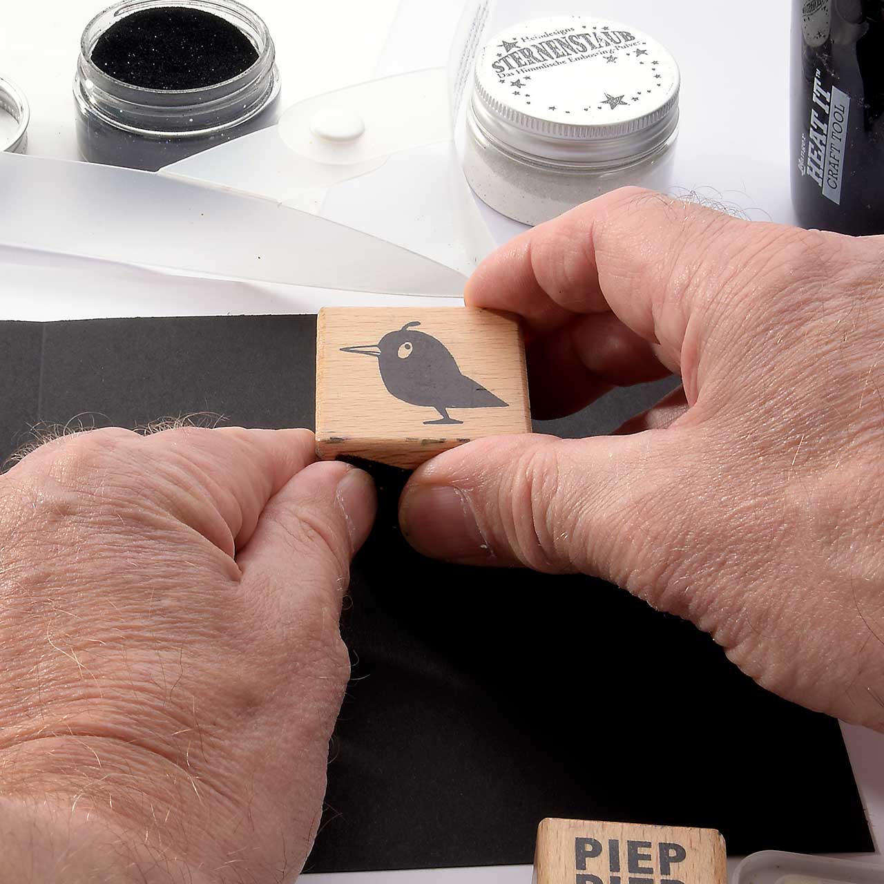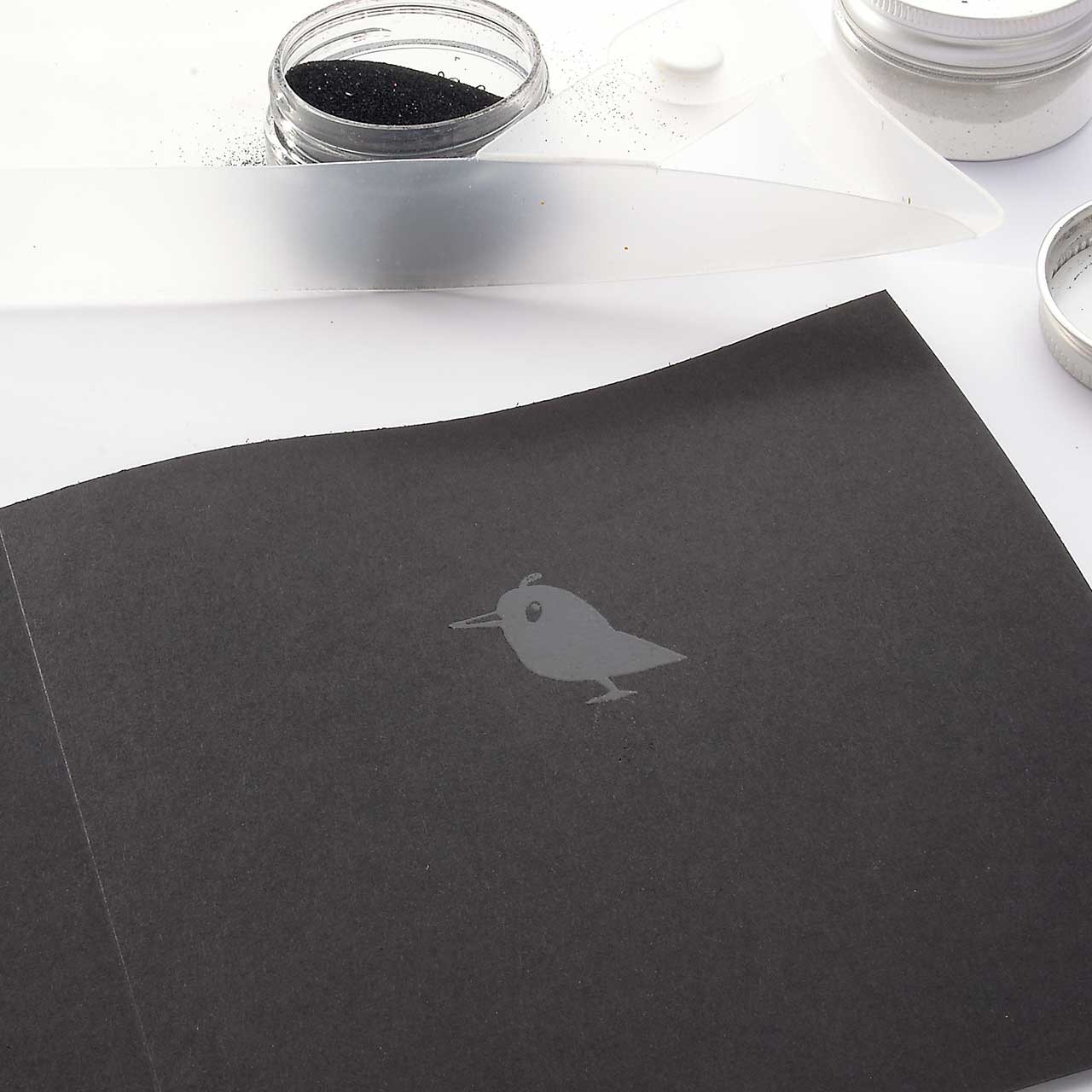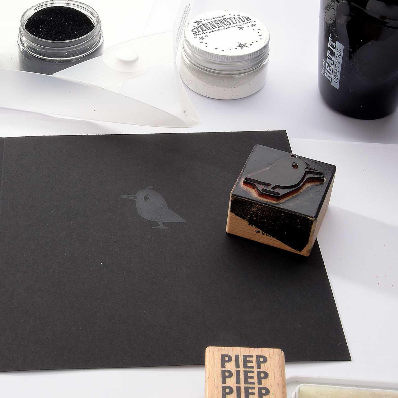 Stempeln und Embossen Sie das Vogel Motiv mit dem schwarzen Sternenstaub in die obere Mitte Ihrer Karte.
