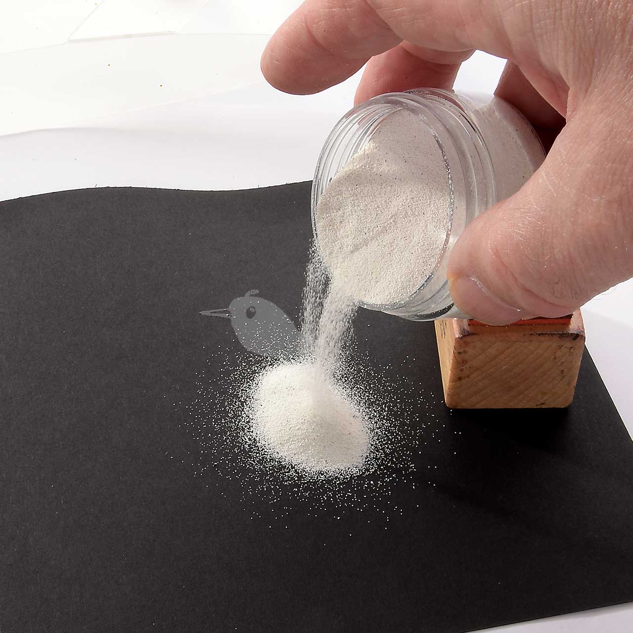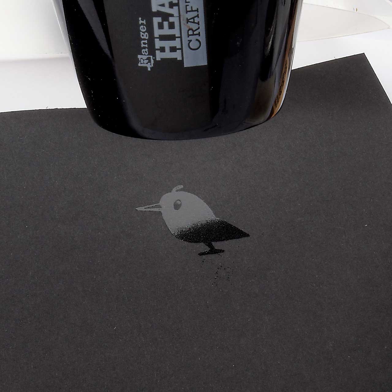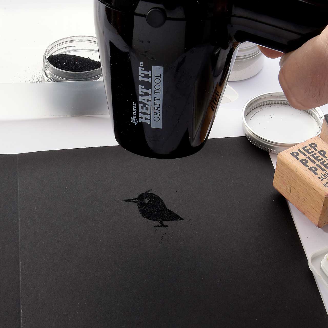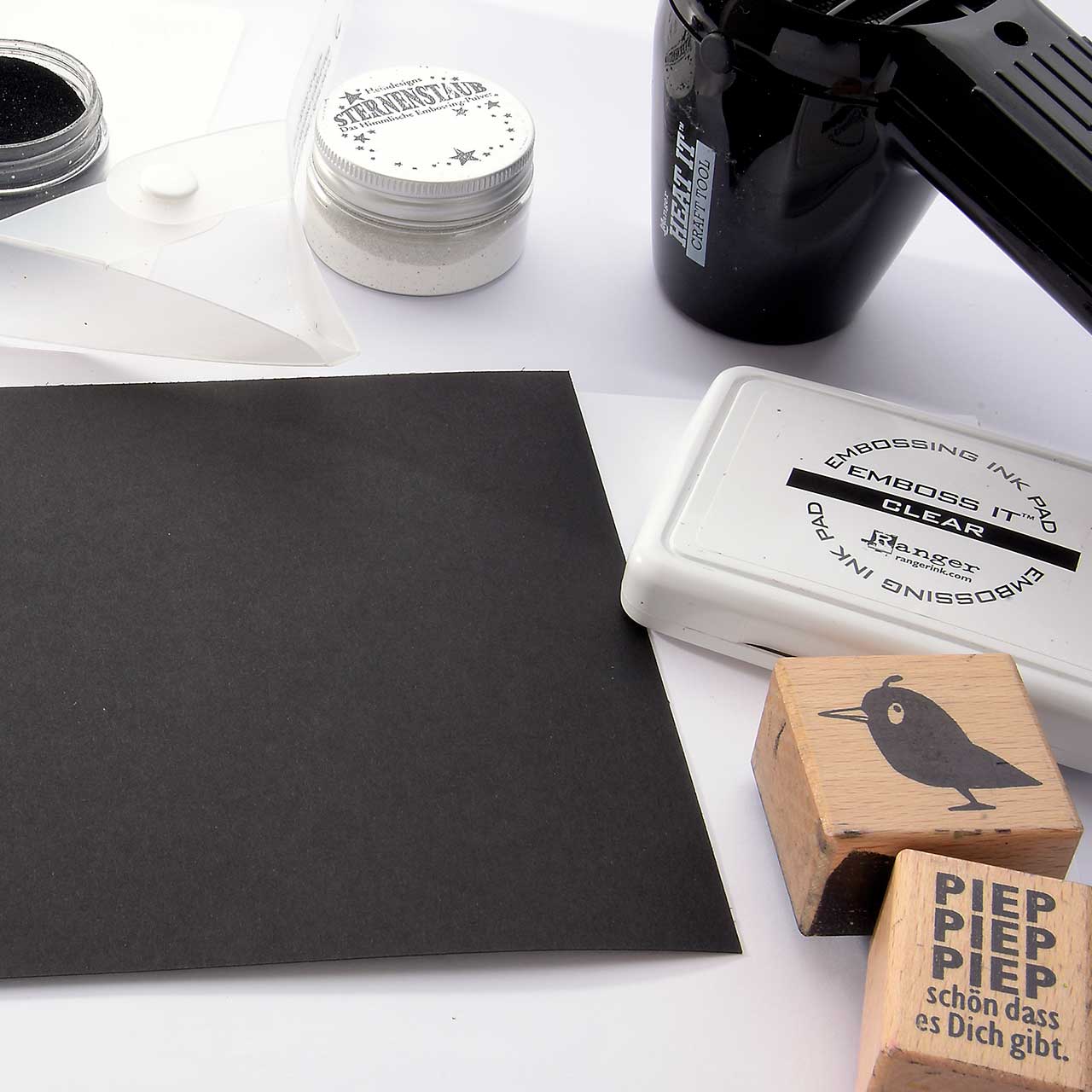 Stempeln und Embossen Sie das Vogel Motiv mit dem schwarzen Sternenstaub in die obere Mitte Ihrer Karte.