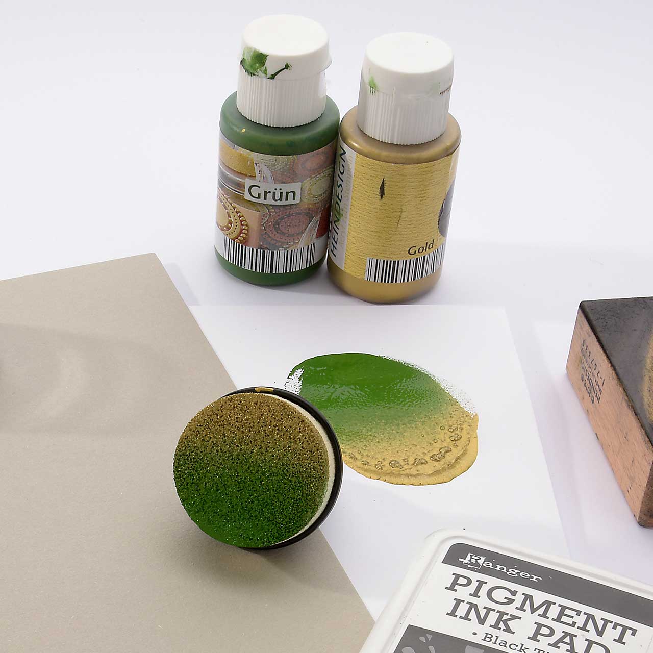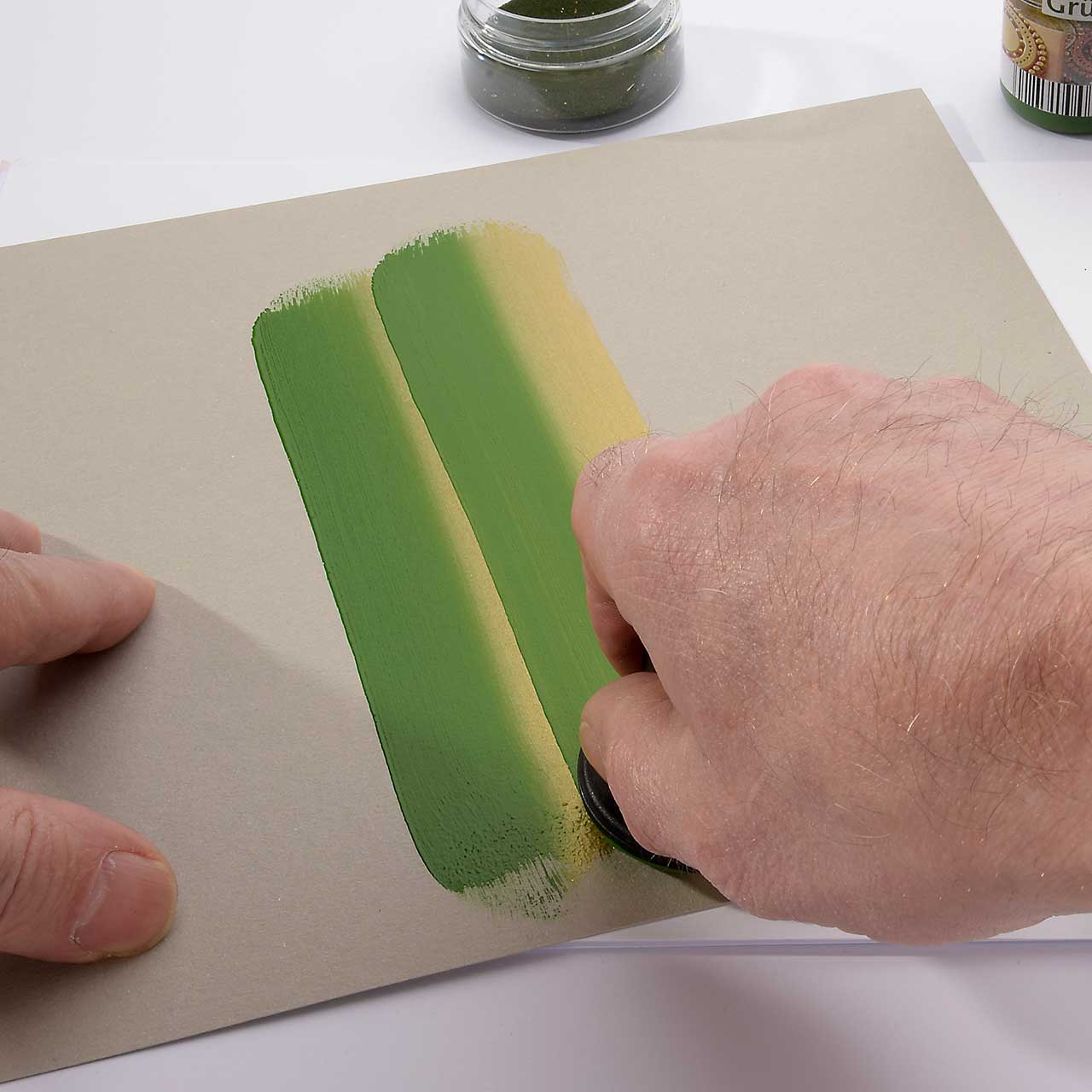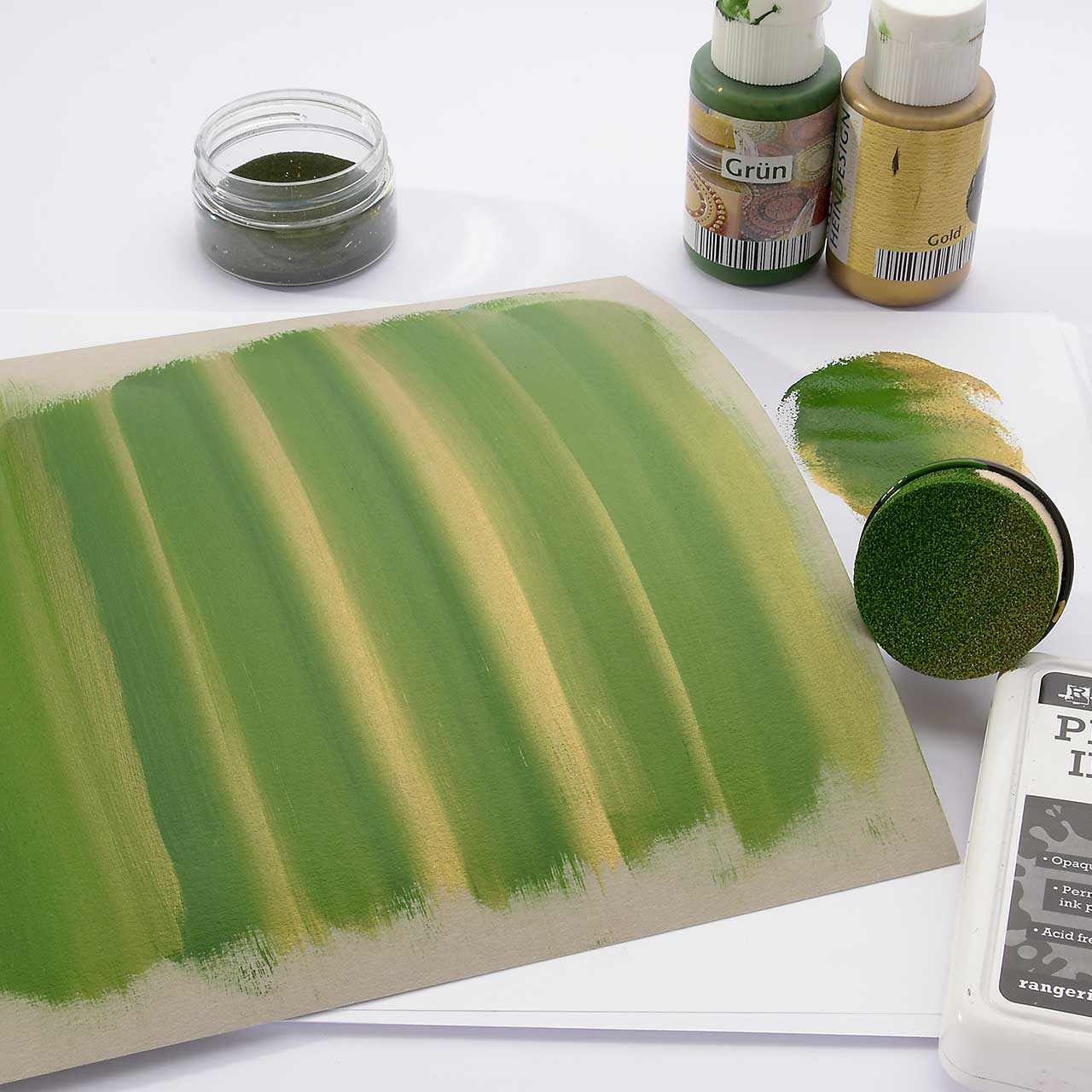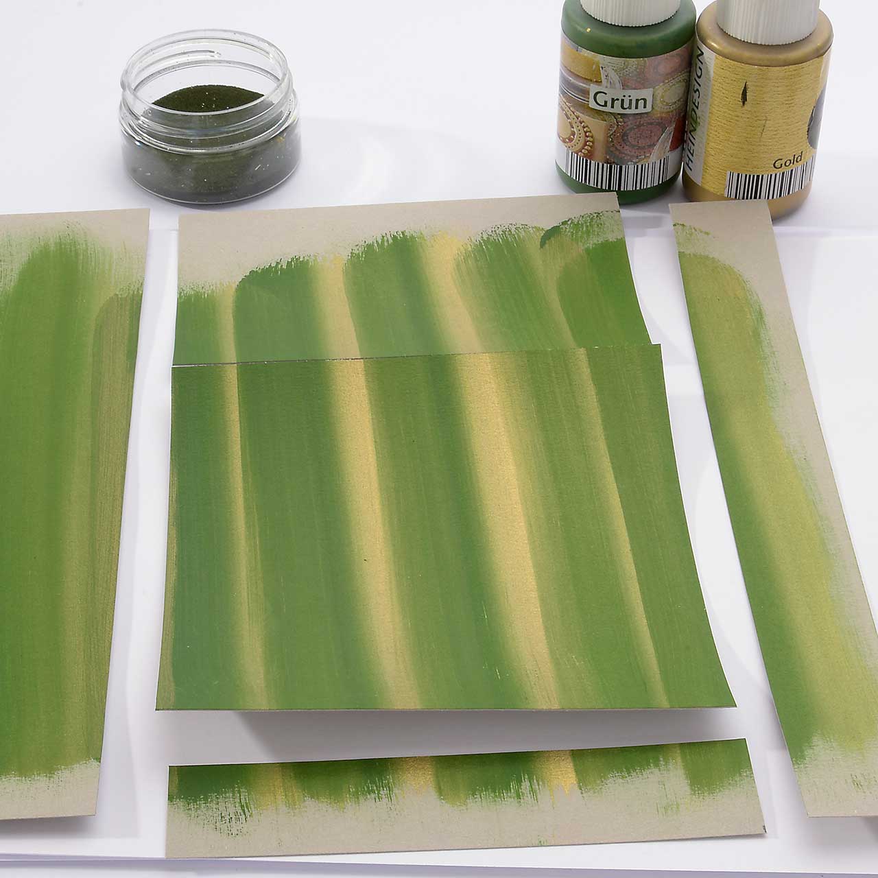 Nehmen Sie mit dem Farbtupfer Schwämmchen goldene und grüne Acrylfarbe auf. Ziehen Sie mit dem Schwämmchen mehrere gold-grüne Streifen über Ihren Amadeo Kartenkarton (Sie benötigen für eine 7 x 7 cm Schachtel, eine Fläche von etwa 12 x 12 cm).
