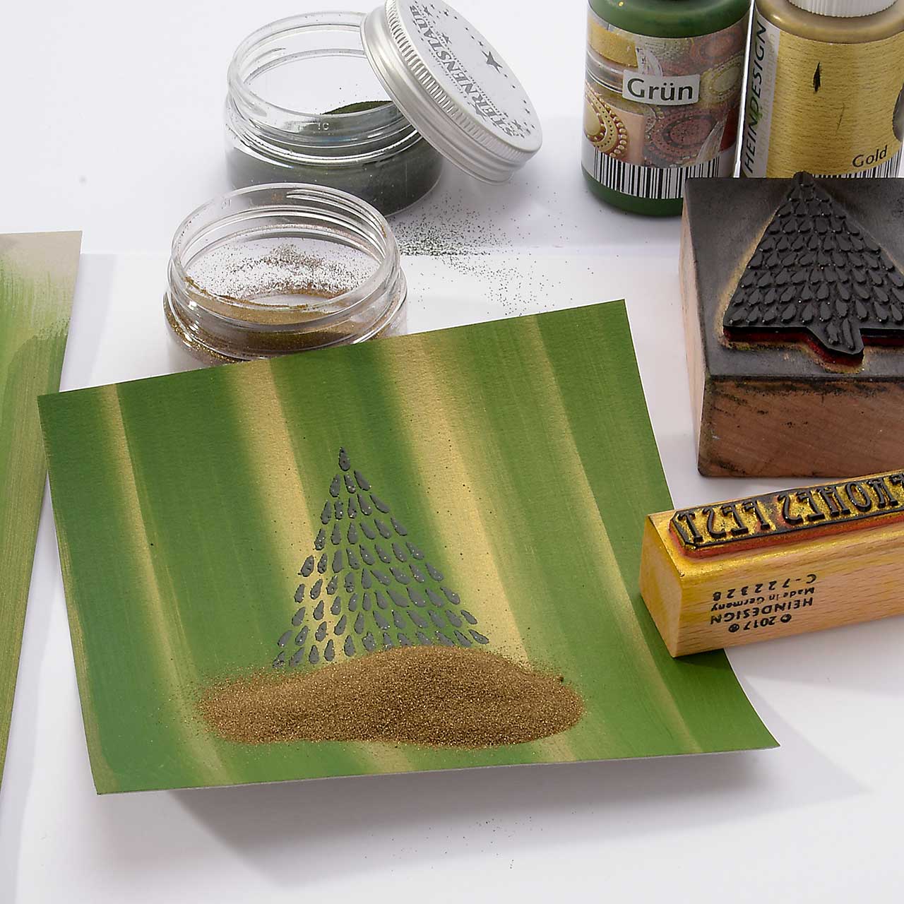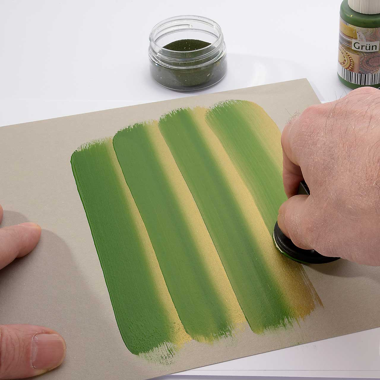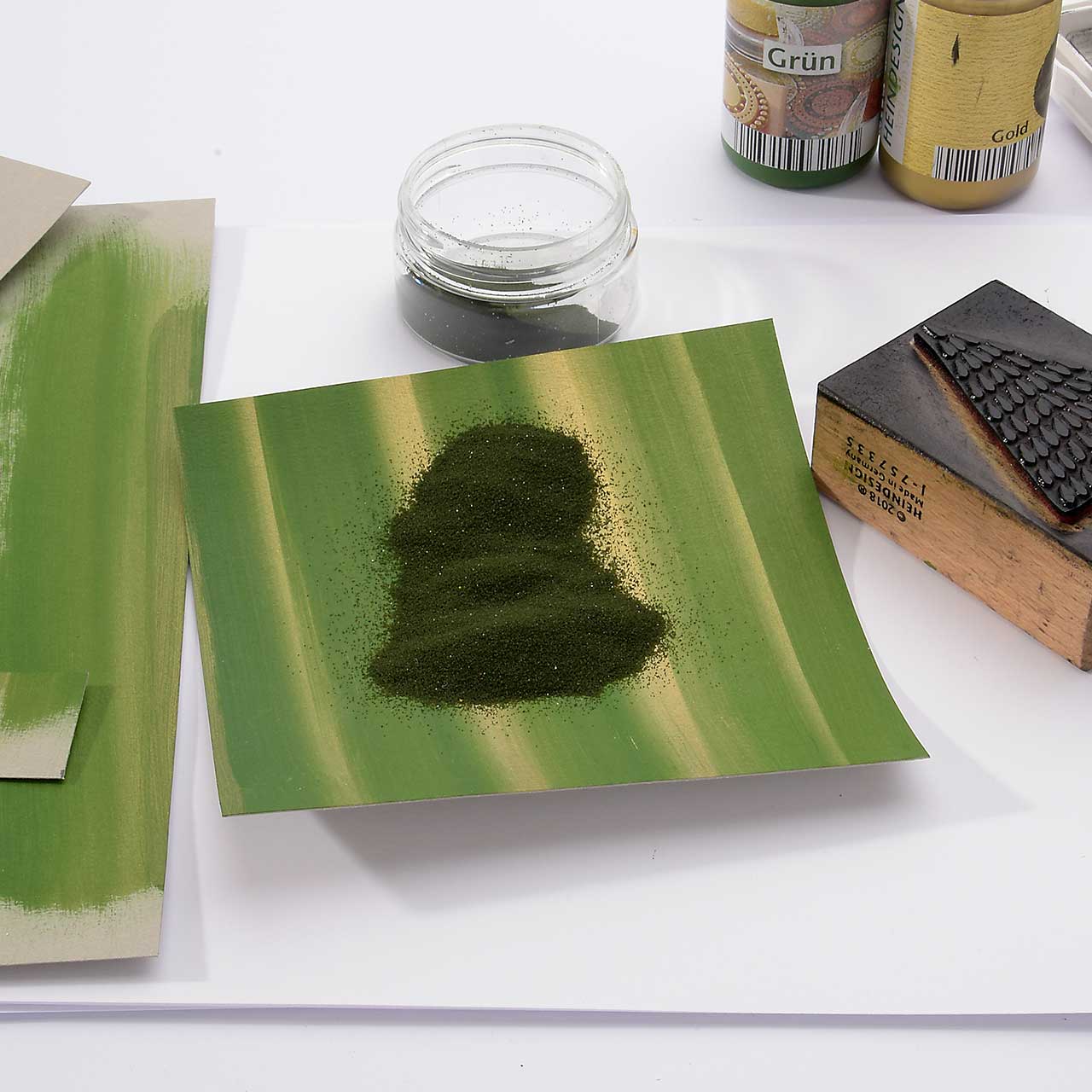Nehmen Sie mit dem Farbtupfer Schwämmchen goldene und grüne Acrylfarbe auf. Ziehen Sie mit dem Schwämmchen mehrere gold-grüne Streifen über Ihren Amadeo Kartenkarton (Sie benötigen für eine 7 x 7 cm Schachtel, eine Fläche von etwa 12 x 12 cm).